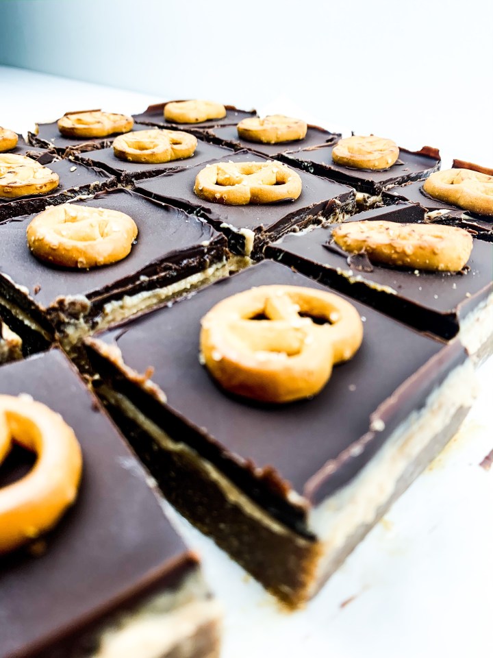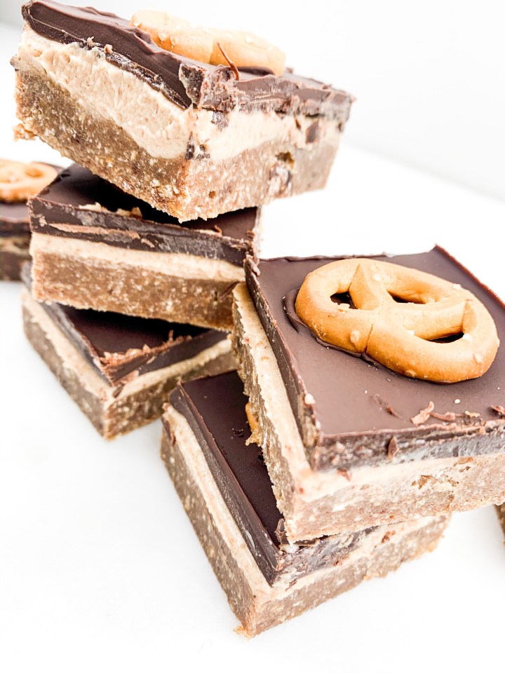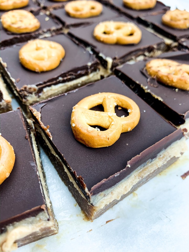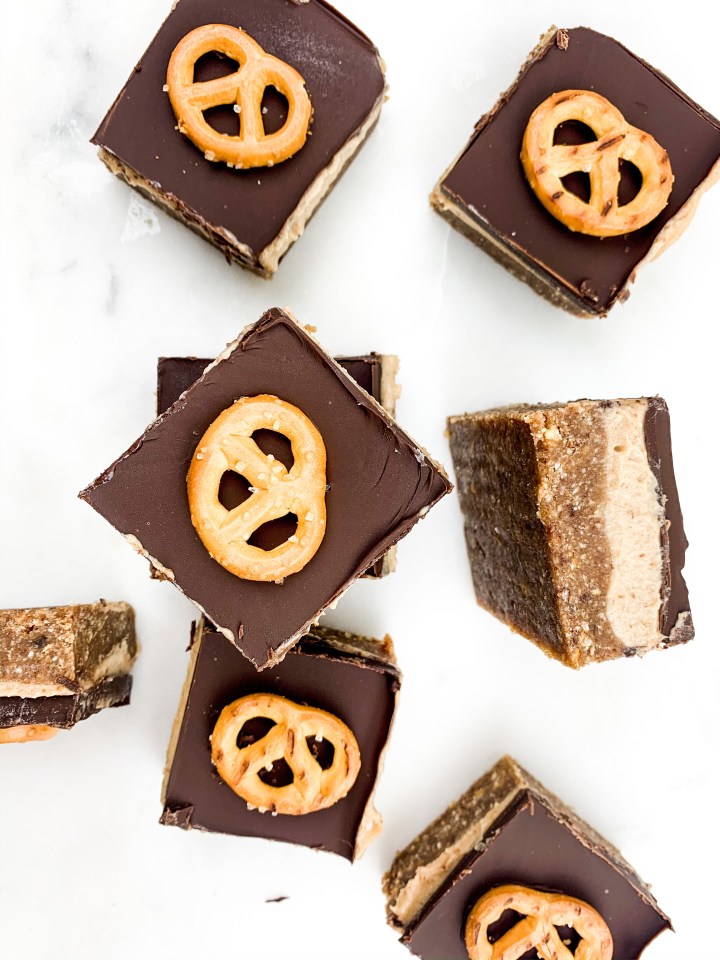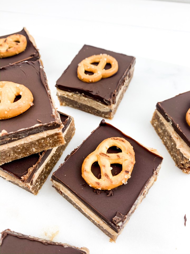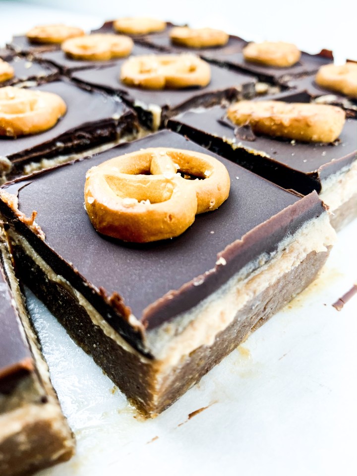 - Melt the chocolate: In a large microwave-safe bowl, in 20-30 second increments, stirring in between as needed. Then add the coconut oil, and stir until melted; stir again before pouring on chilled bars. Top with mini pretzels + sea salt, as desired. Cool in the fridge for 30-40 minutes before cutting into squares.