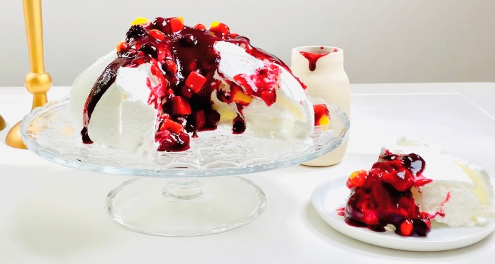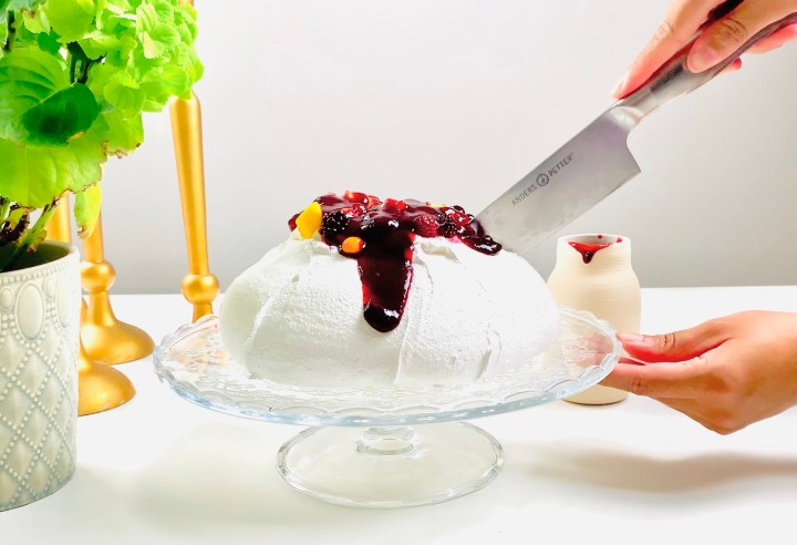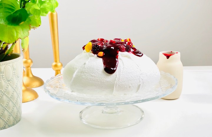 Reduce oven temperature to 120C and place pavlova in the oven on the middle shelf.