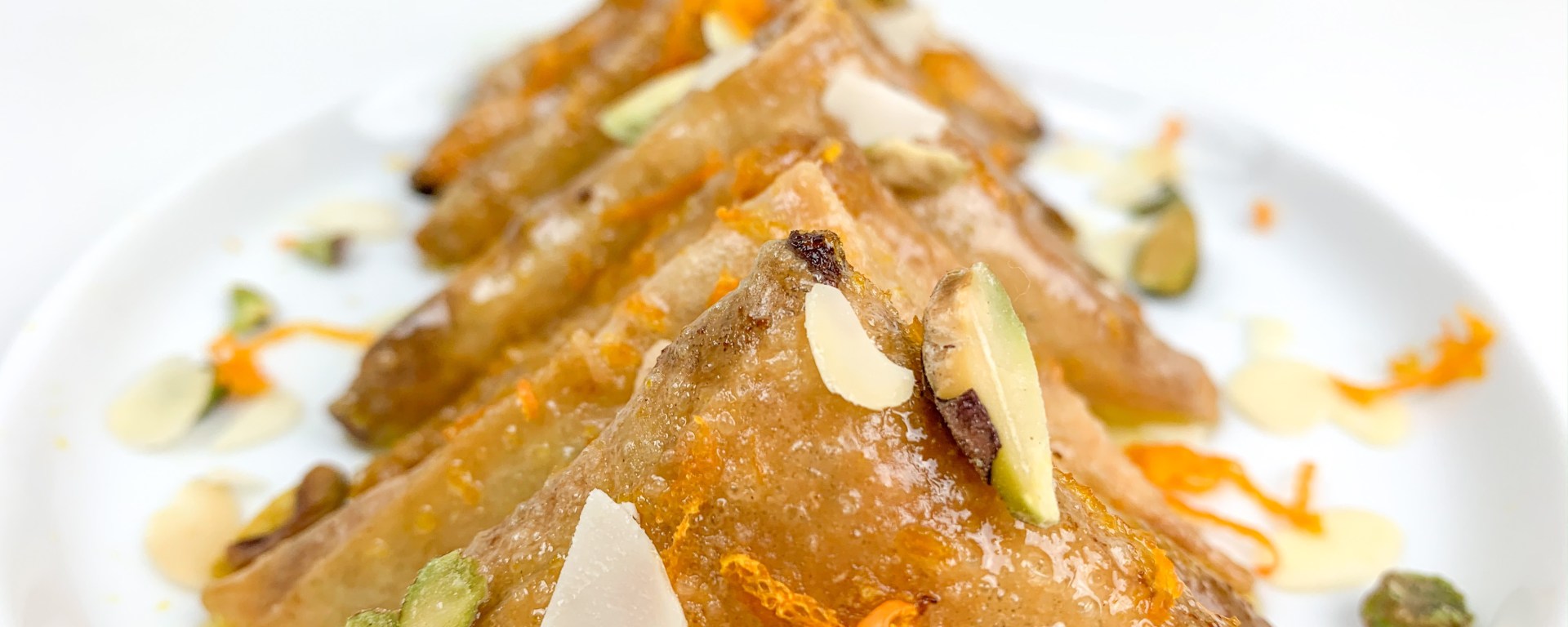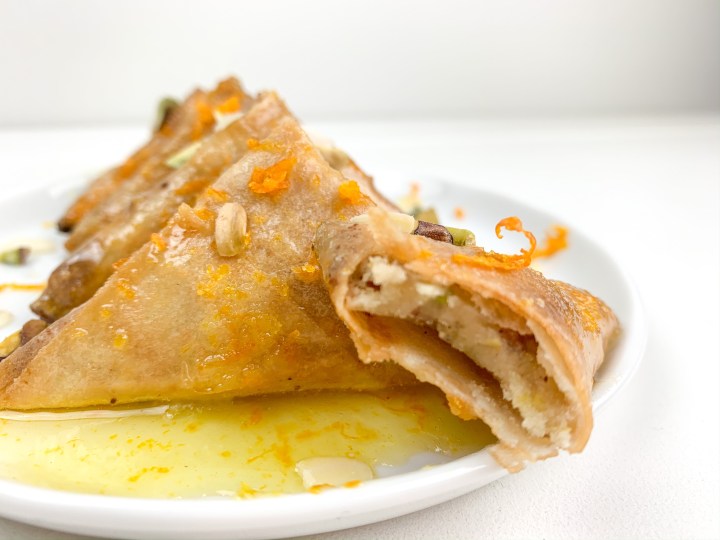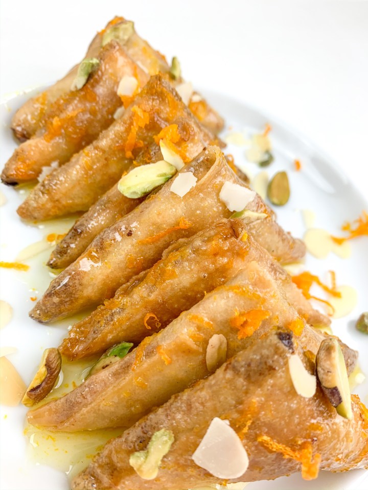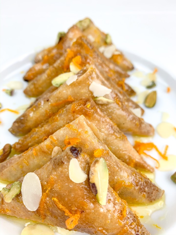 - Put the orange juice, water, orange zest and sugar into a small sauce pan. Bring to a boil, and let the sugar dissolve. Then reduce the temperature and let simmer for 7 min. Once the syrup is thick enough that is coats the back of a spoon, then pour it over your sweet samosas.