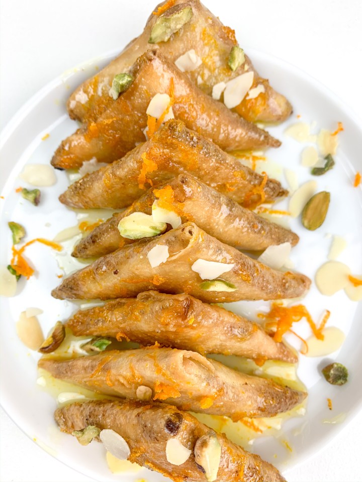 Samosa is an Asia Pacific savoury treat. its usually eaten as a starter, and is filled with potato, mince meat or mince chicken. In Pakistan (my ethnic background) they also serve a sweet version of this savoury treat. But with a thick milk based ingredient called ‘khoya’. Now you can make khoya at home (which is time consuming) or you can buy it from the store (not at your usual grocery store though). As I live in Sweden, and Khoya isn’t as easy to come by as it would be abroad, I’ve decided to add a bit of a Swedish twist to the sweet samosa by adding almond paste. This is a delicious tiny dessert, and is great for an evening snack or with a cup of coffee or tea. Its very simple to make and tastes delicious!