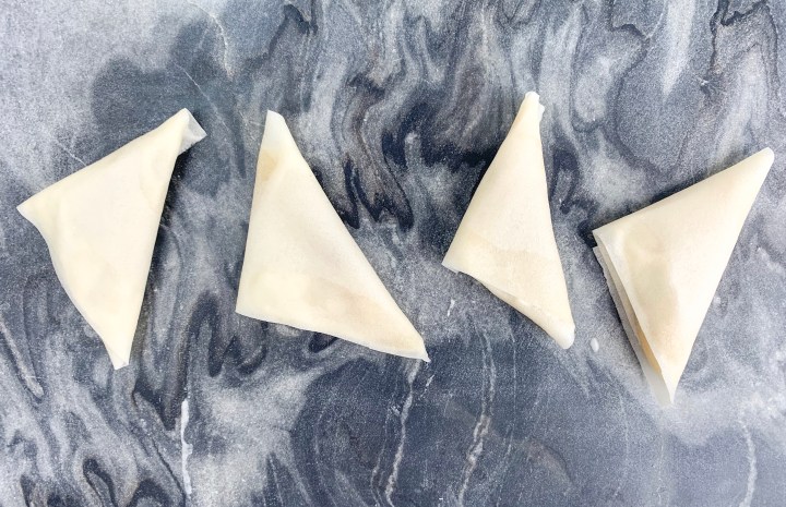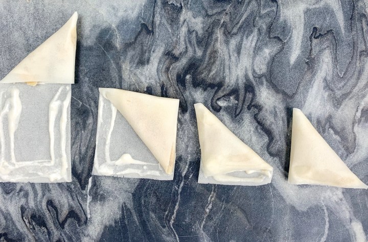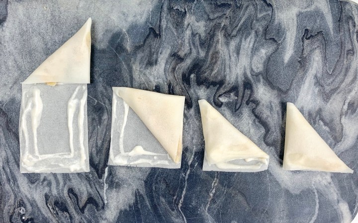 - Take a little of the flour paste, and run it along the edges of the pastry sheet. then continue folding in the same motion until you reach the end and all sides are sealed. Repeat this until no more filling is left. (See image below)