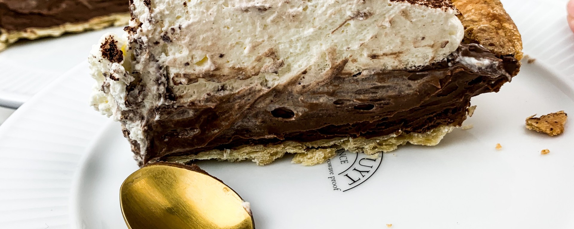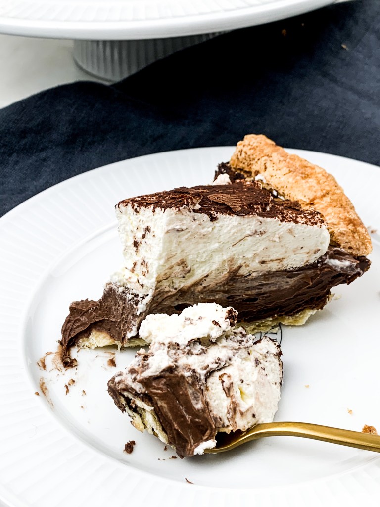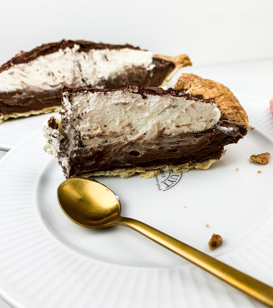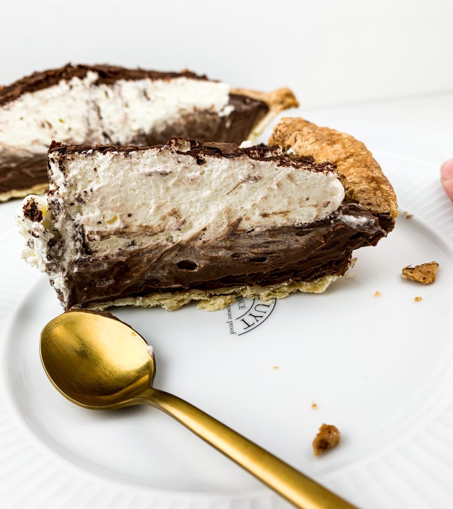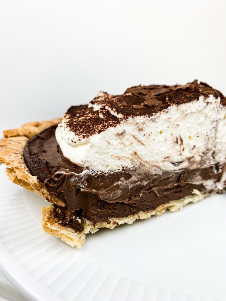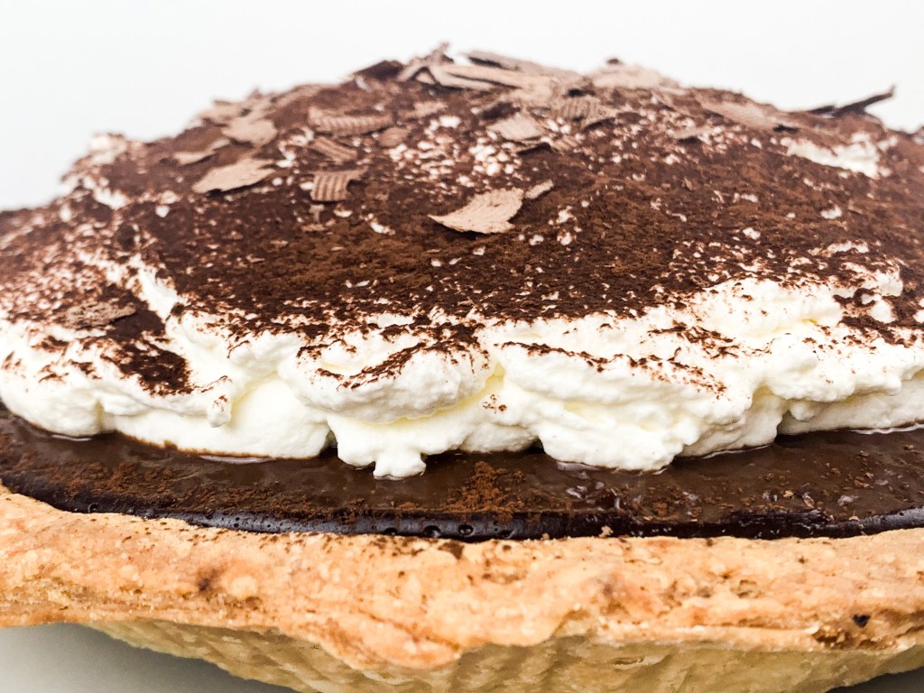 - Whip up the whipped cream together with sugar and vanilla. Until thick. Layer it ontop of the pie and then grate some chocolate shavings on top for garnish.