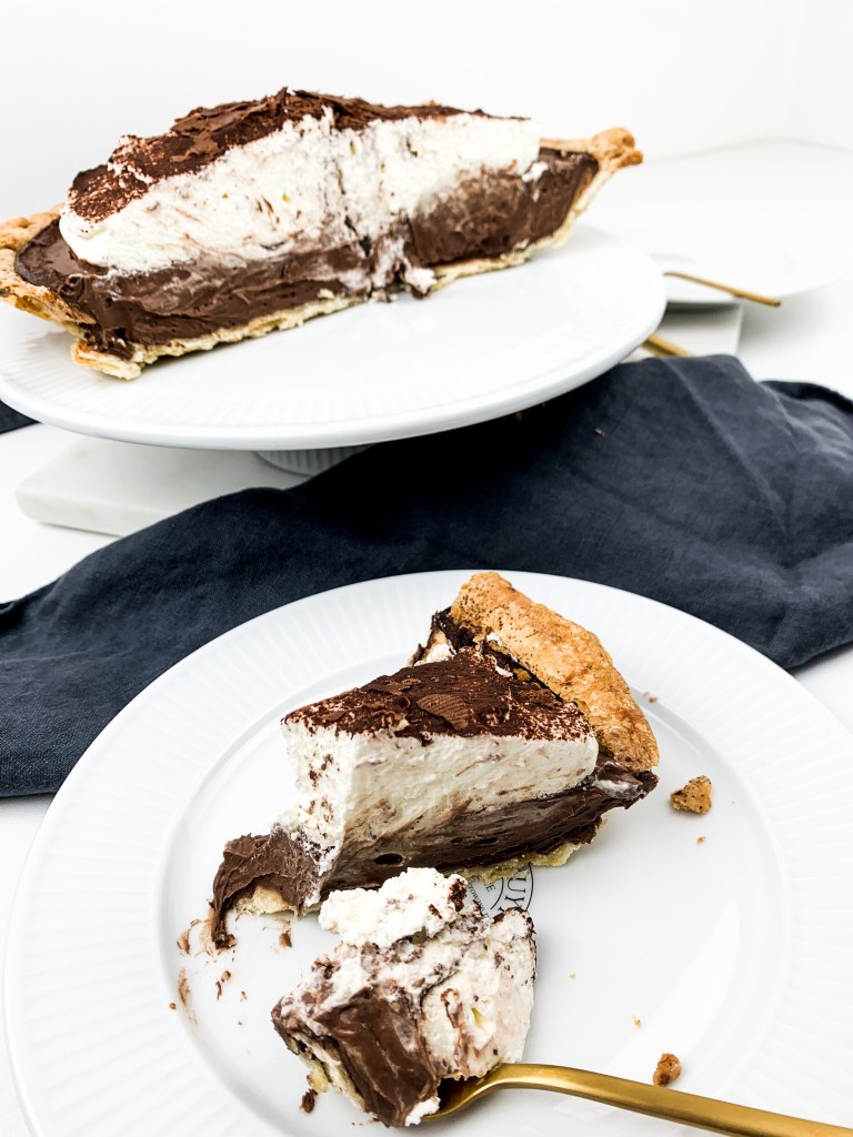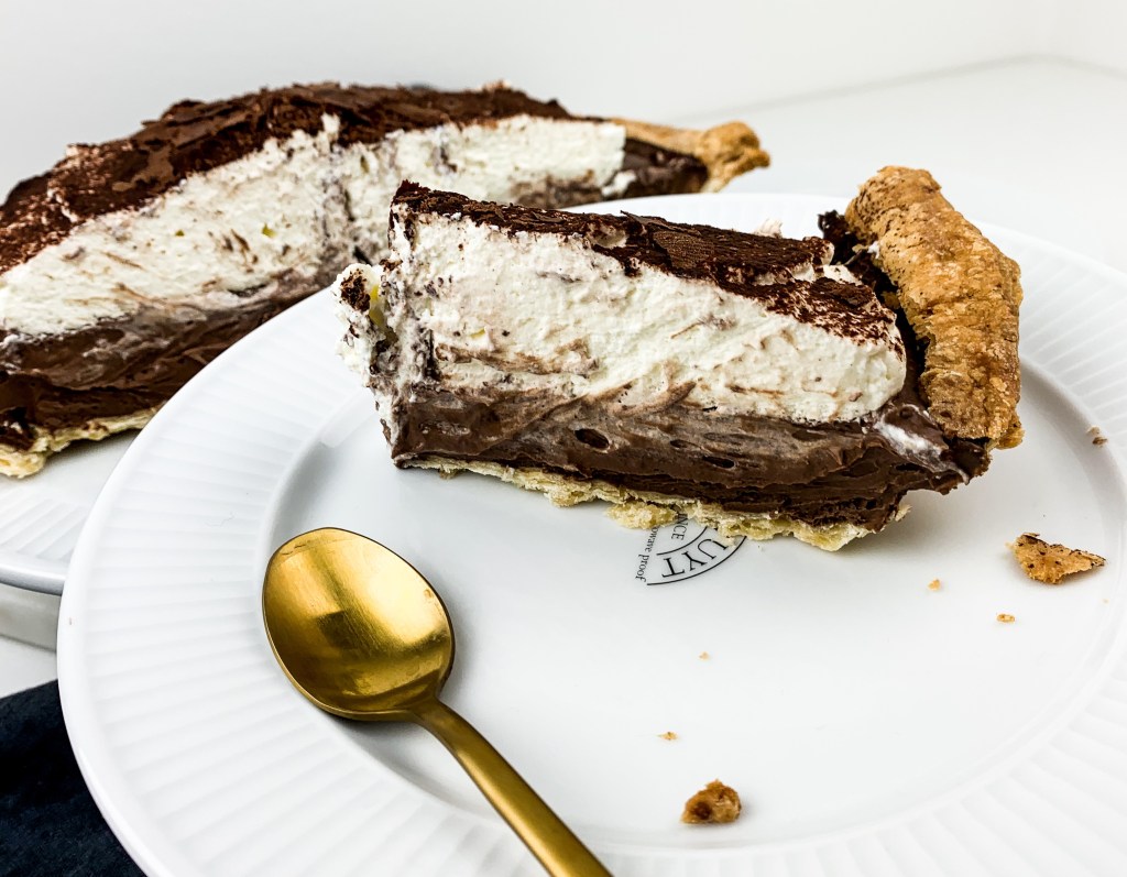 - Remove the pan from the heat and immediately whisk in the cubed butter and chocolate until completely melted and smooth. Stir in the vanilla, then pour into the prepared pie crust. Cover with plastic wrap, pressing into the surface of the filling so a skin doesn’t form, and refrigerate for 4 hours until the filling is set and chilled.