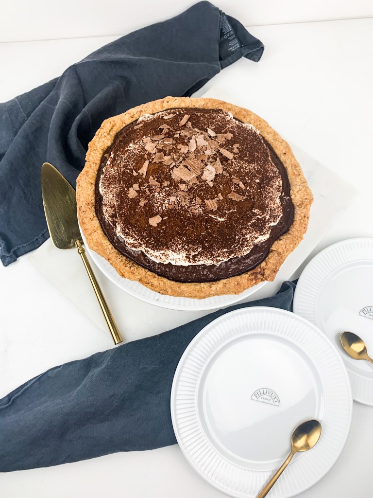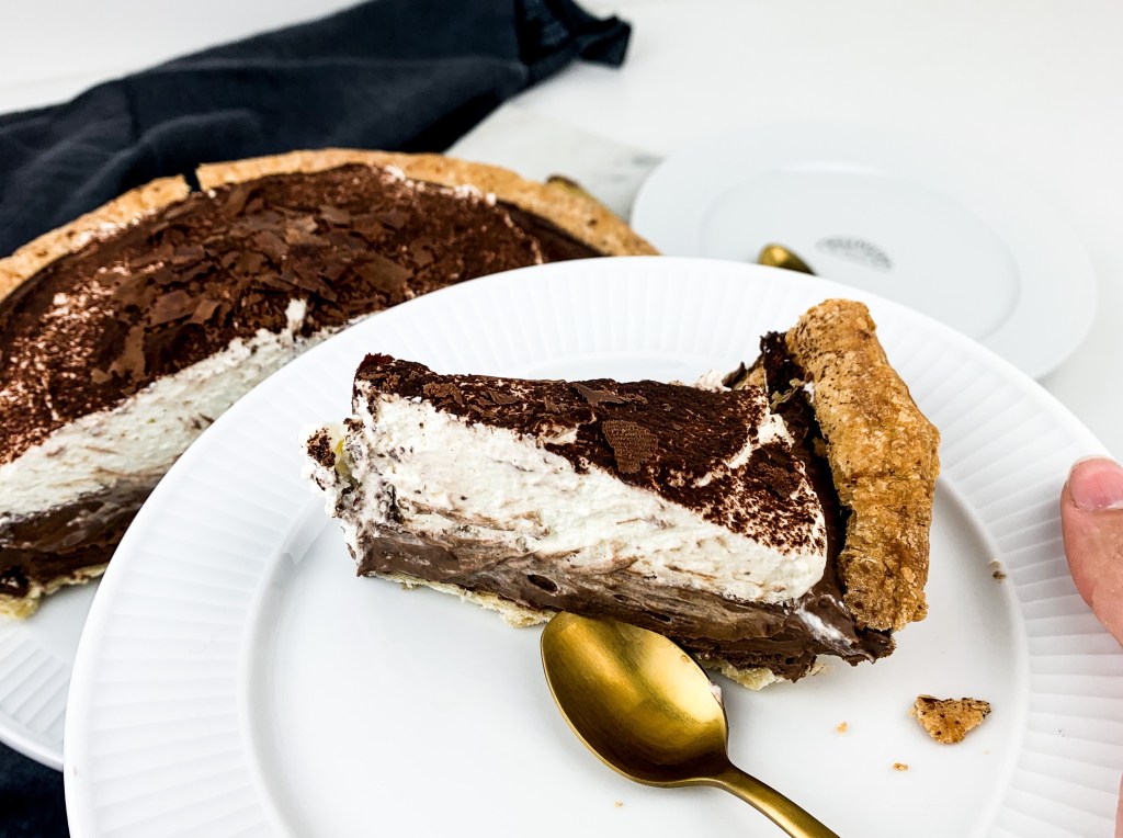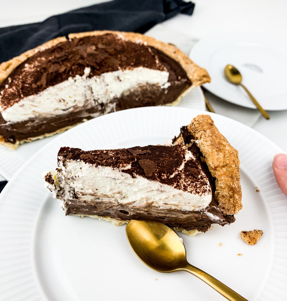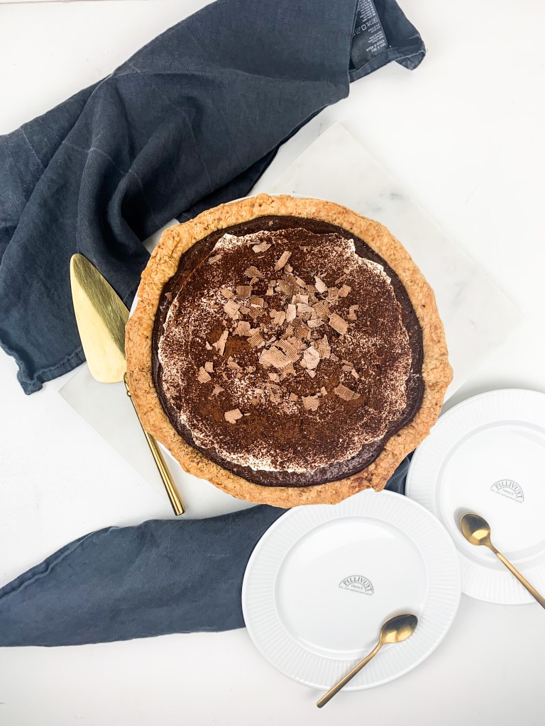 It almost feels like summer in Sweden! Yay! Today feels like the very first day of warm sunny weather with little to no wind. woop woop! And as the weather is changing what better treat to enjoy than something cold and choclatey! This yummy pie with filled with a smooth velvety chocolate pudding topped with whipped cream and chocolate shavings.. honestly there is no neat’ness or pretty’ness about this pie, its rustic and delicious! Sometimes thats all you need! 🙂