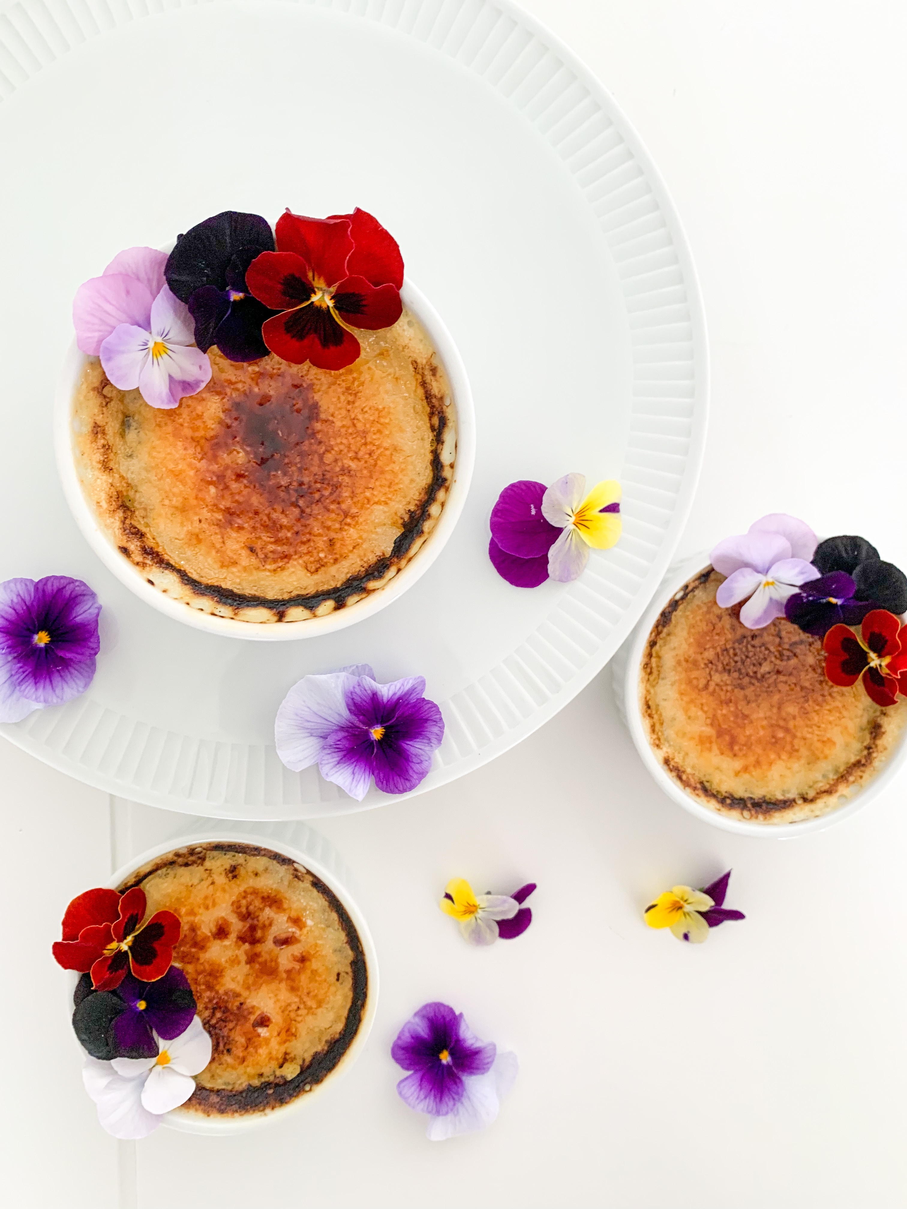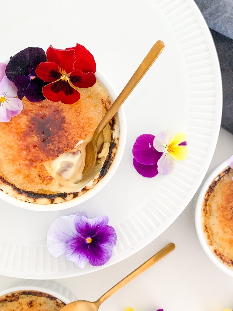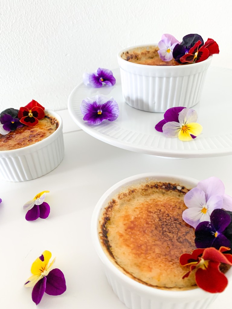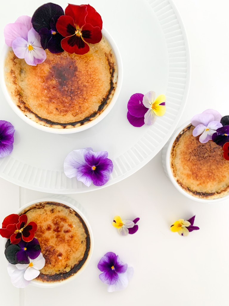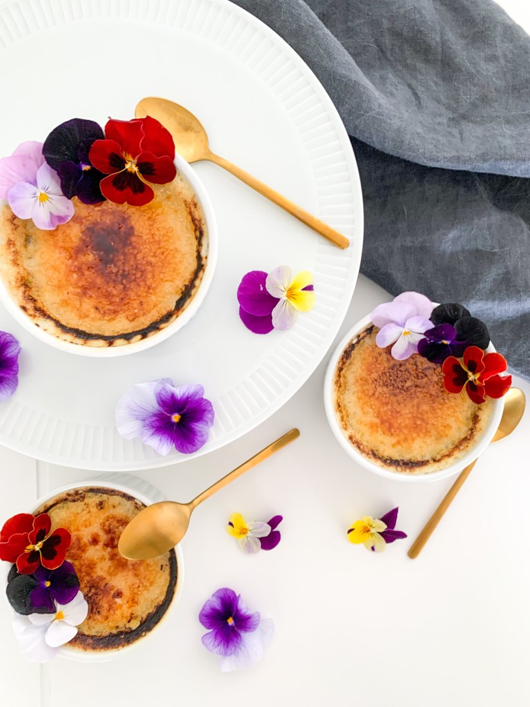 Place ramekins in the oven at the very top with the broiler/grill on at 200C (350F) but making sure the ramekins are roughly 2 to 3 inches from heat on top. Cook until sugar melts and browns or even blackens a bit (tastier when they are blackened a bit in my opinion!) about 5 minutes. Place into fridge until ready to serve. Serve within two hours. I added some edible flowers as decorations on top.