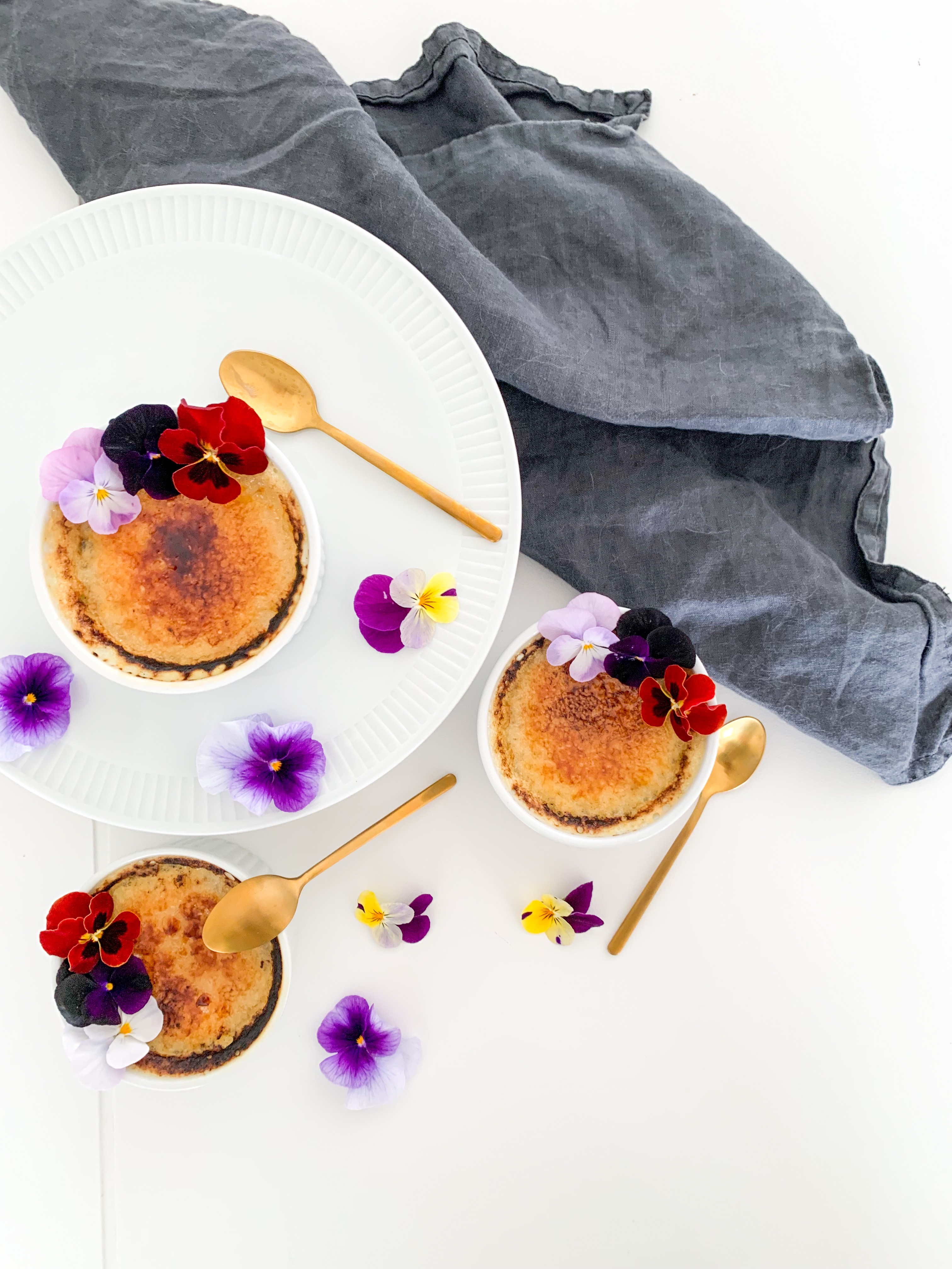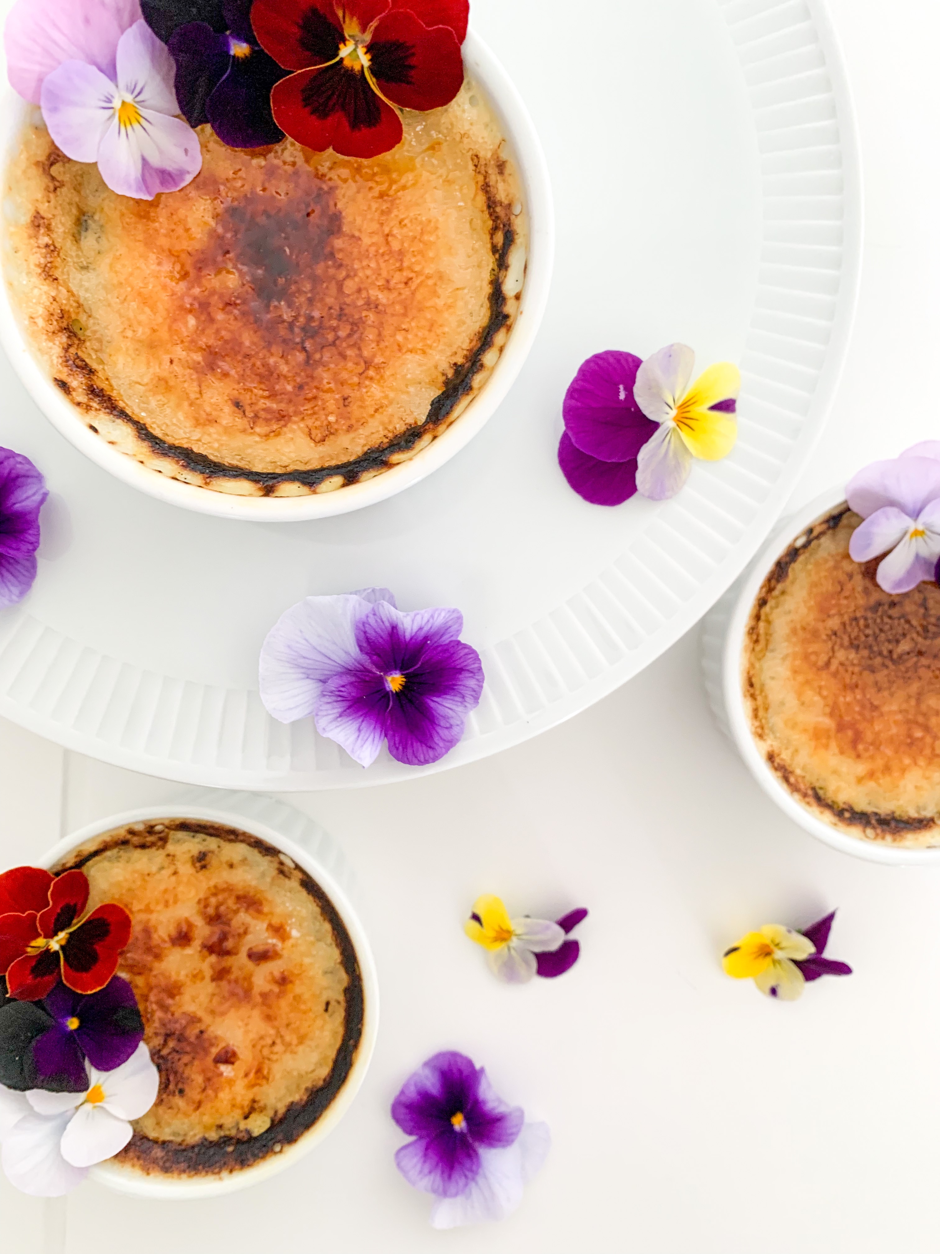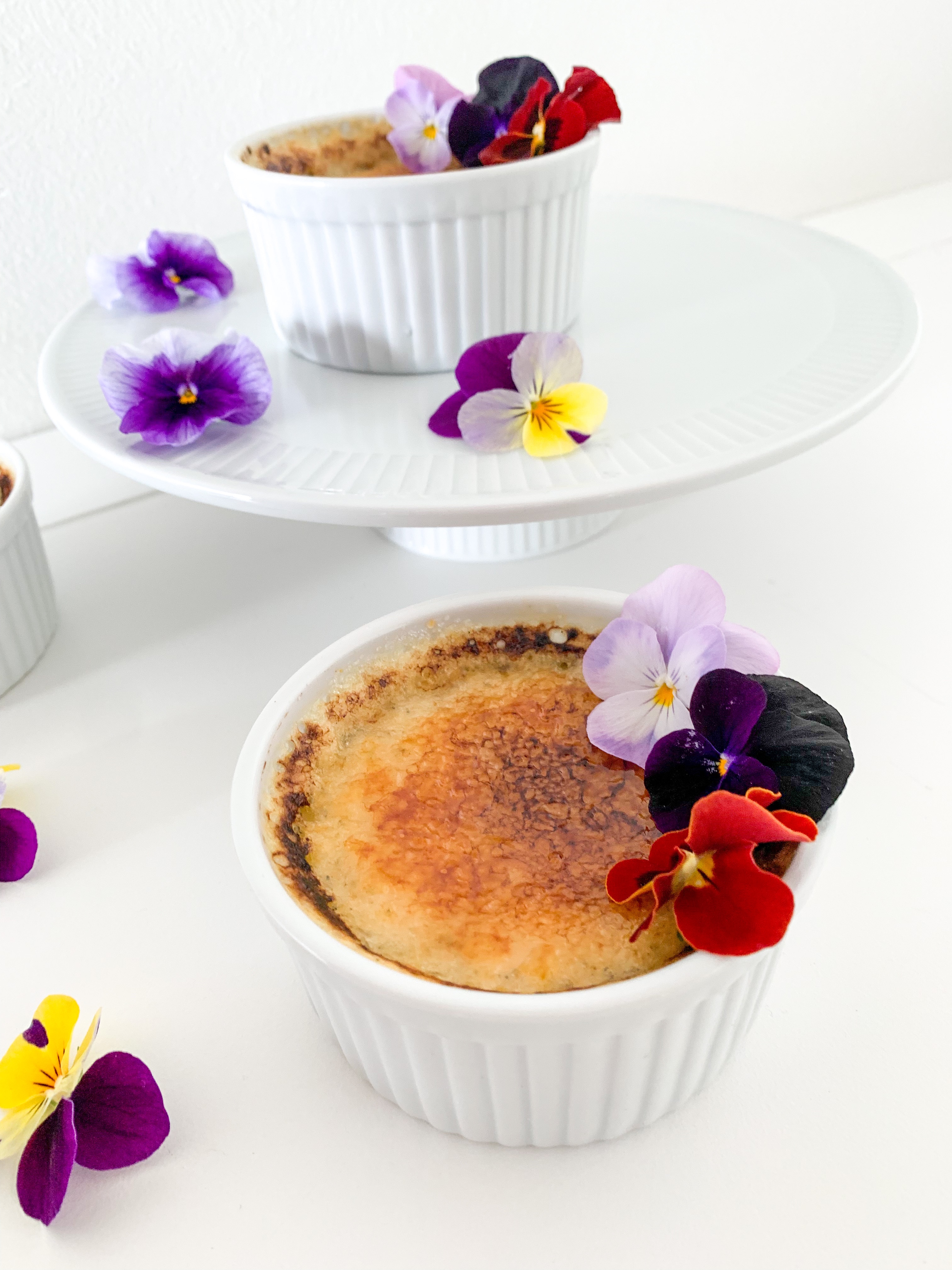 Place ramekins in the oven at the very top with the broiler/grill on at 200C (350F) but making sure the ramekins are roughly 2 to 3 inches from heat on top. Cook until sugar melts and browns or even blackens a bit (tastier when they are blackened a bit in my opinion!) about 5 minutes. Place into fridge until ready to serve. Serve within two hours. I added some edible flowers as decorations on top.