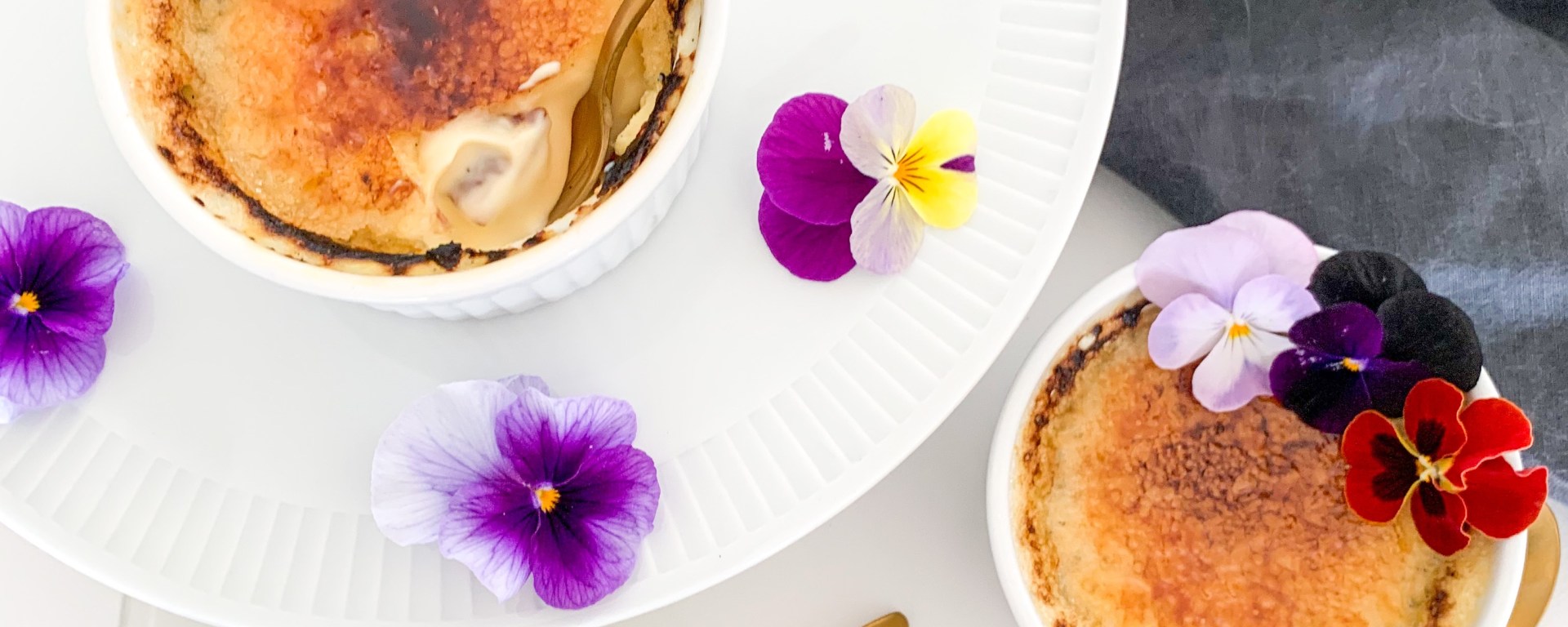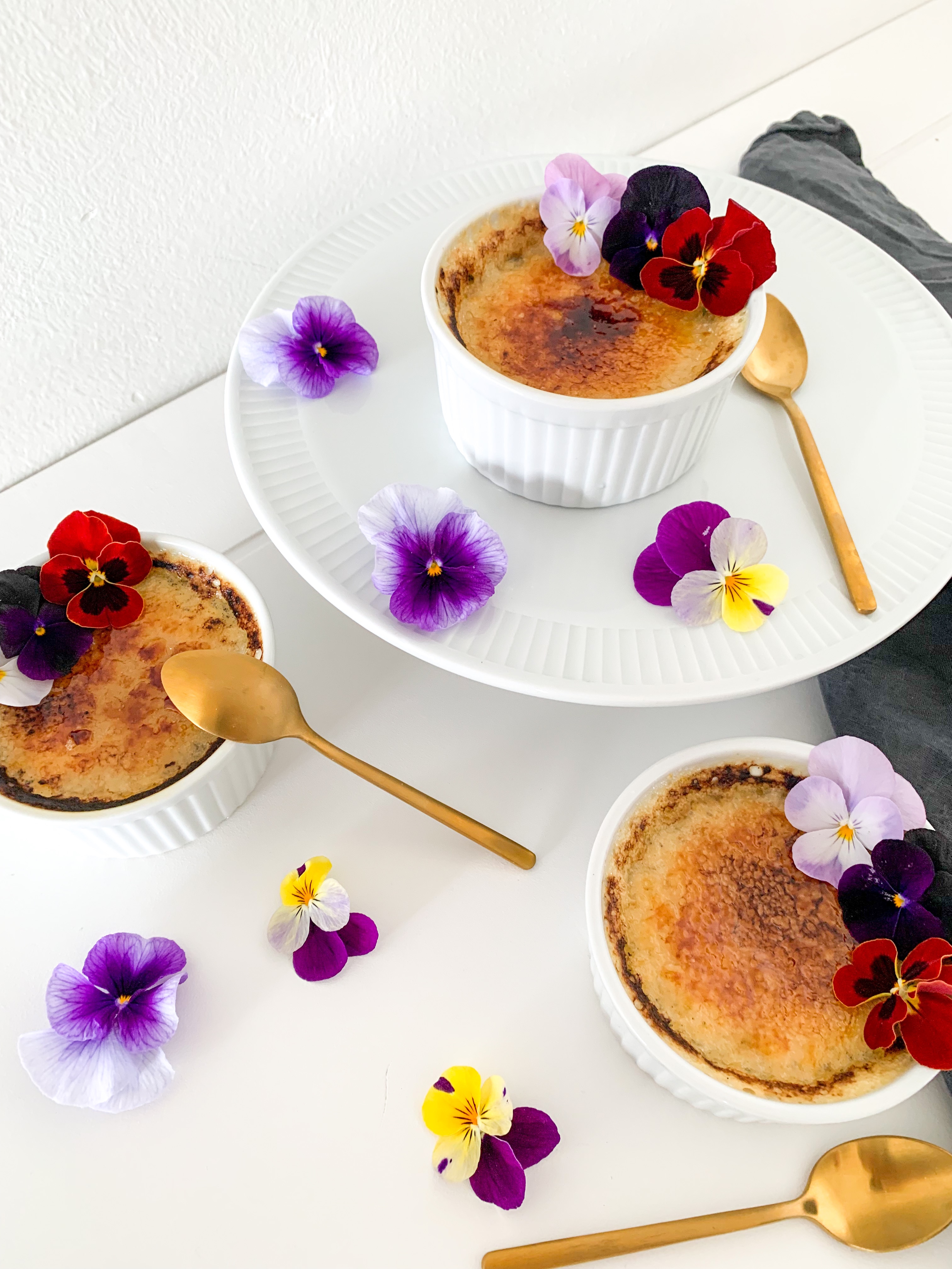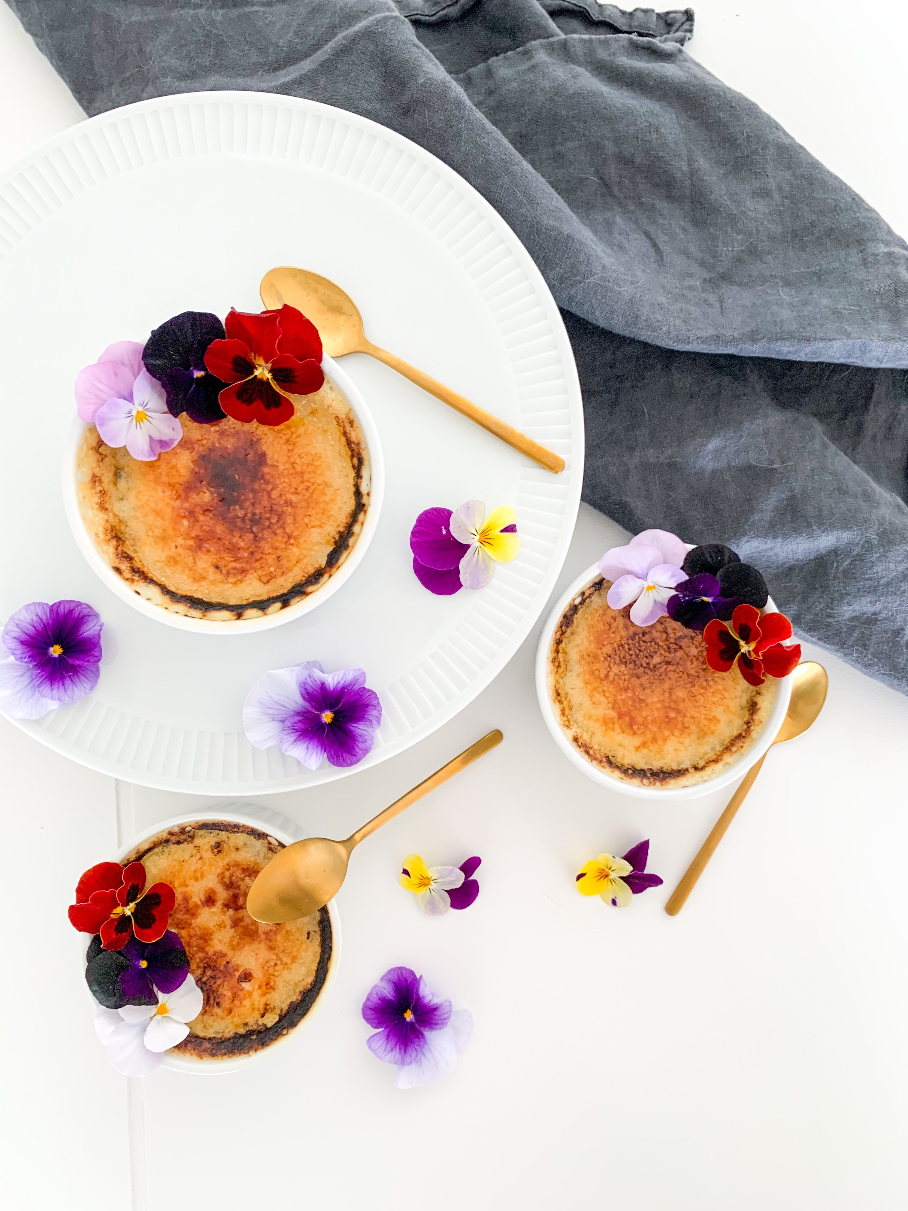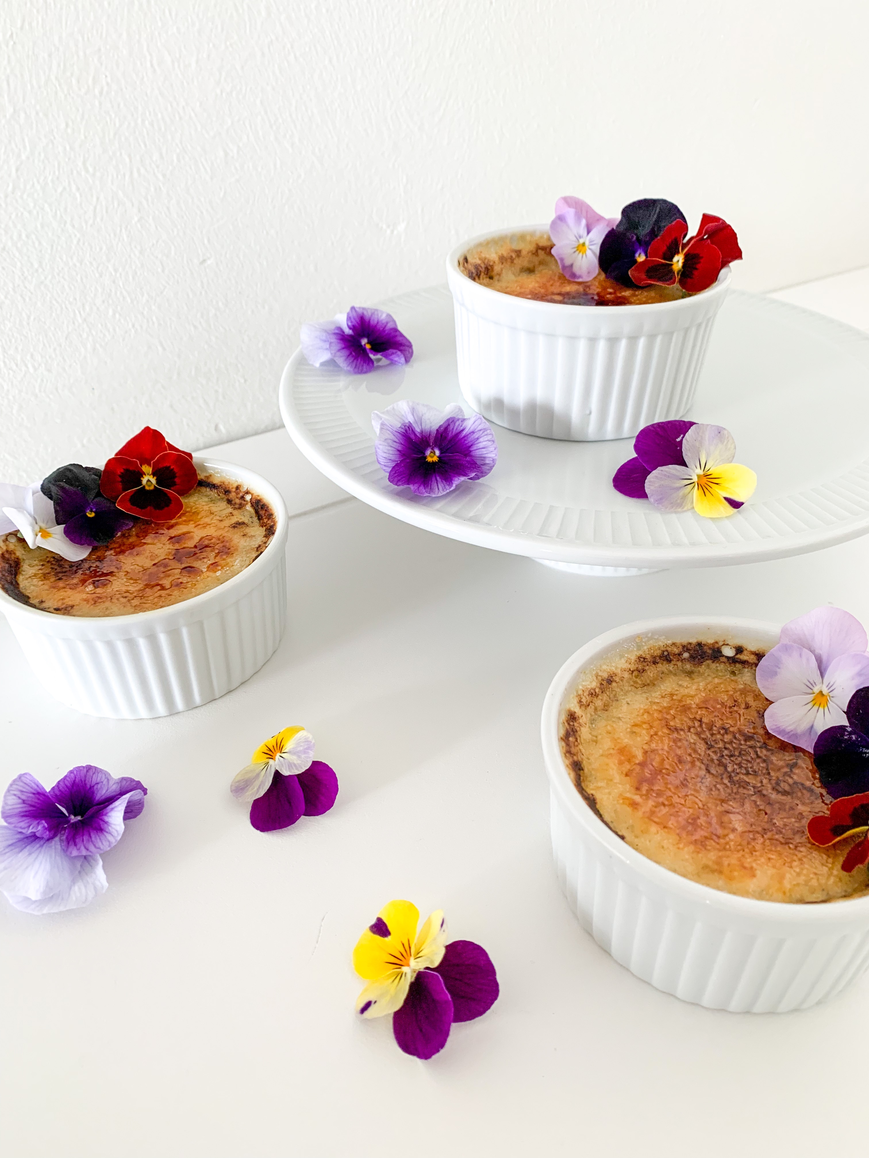 Place ramekins in the oven at the very top with the broiler/grill on at 200C (350F) but making sure the ramekins are roughly 2 to 3 inches from heat on top. Cook until sugar melts and browns or even blackens a bit (tastier when they are blackened a bit in my opinion!) about 5 minutes. Place into fridge until ready to serve. Serve within two hours. I added some edible flowers as decorations on top.