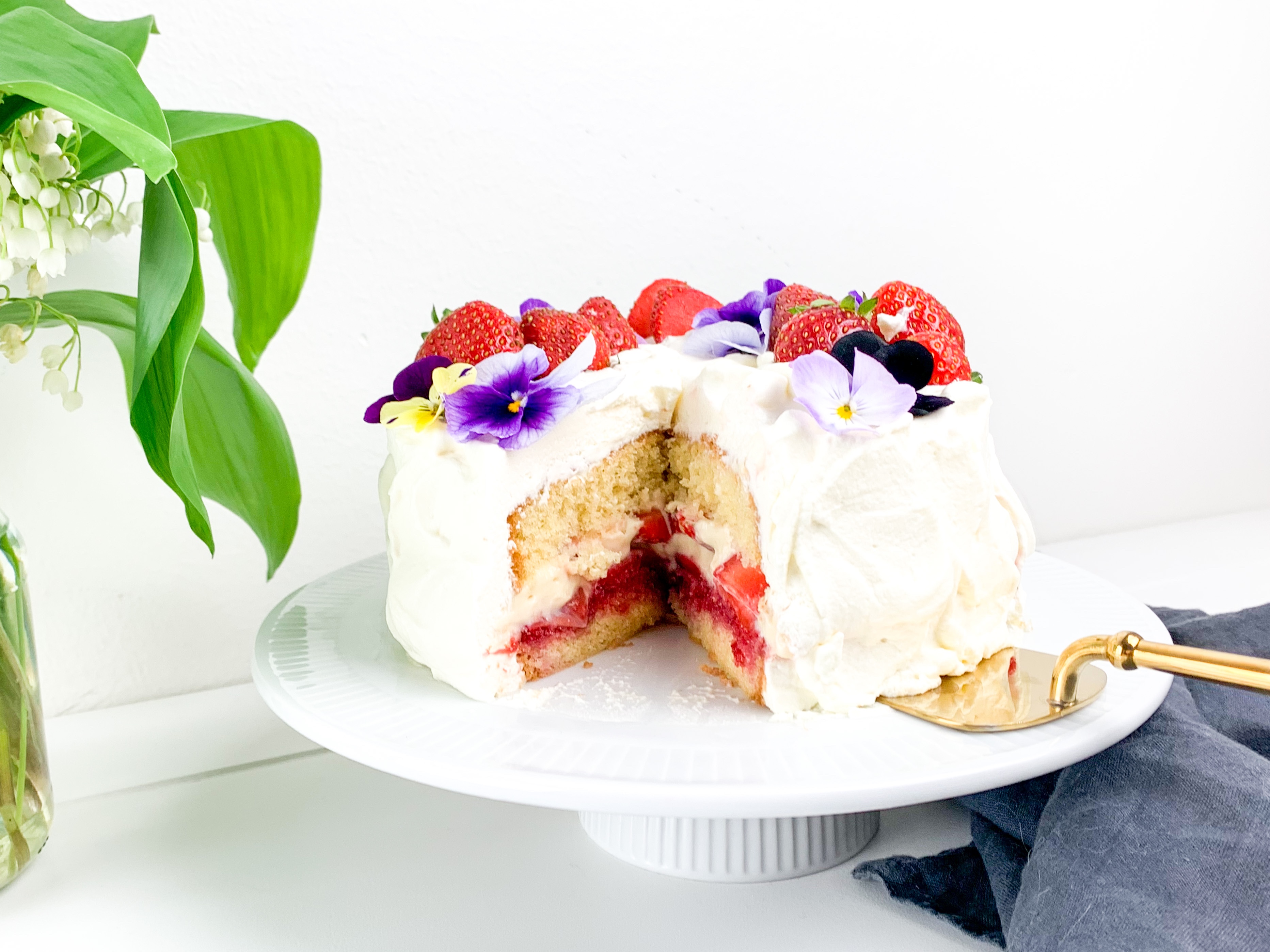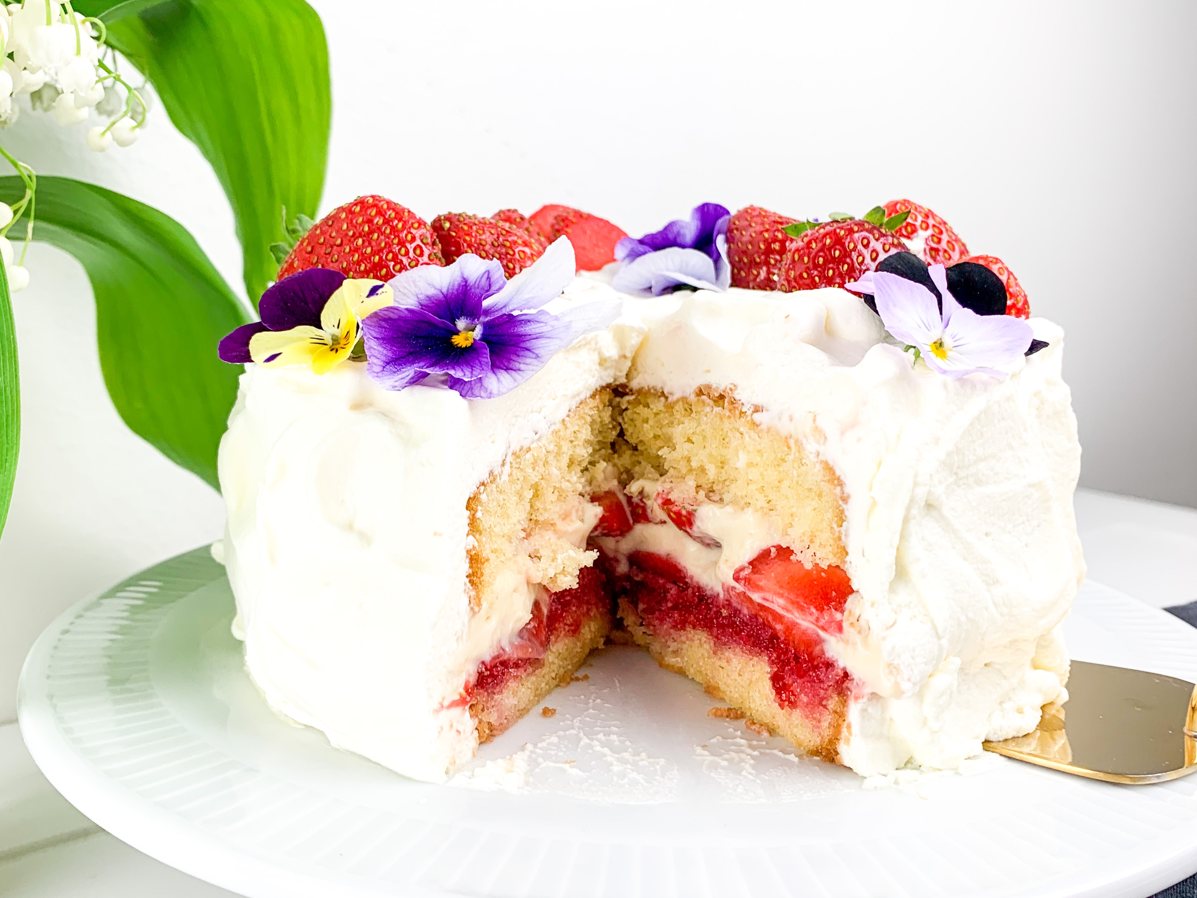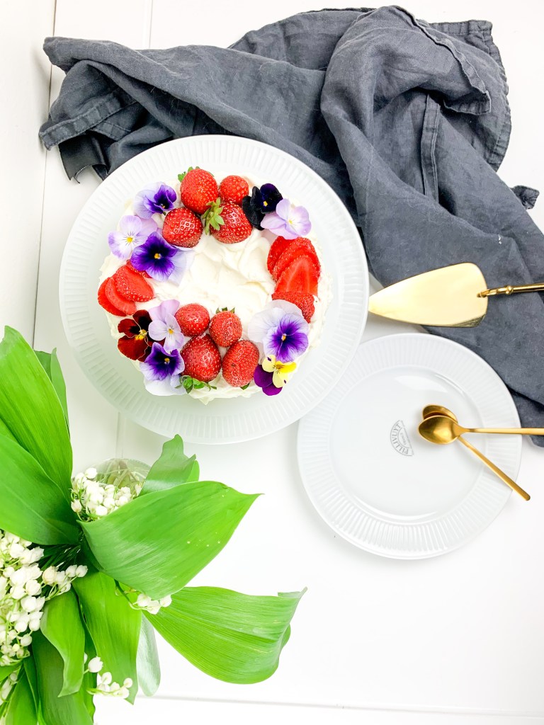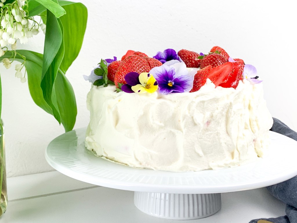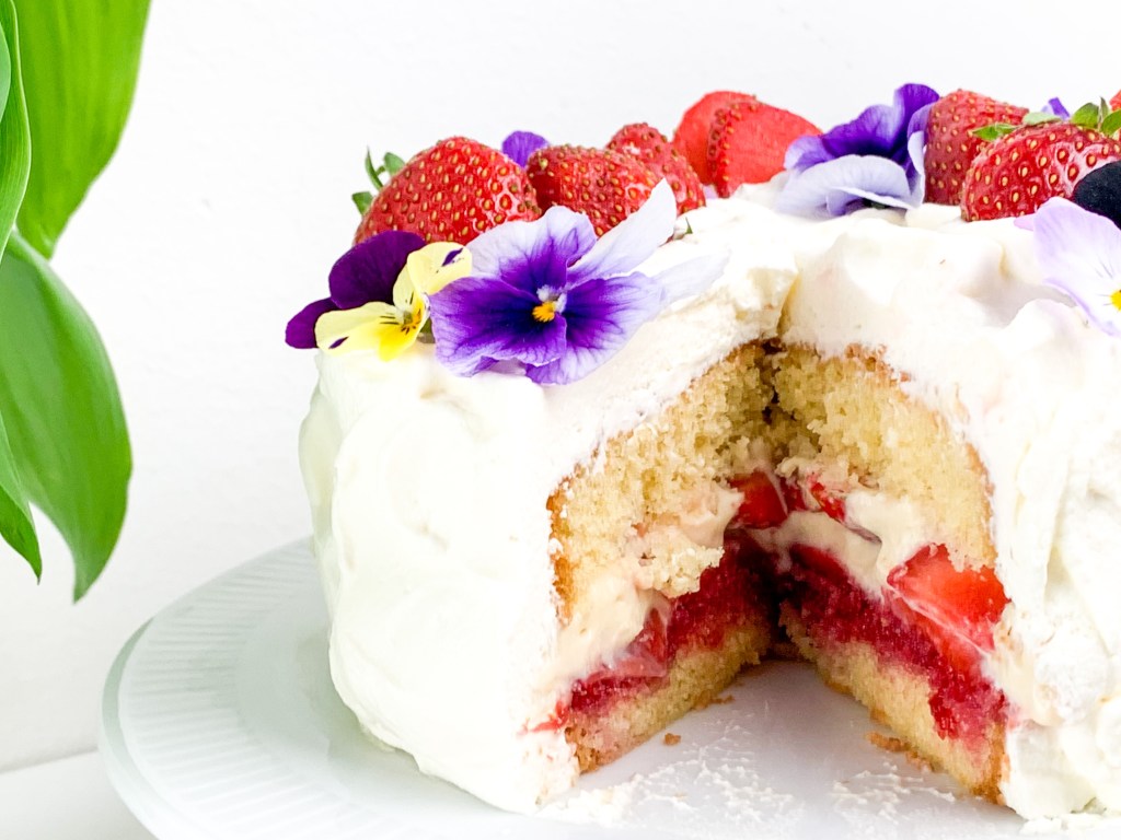 - Cover the whole cake with whipped cream and decorate with strawberries and edible flowers.