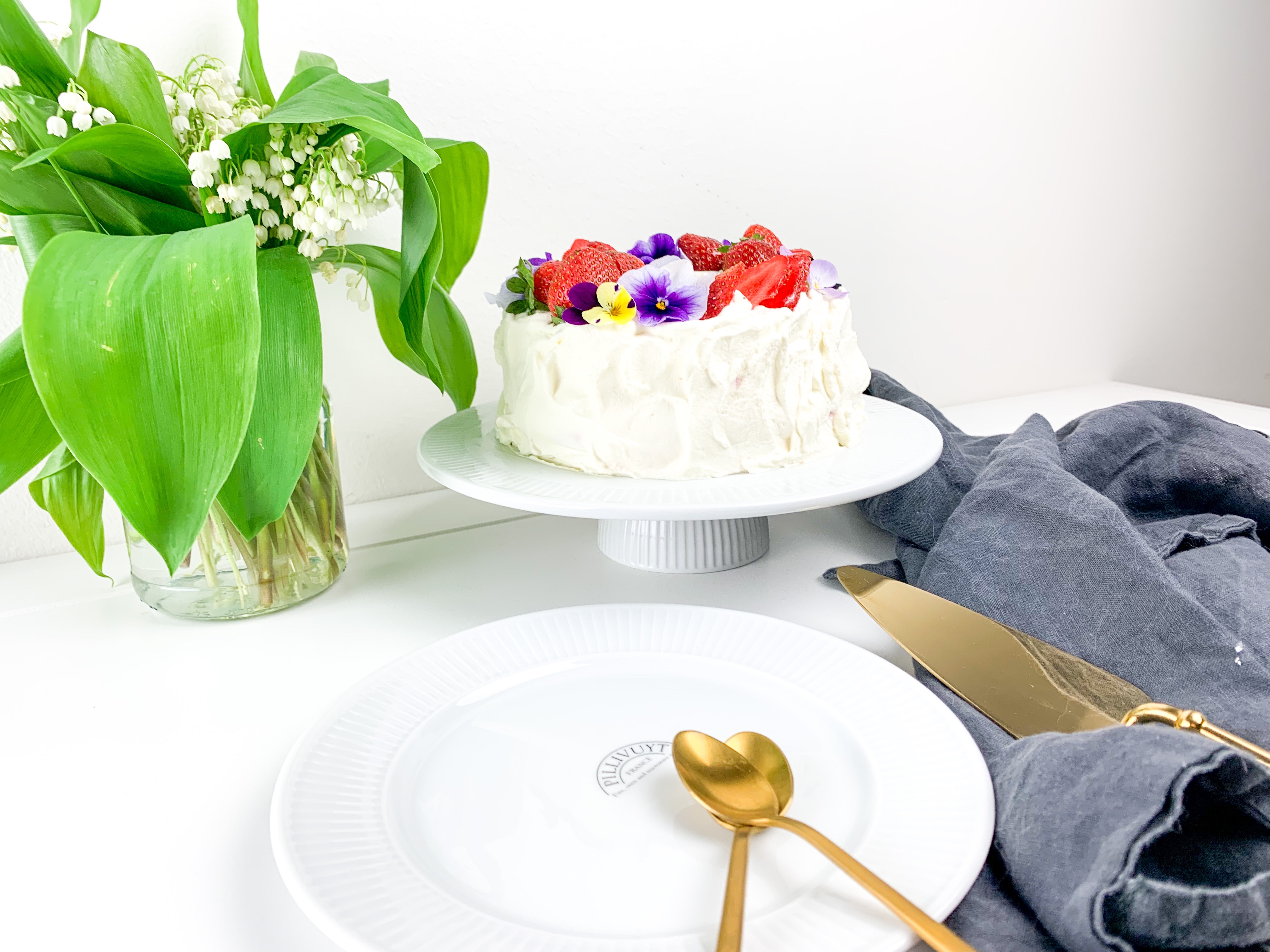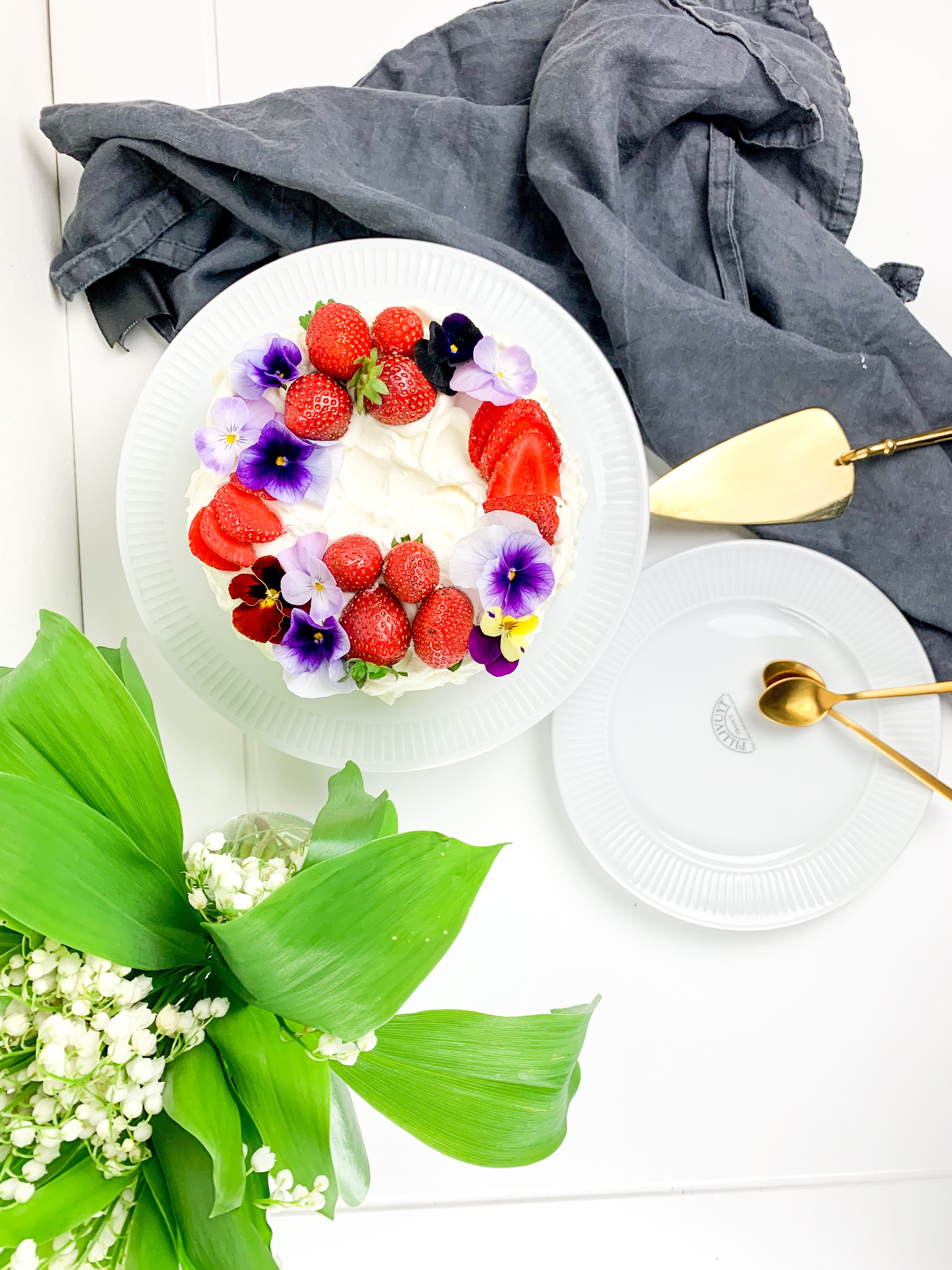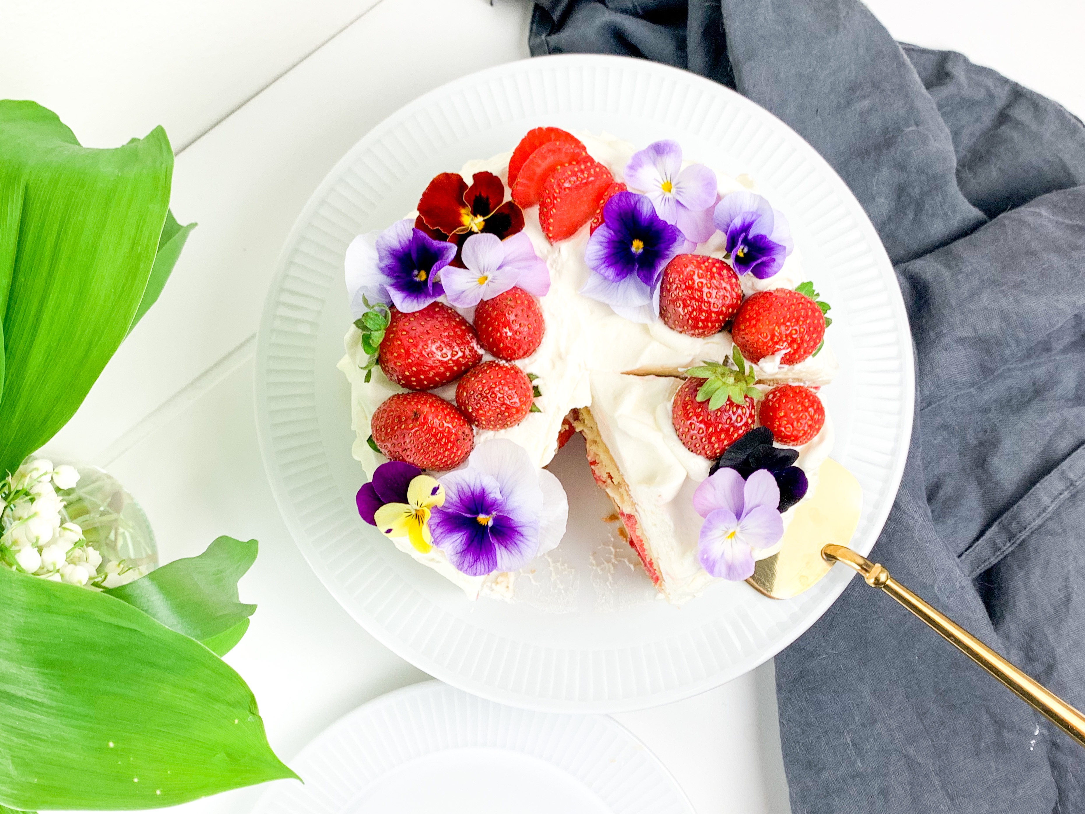 - Cover the whole cake with whipped cream and decorate with strawberries and edible flowers.