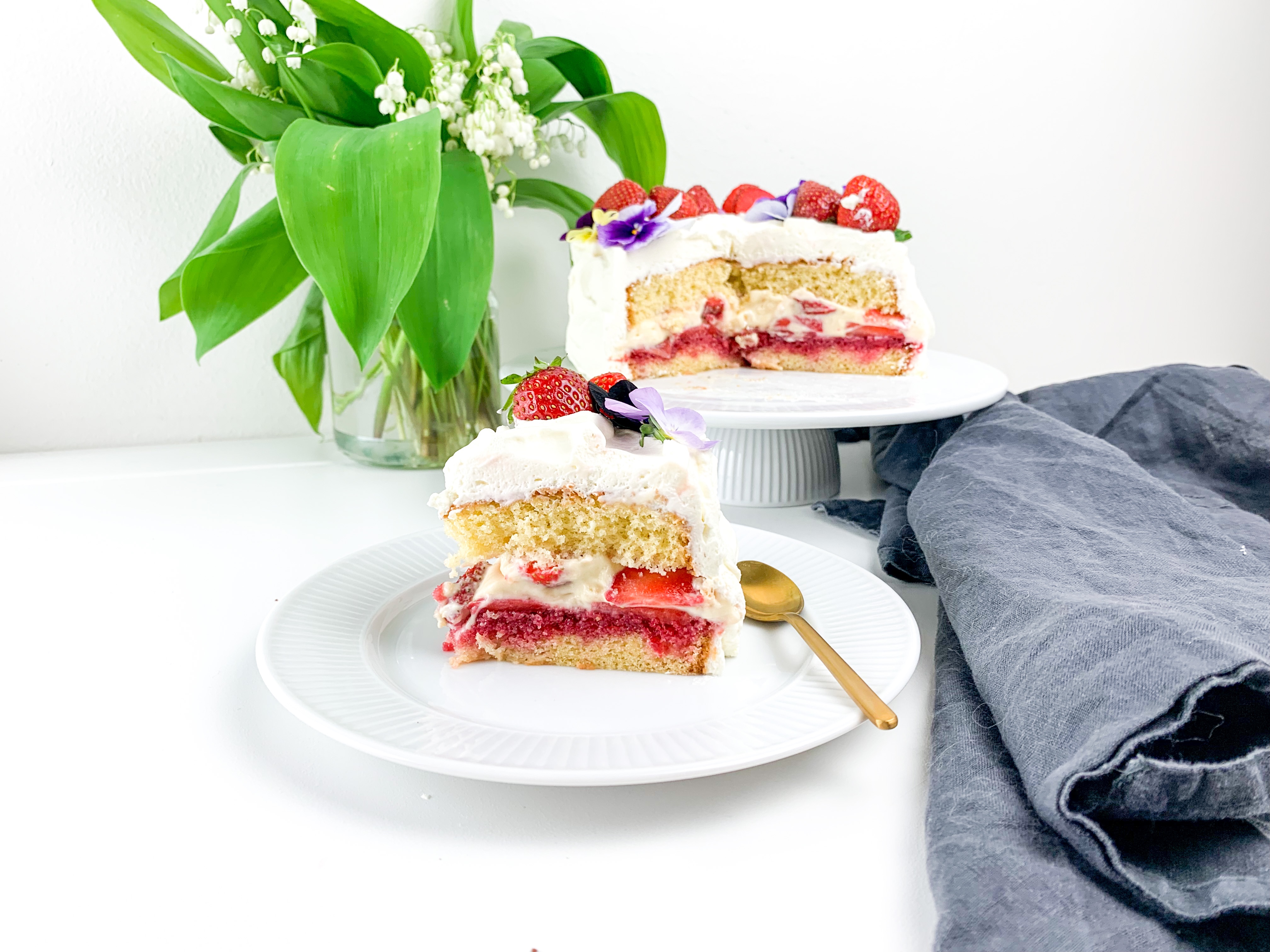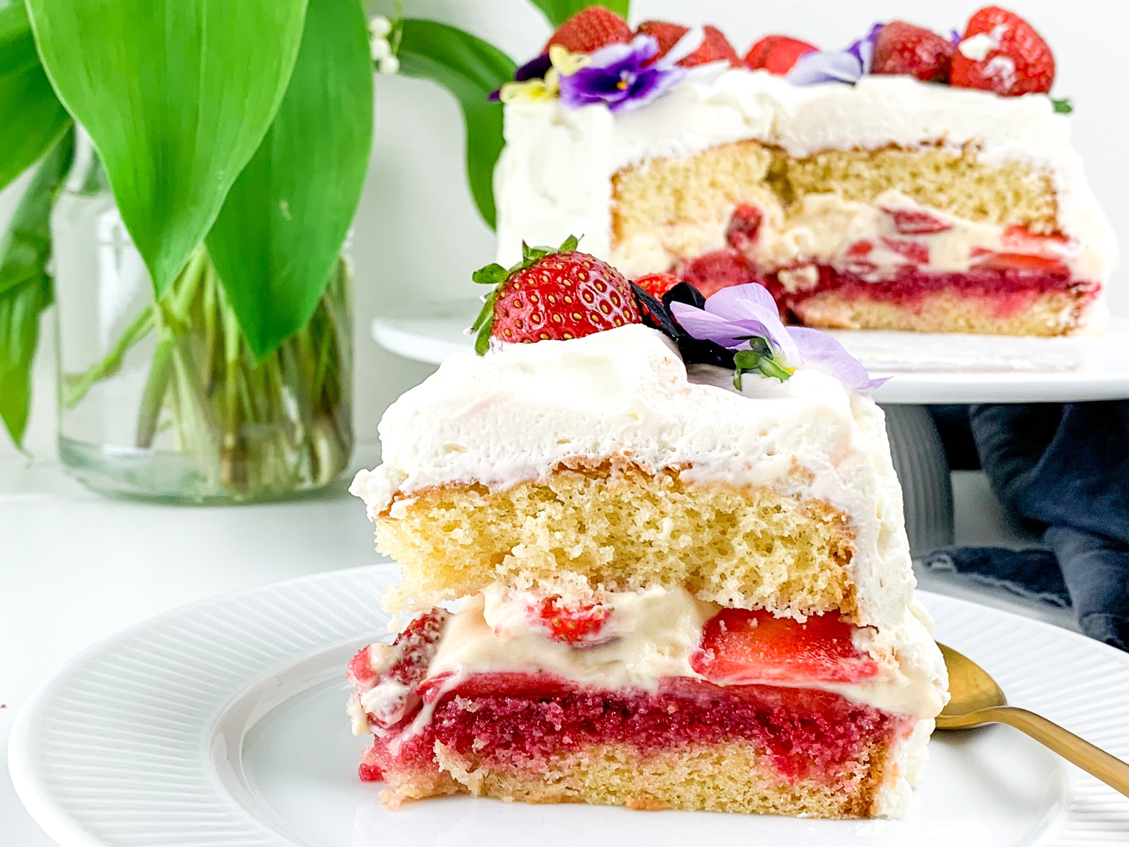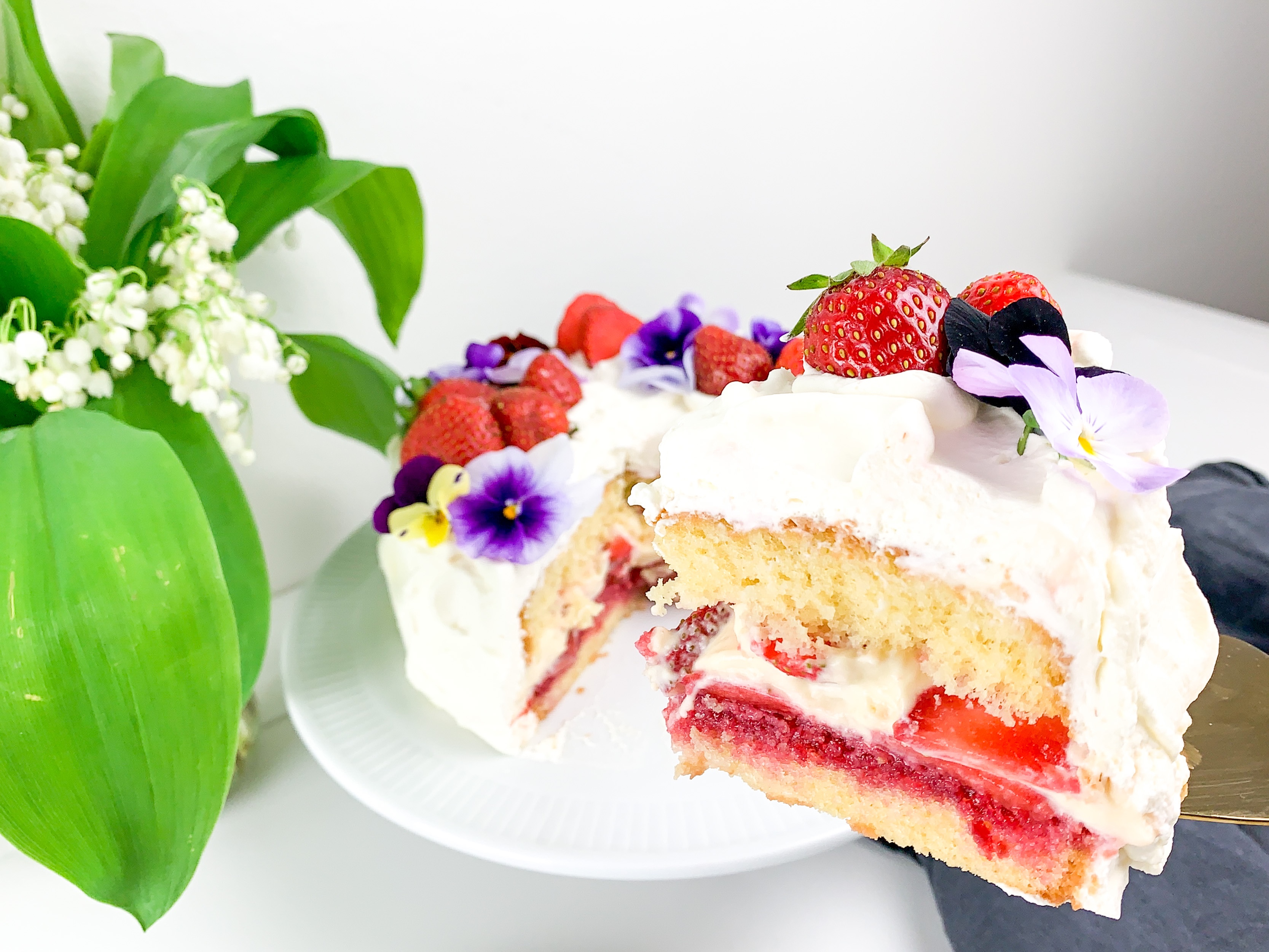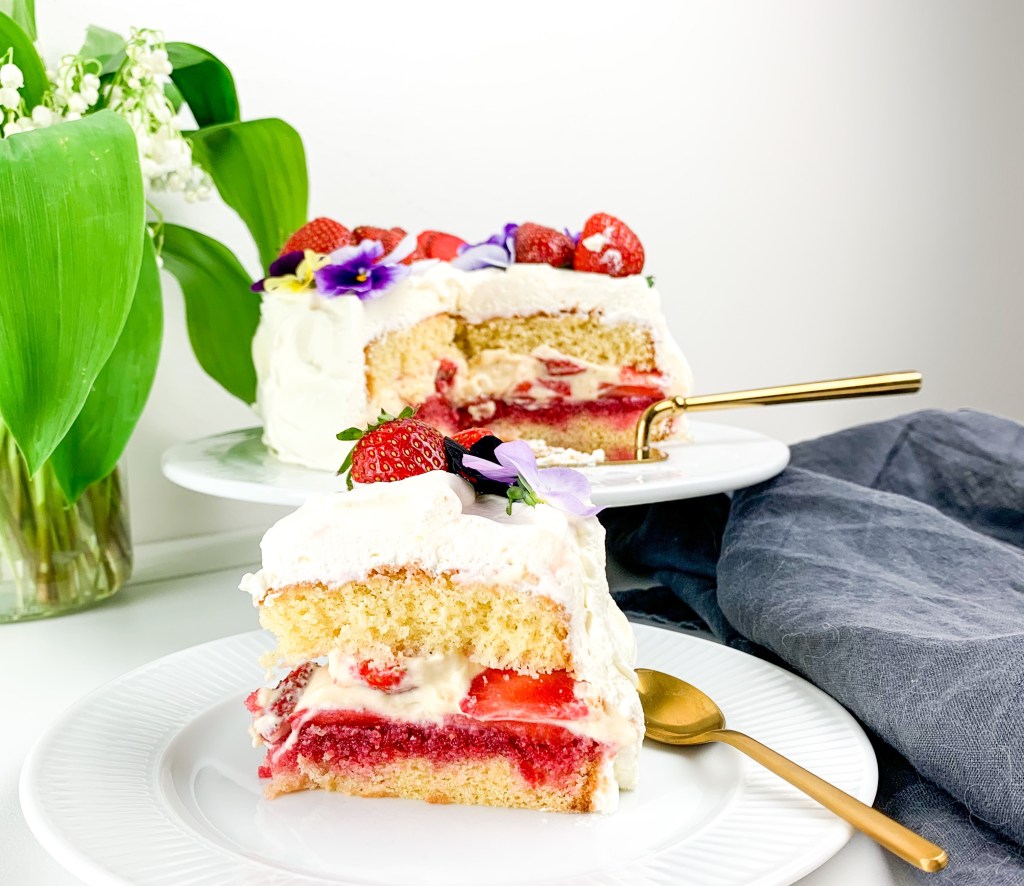 This is a small 6inch cake with vanilla pastry cream and strawberry compote with macerated strawberries in. Oh and covers in white cream Ofcourse 🙂 it’s a very easy bake, did it in two hours (including resting time) and the fact that I pulled off baking this with a 7 week year old baby.. shows just HOW easy this cake Actually is to bake! So give it a go! Plus it’s not so sweet! (Just how I like it!)