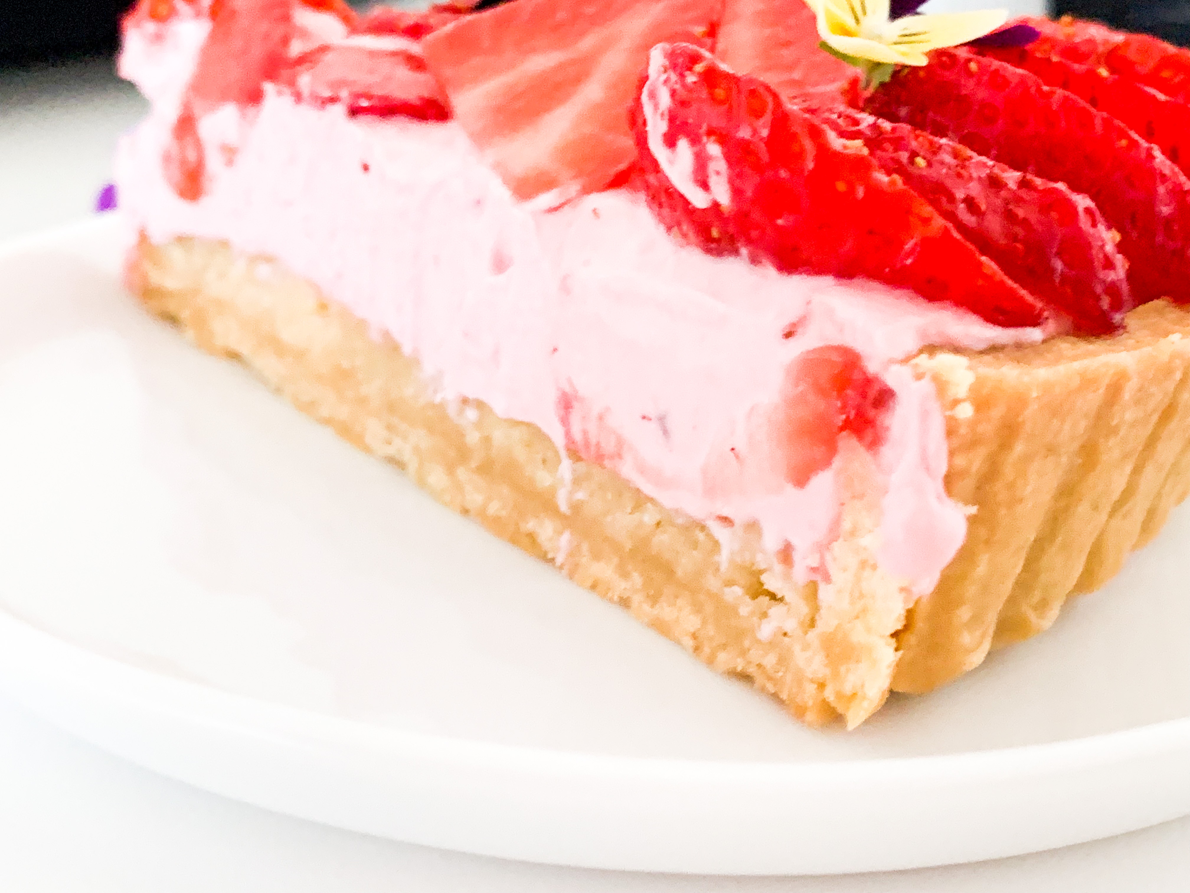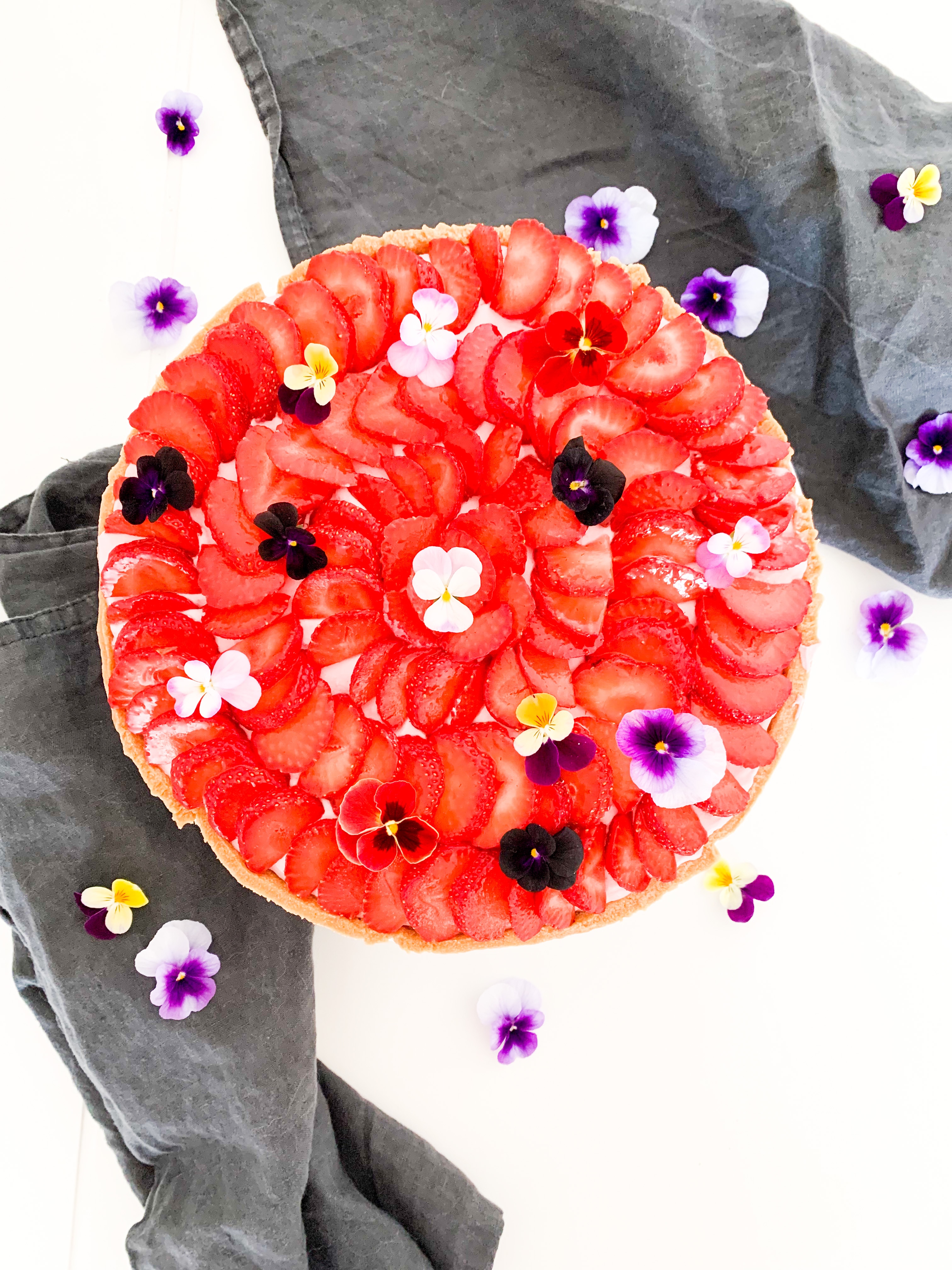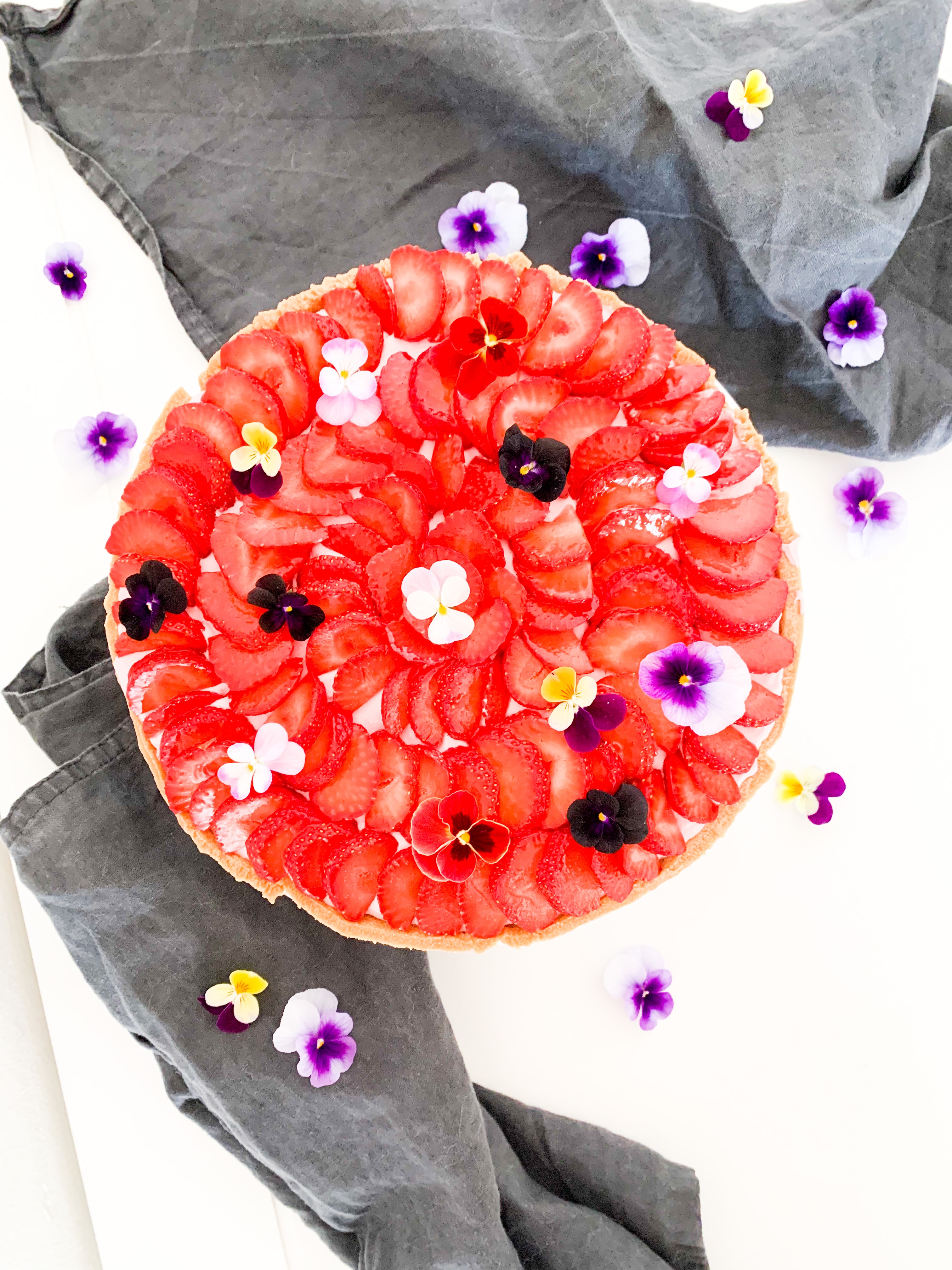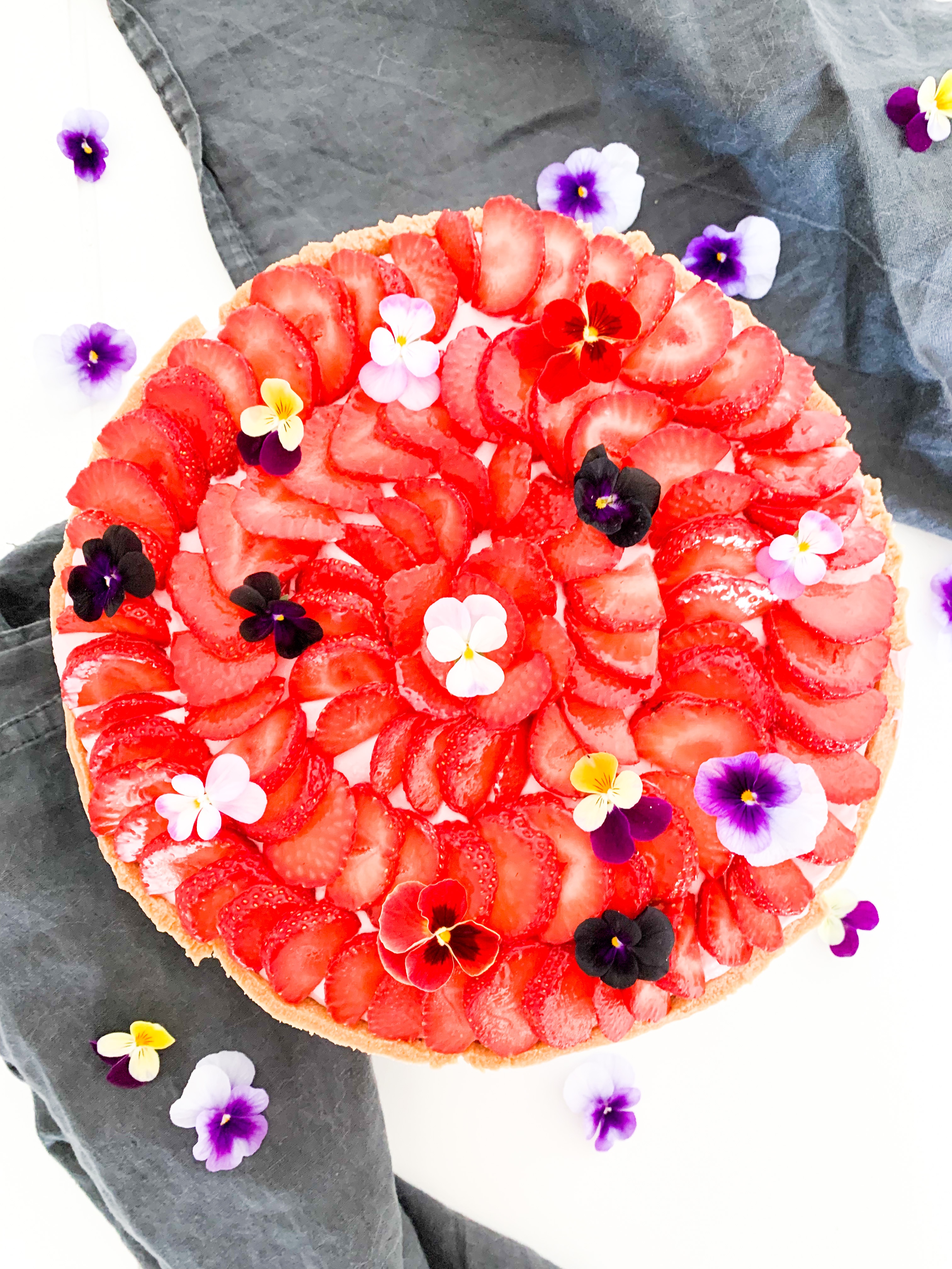 Spread the strawberry whip all over evenly and place beautiful the cut strawberries and some eatable flowers if you like.