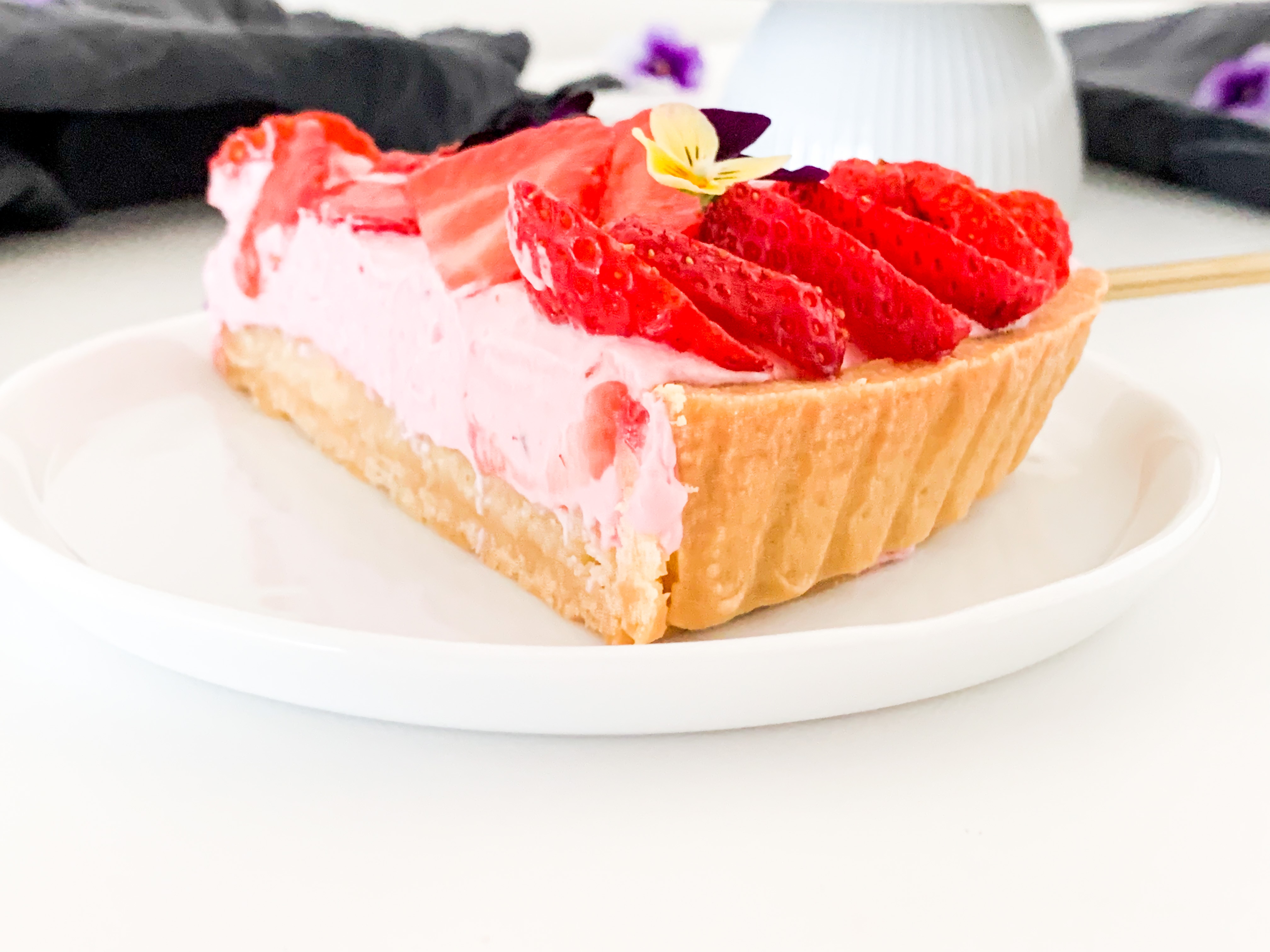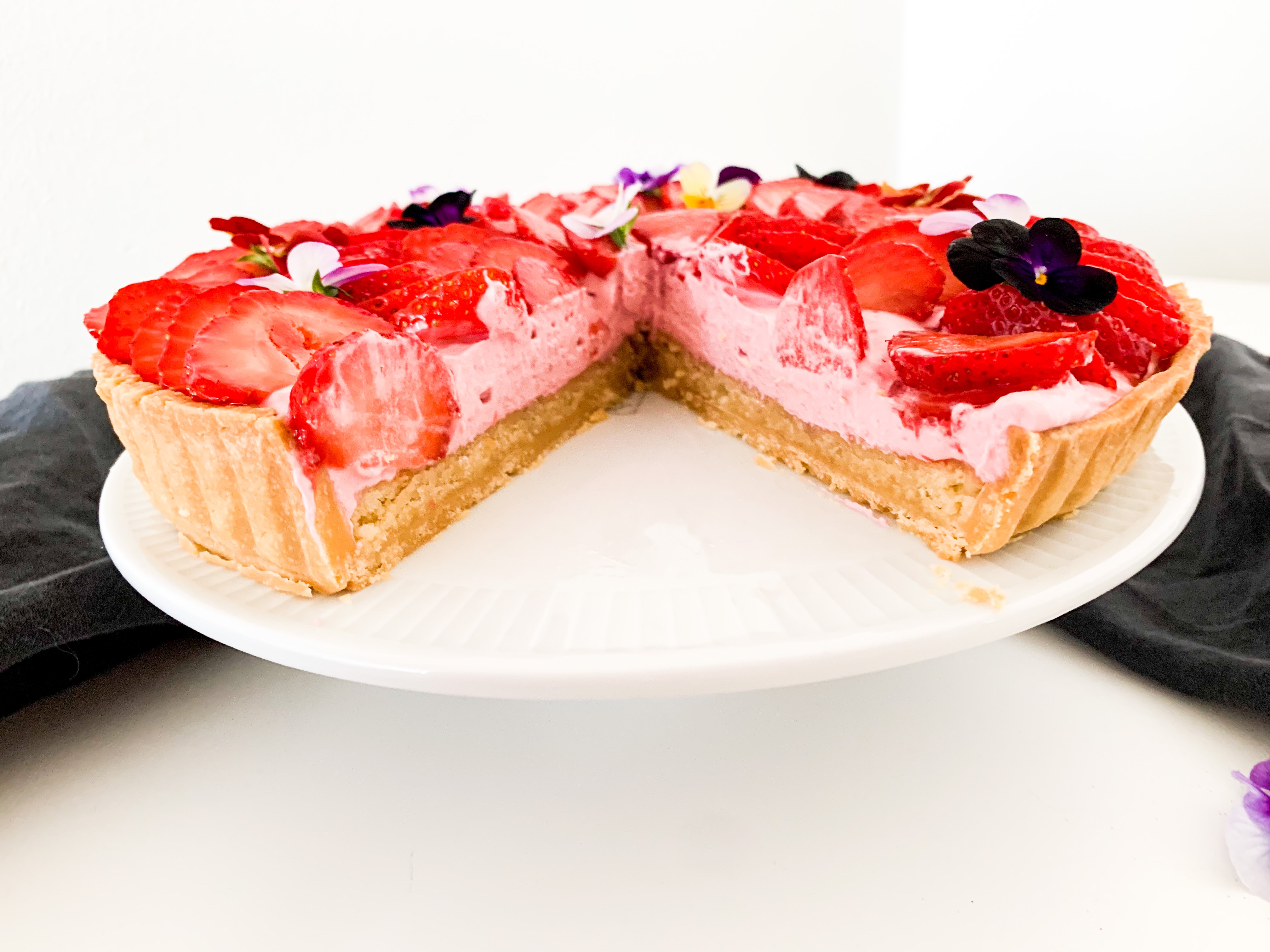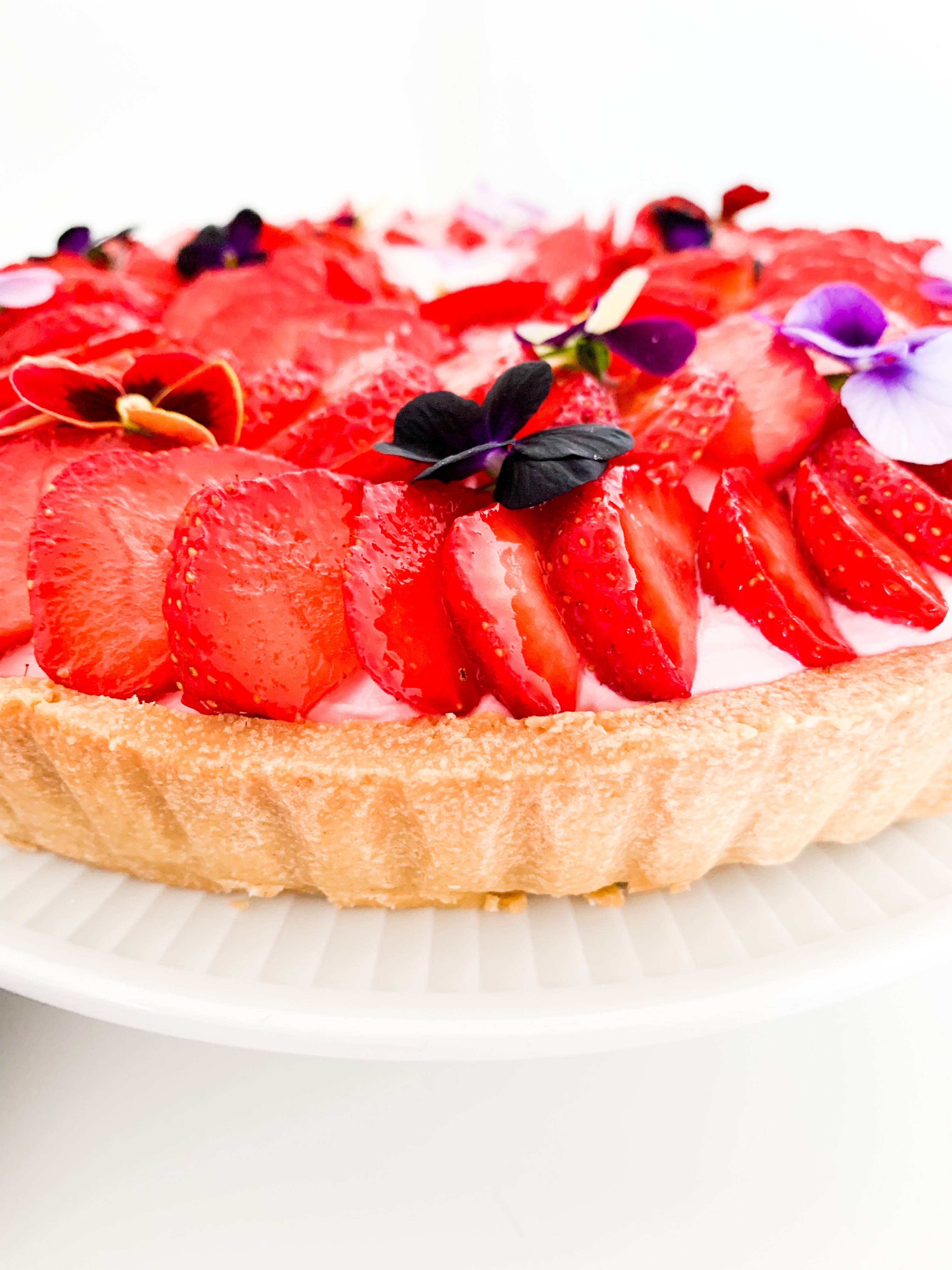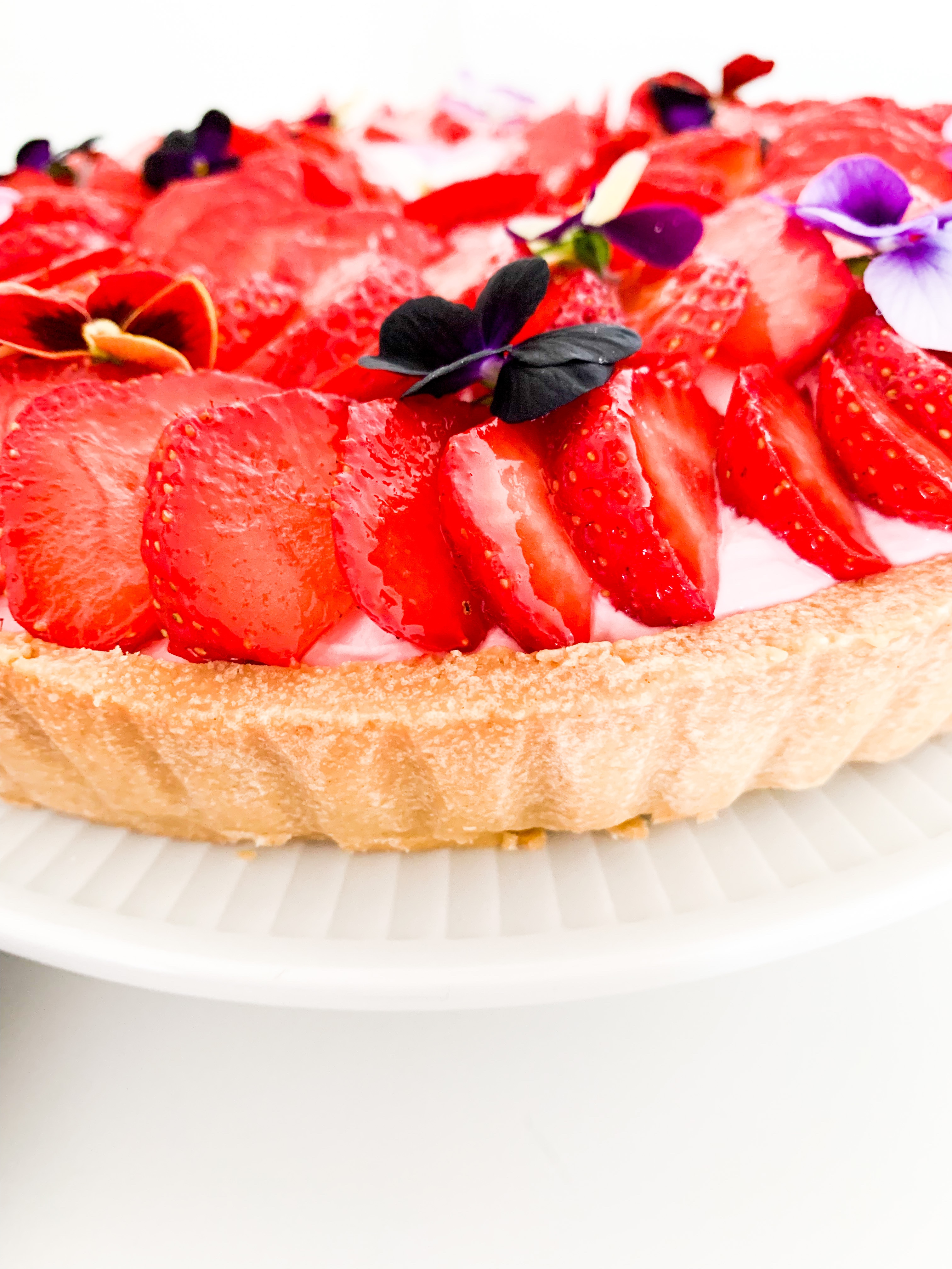 Spread the strawberry whip all over evenly and place beautiful the cut strawberries and some eatable flowers if you like.