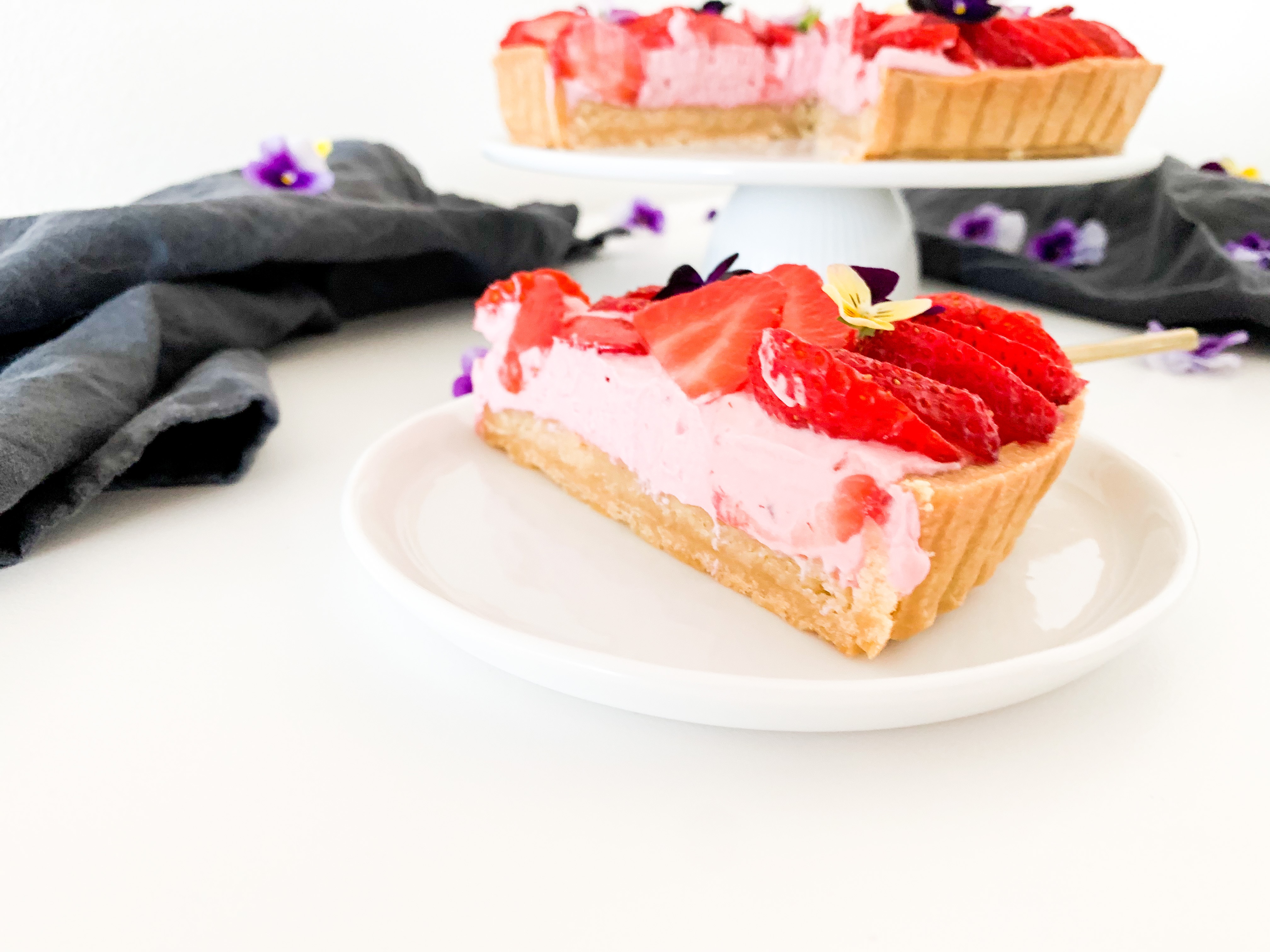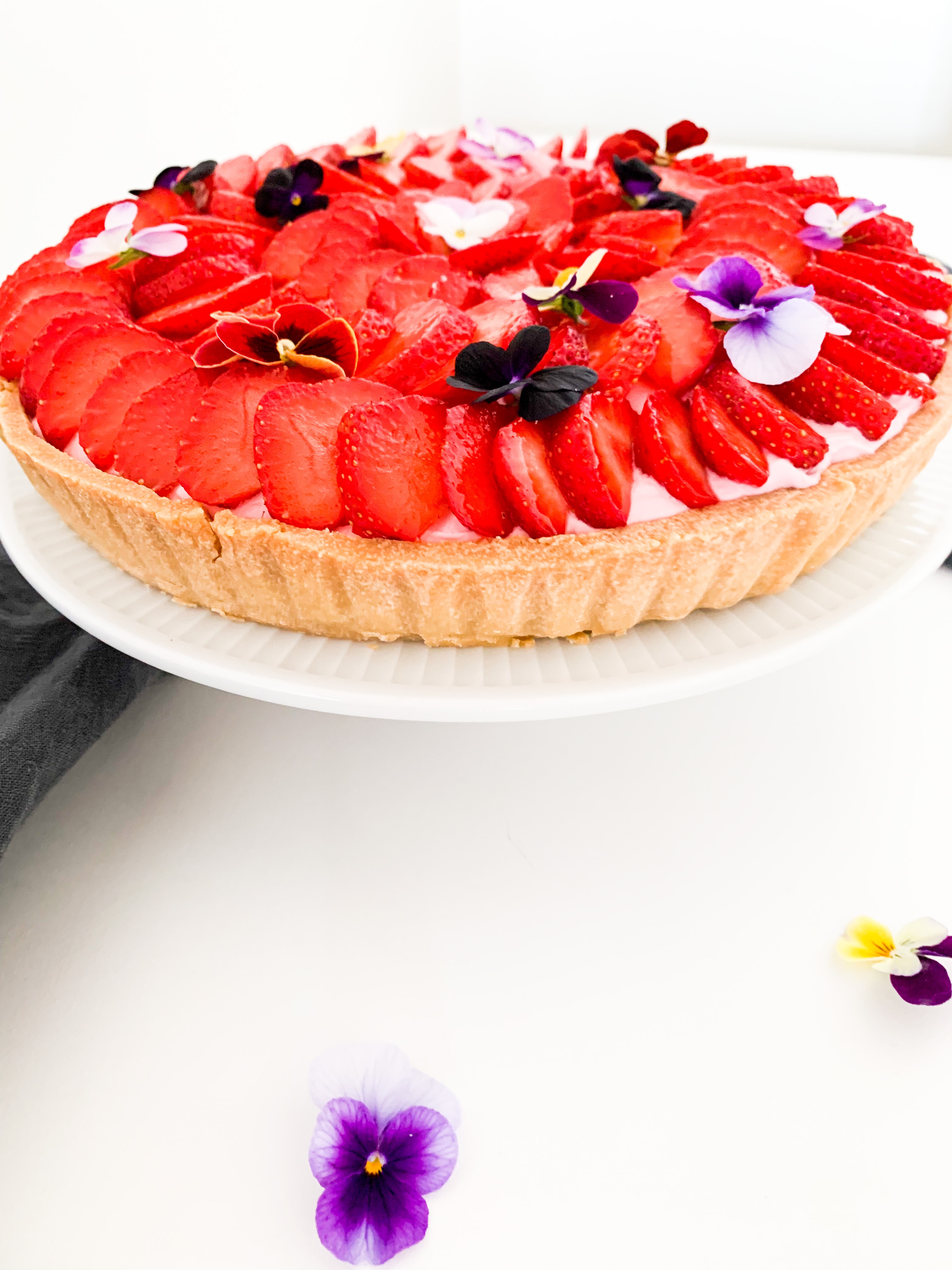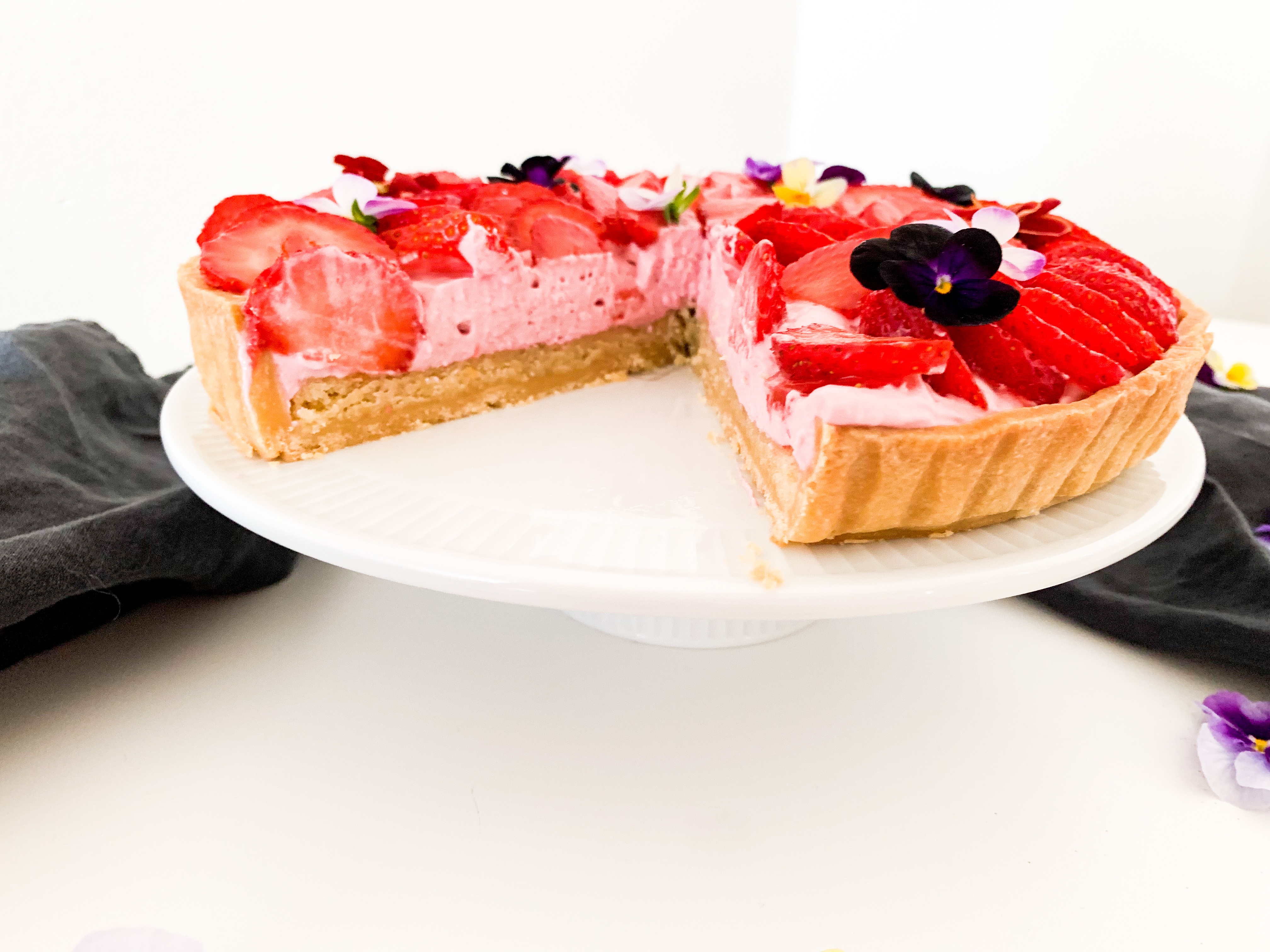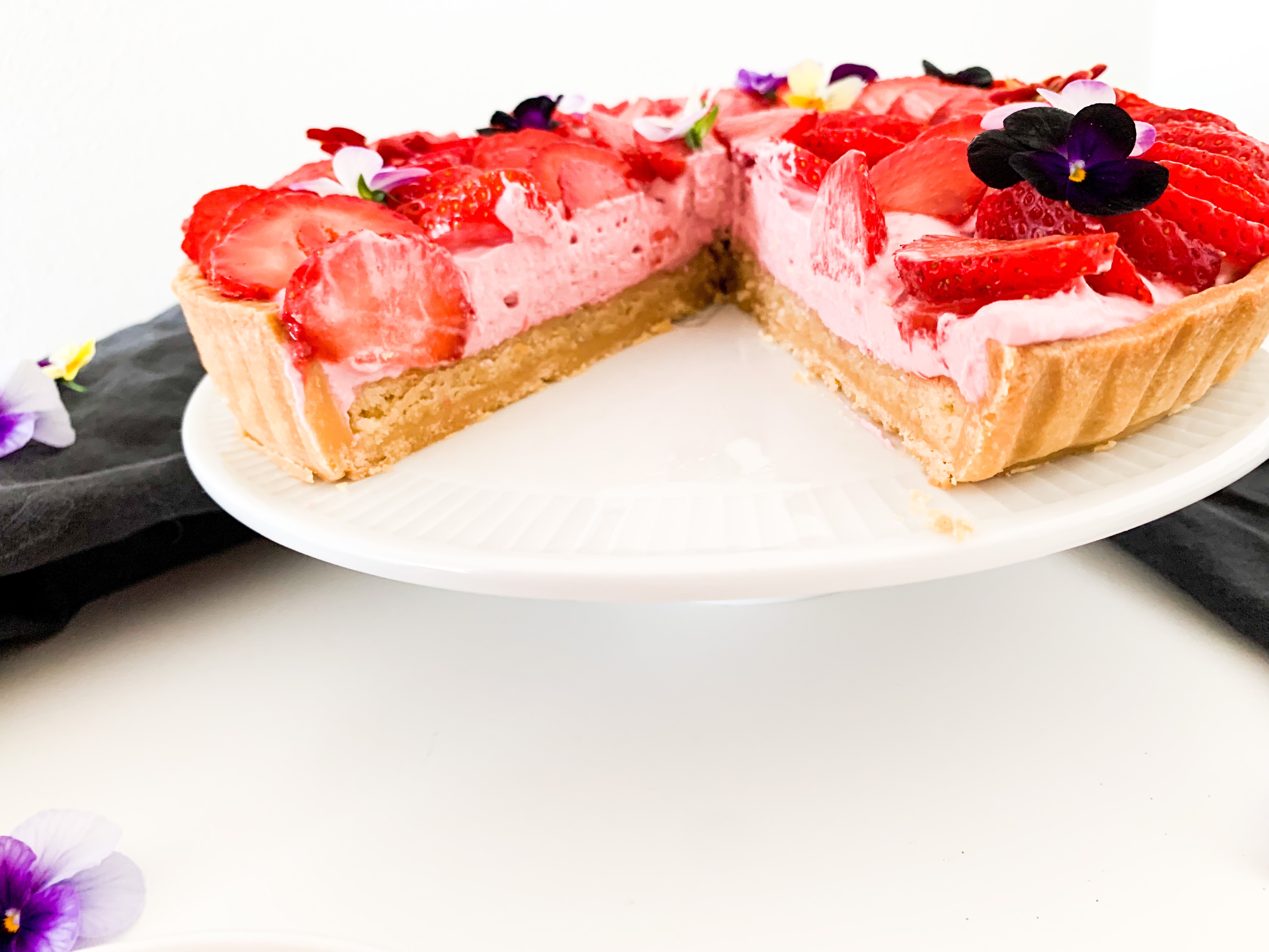 Spread the strawberry whip all over evenly and place beautiful the cut strawberries and some eatable flowers if you like.