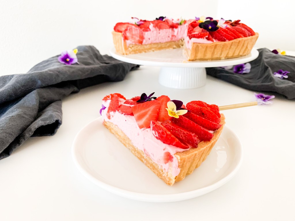 So that got me thinking what can I do with just the two boxes I had left! Decided to bake something easy that doesn’t take much time in the oven (because it’s SUPER warm here!) And the one thing I’ve wanted to bake for a while was a tart! So I thought ok let’s utilize what I have in the kitchen so I can use the few strawberries I have soooo I thought how about a tart with a pate sucre base (that’s just a fancy French word for a biscuit/cookie type base) an almond cream, topped with strawberry mascarpone whip! Oh and to decorate you can decorate with more strawberries 🍓🍓