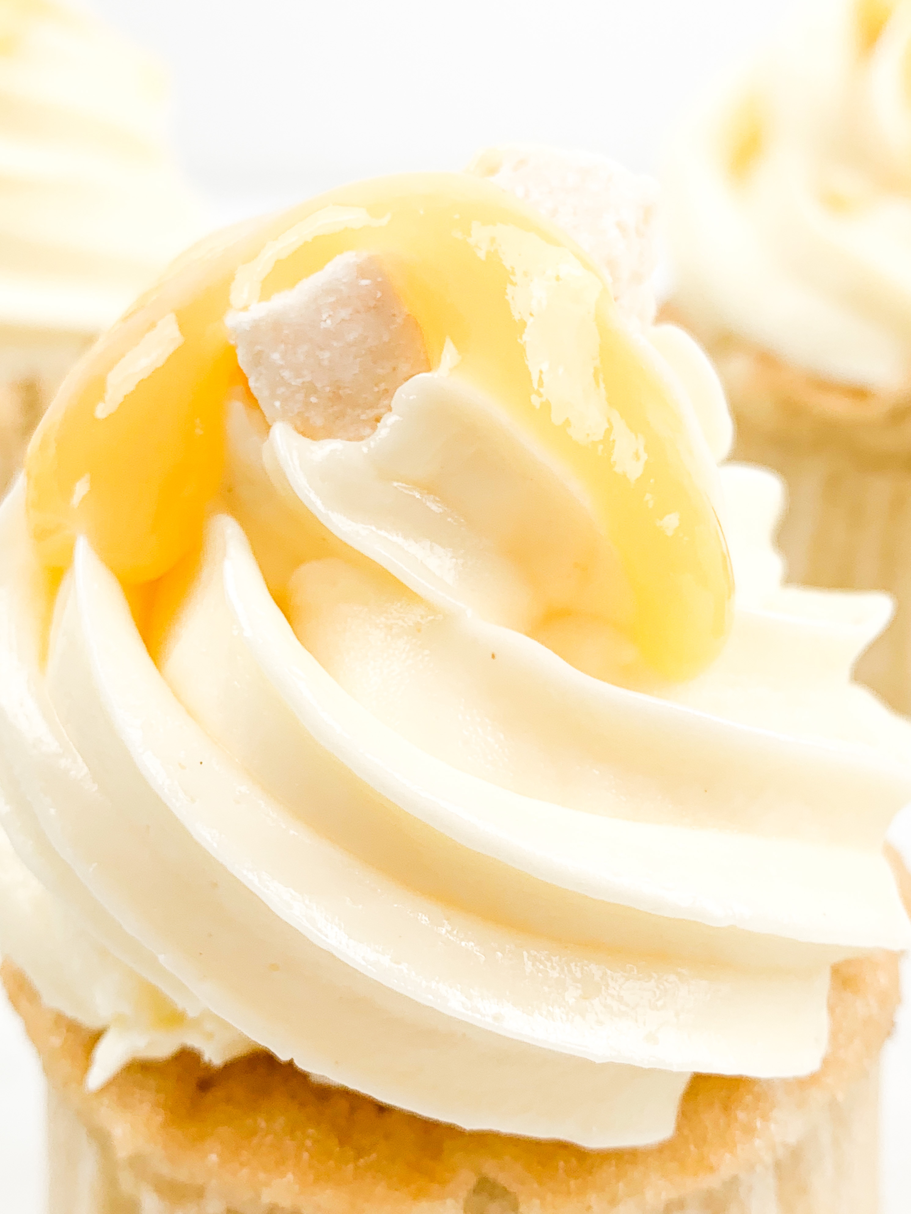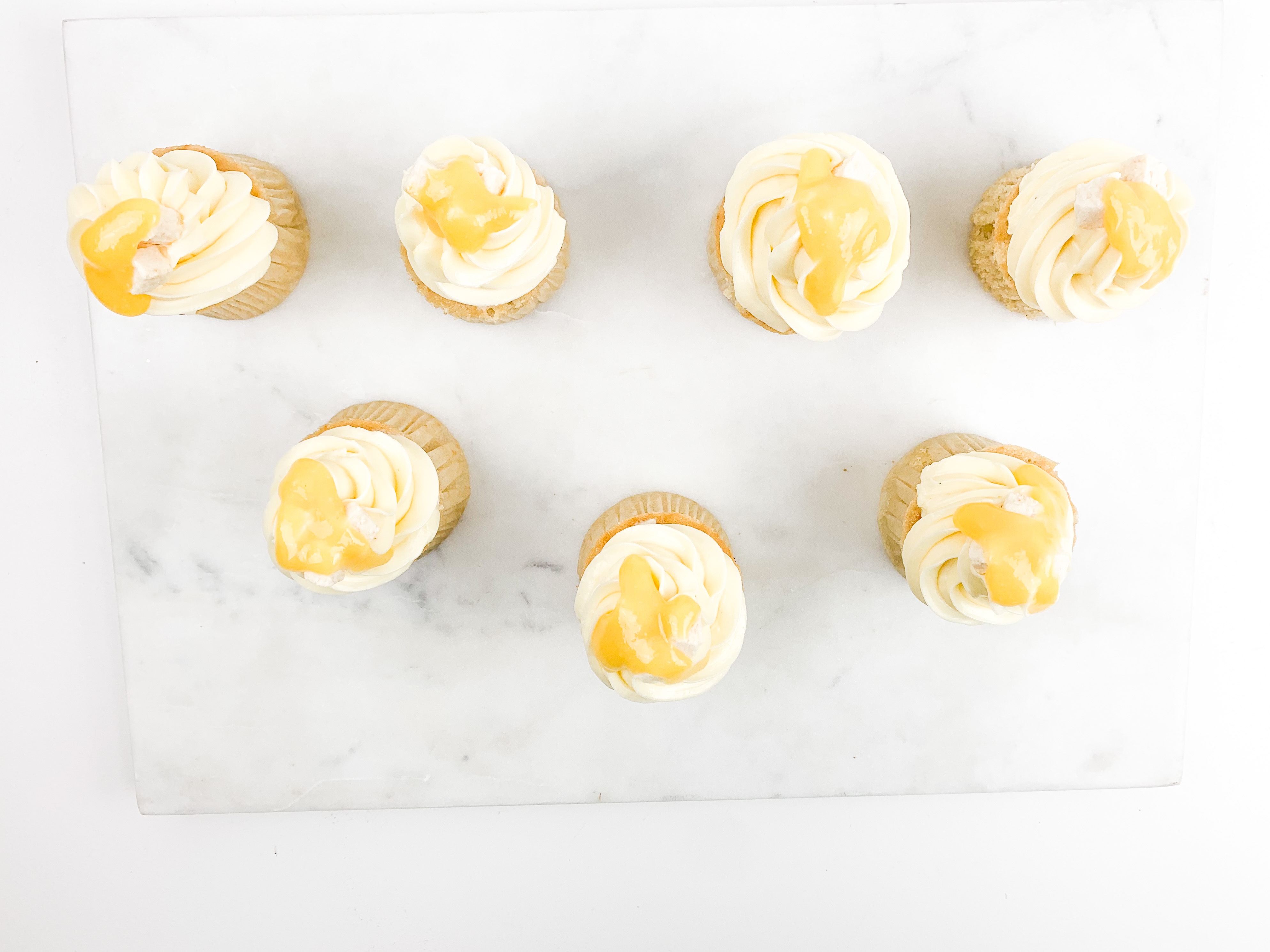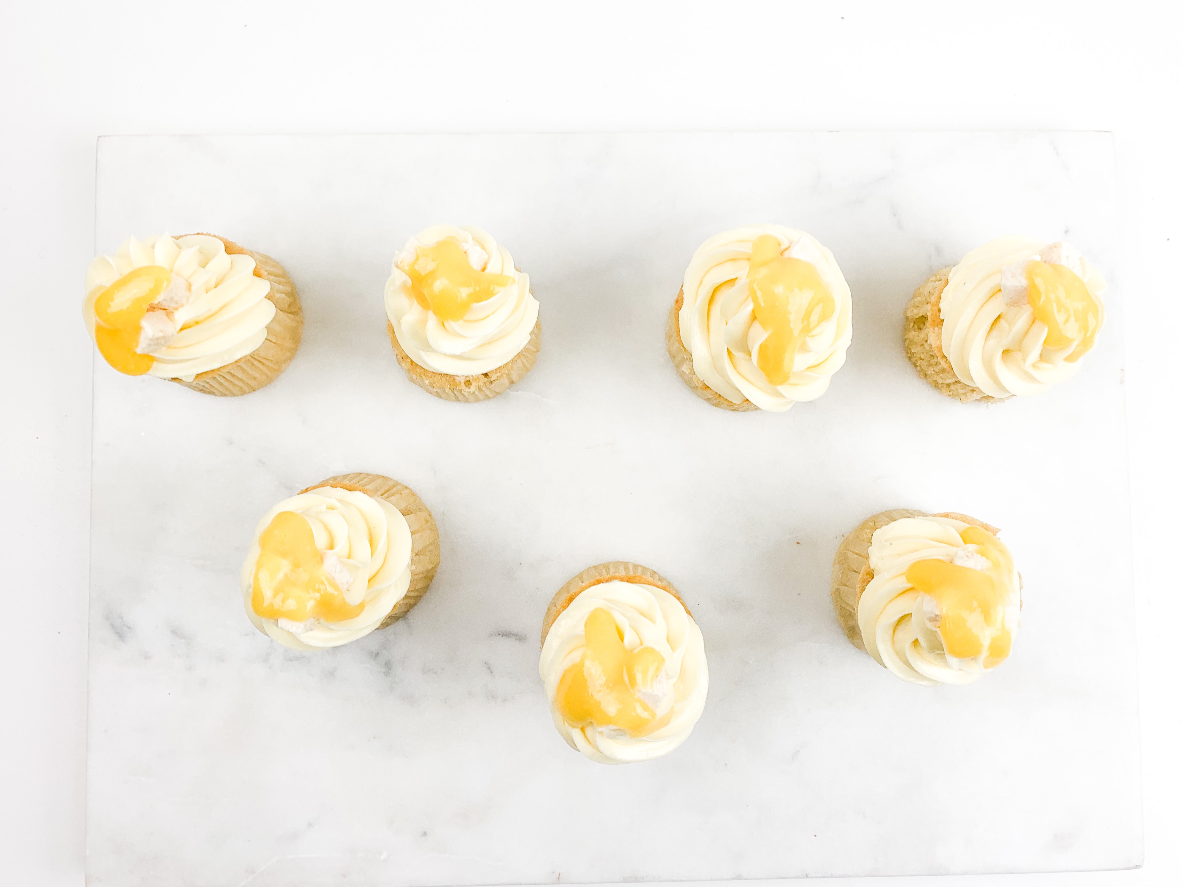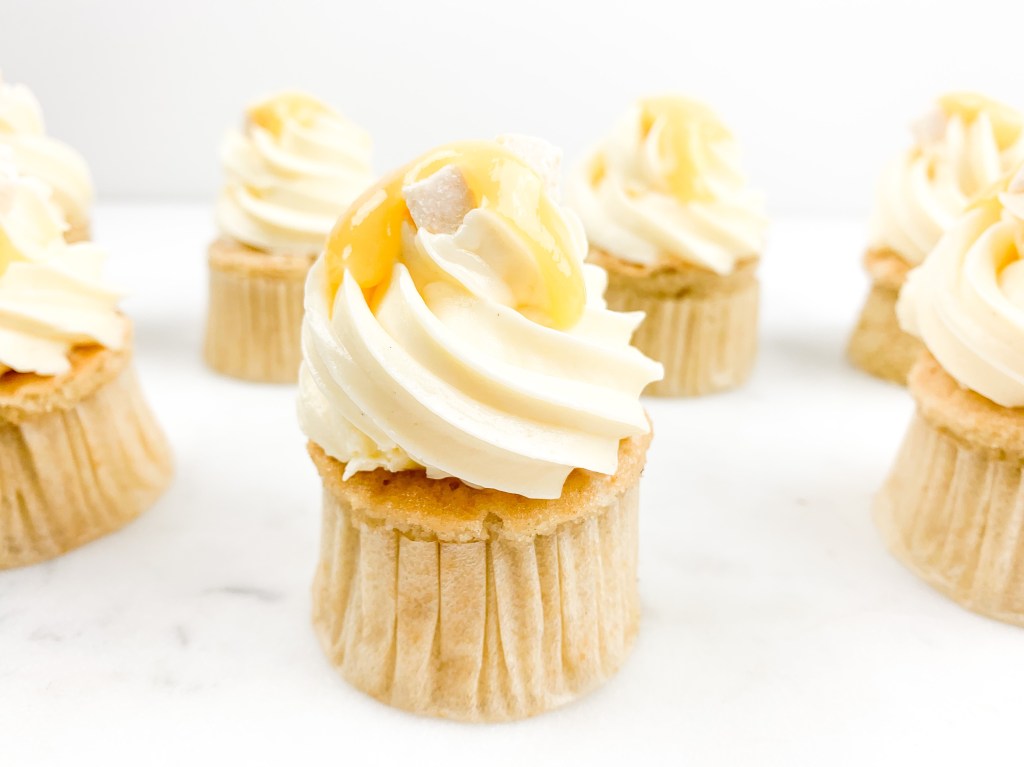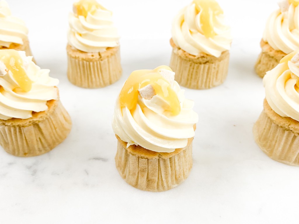 - Take your buttercream and pipe a beautiful swirl ontop. Decorate with a little drop of passionfruit curd and some coconut shavings.