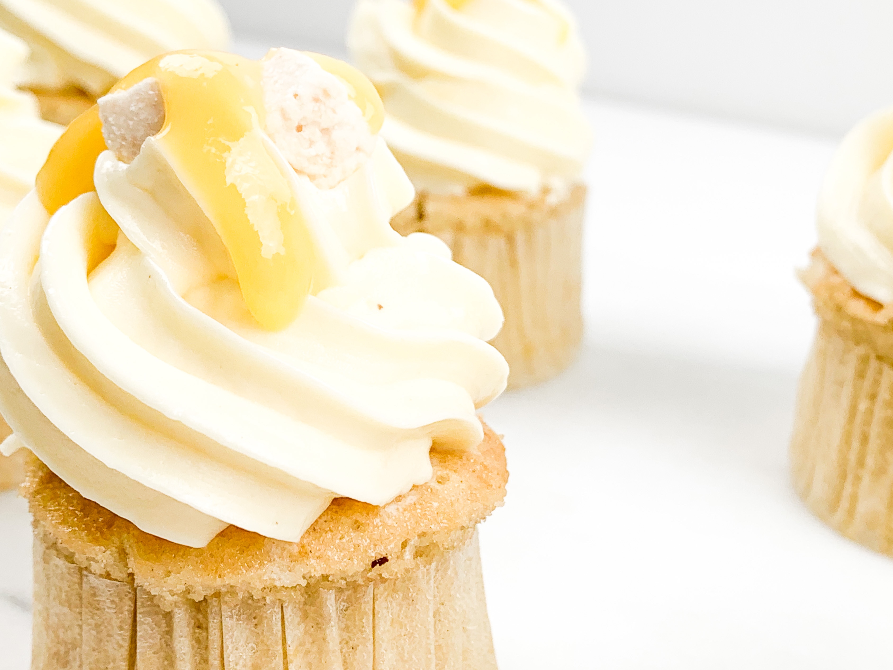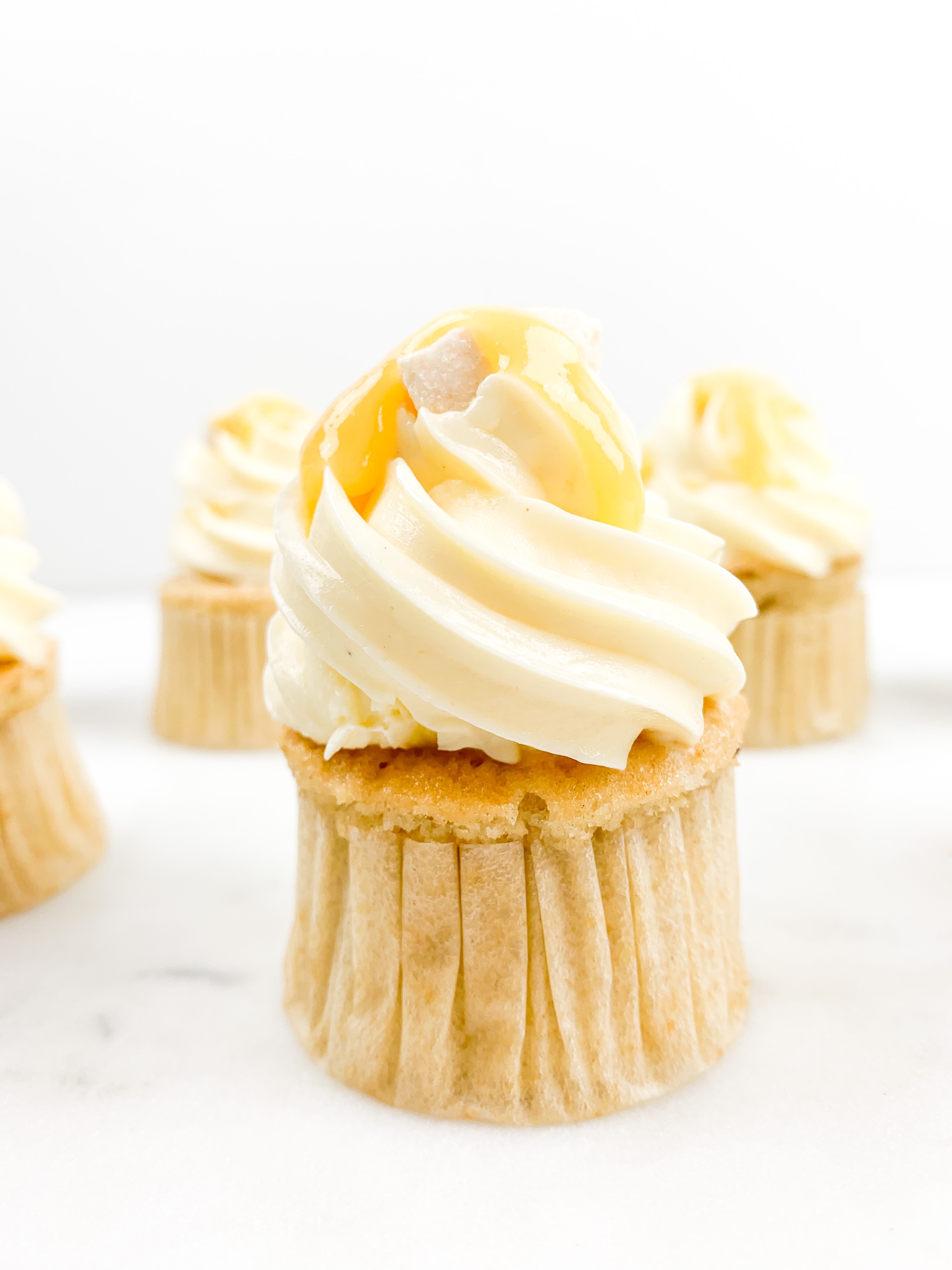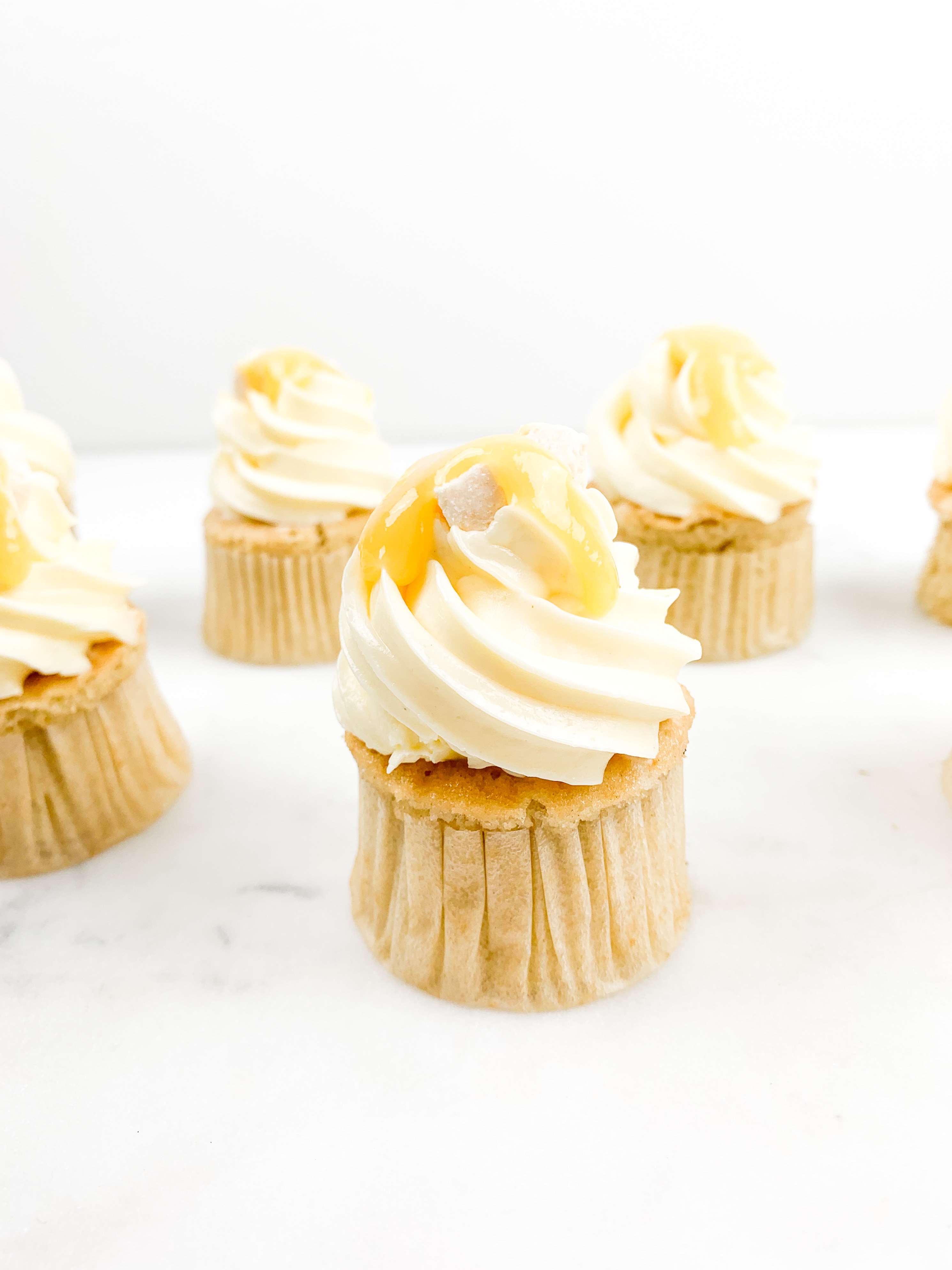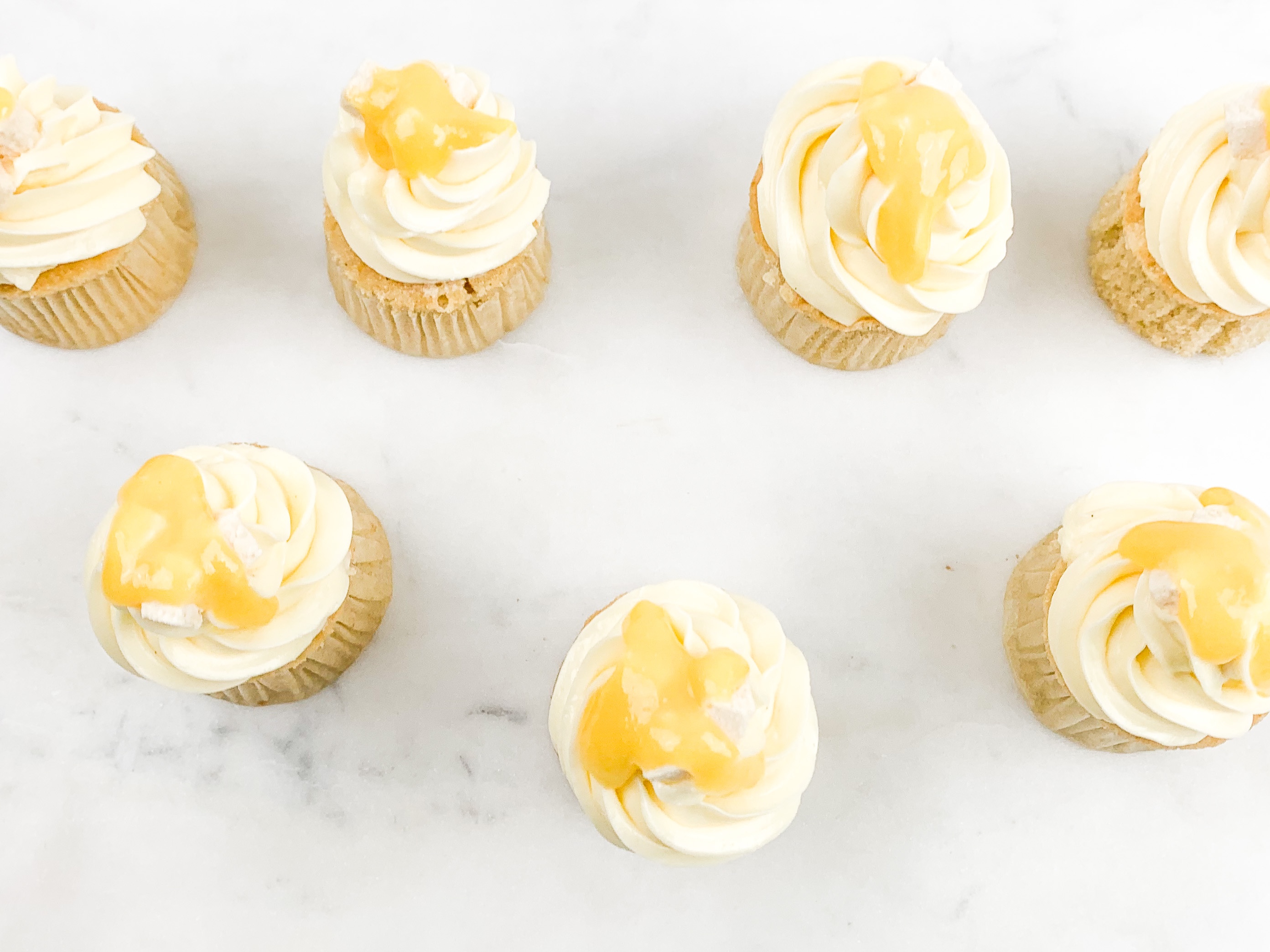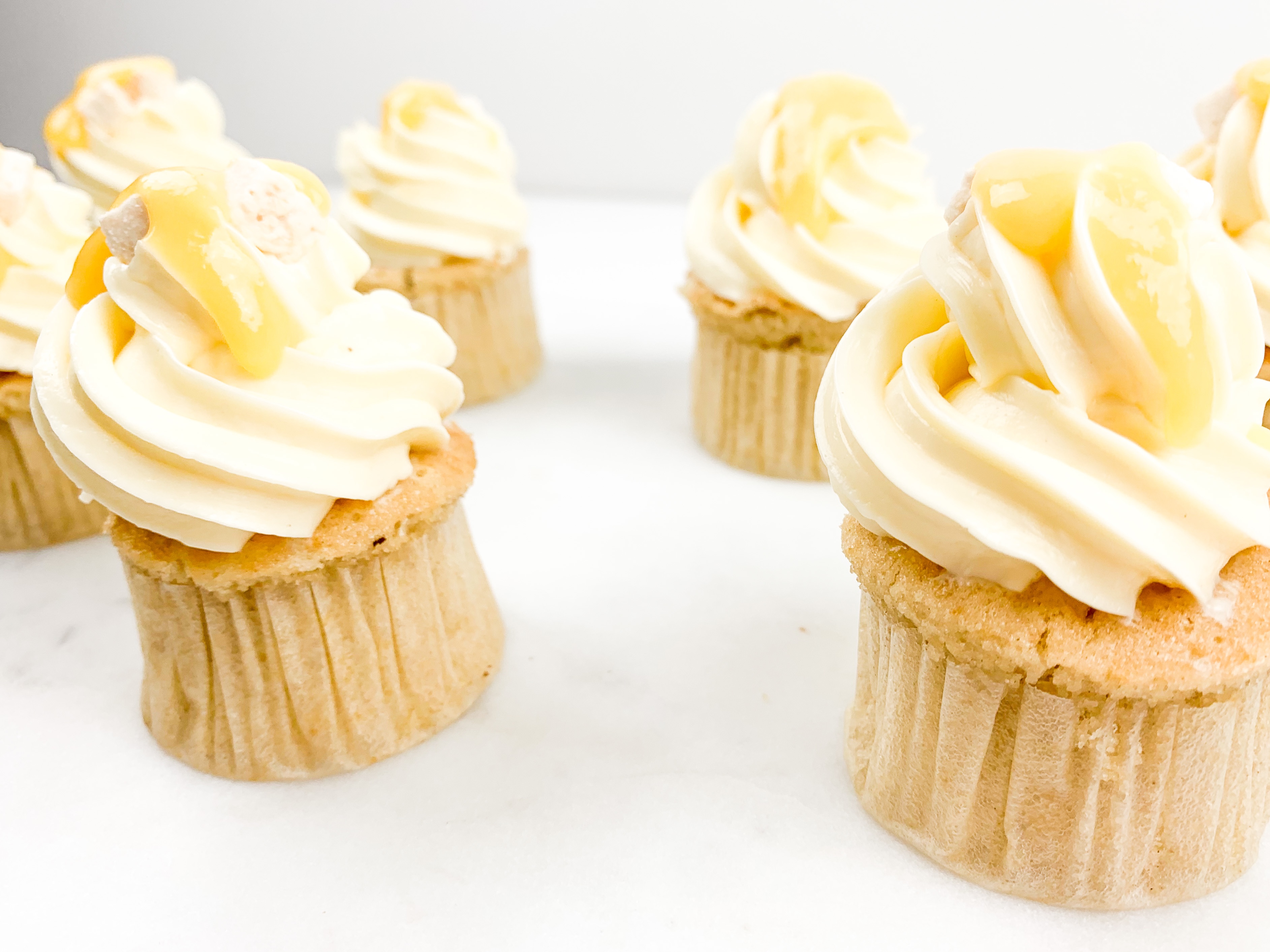 - Take your buttercream and pipe a beautiful swirl ontop. Decorate with a little drop of passionfruit curd and some coconut shavings.