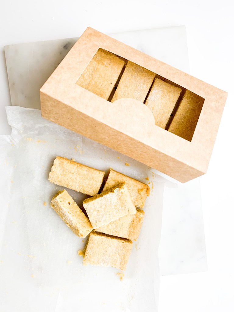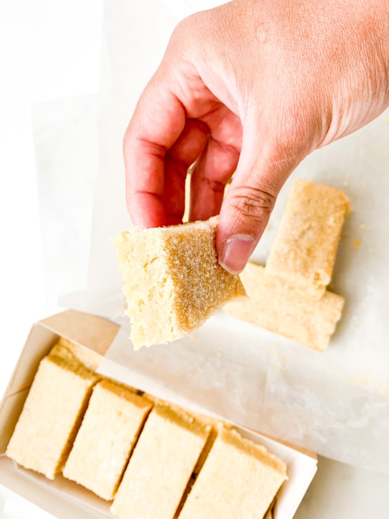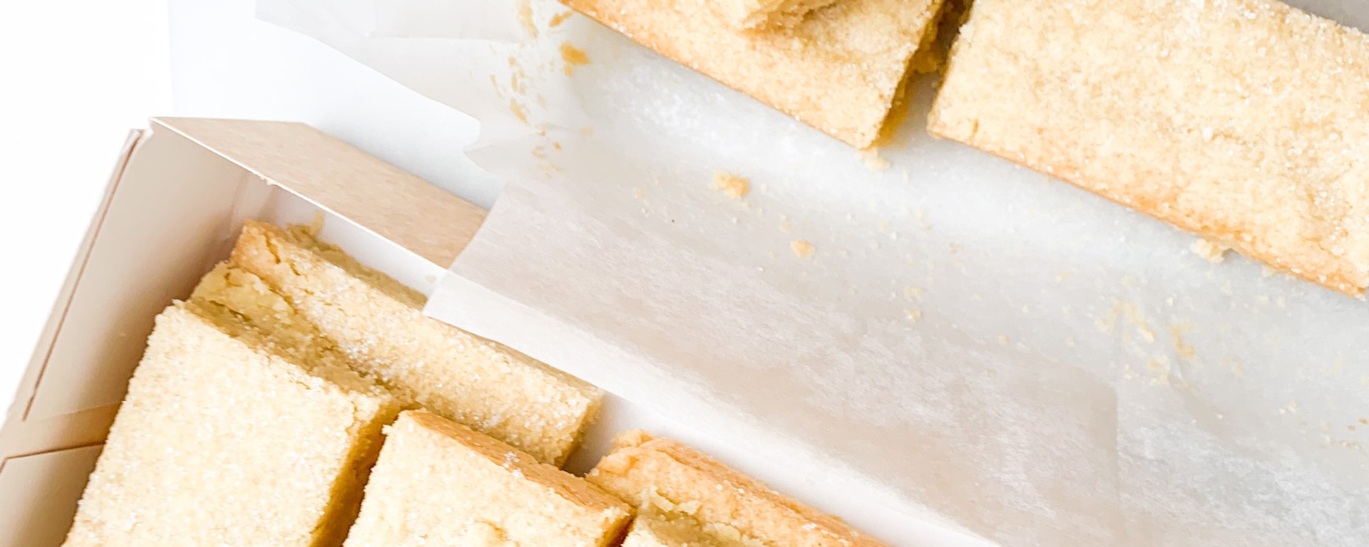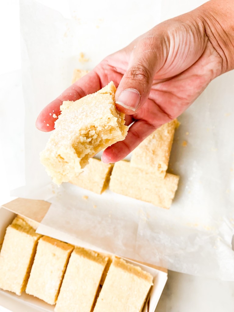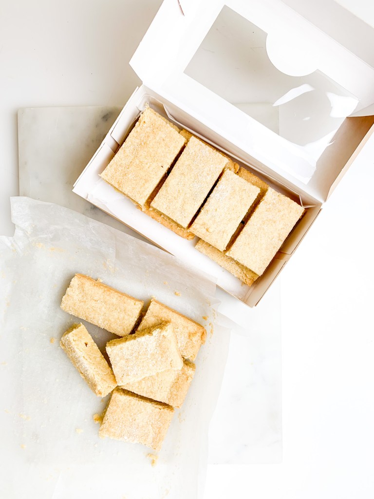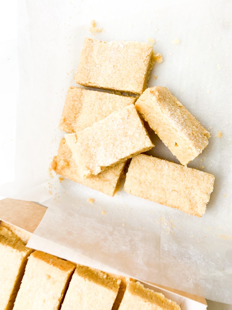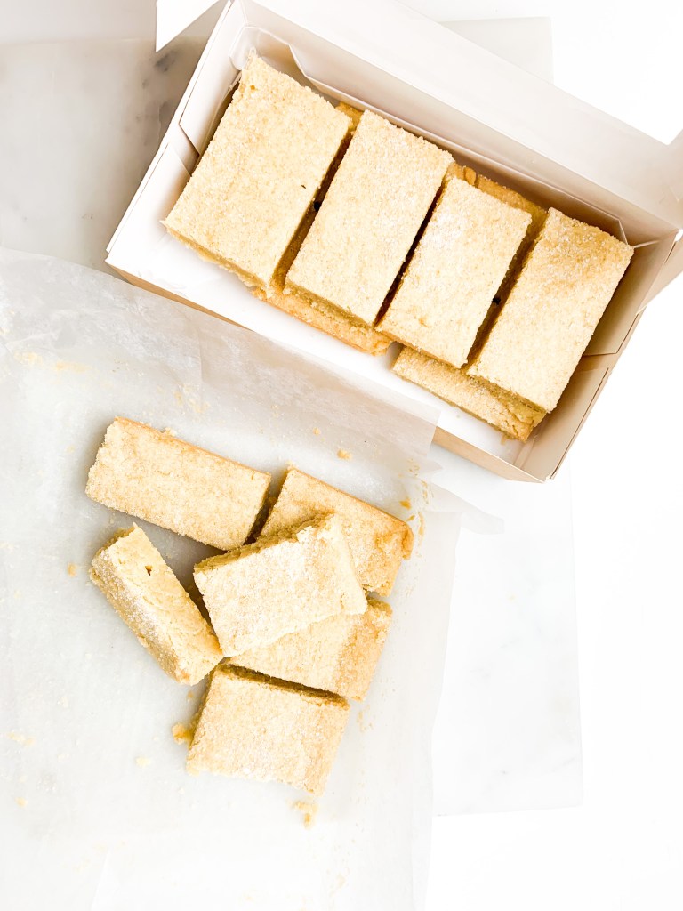 - Bake for 30 min, until just golden brown. Take out and sprinkle some sugar on top of the bake. Let cool completely (takes roughly 30 min) and then slice into rectangles.