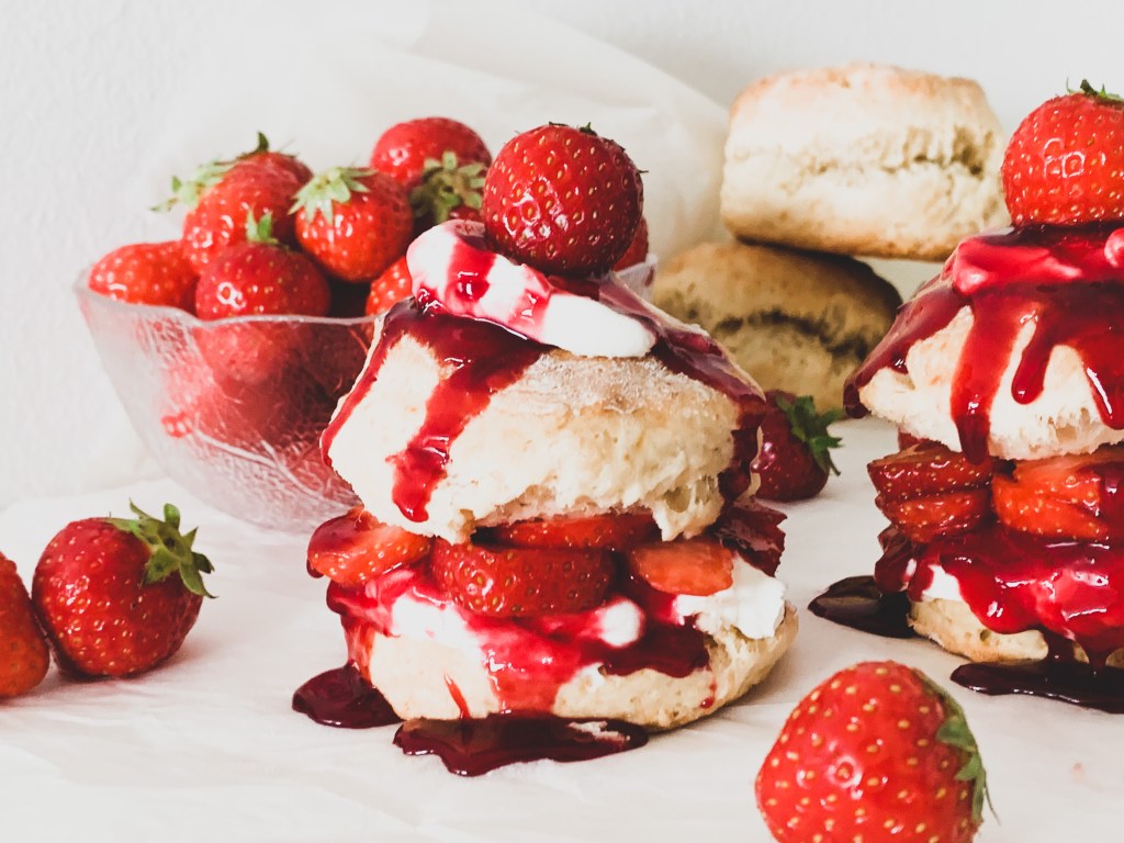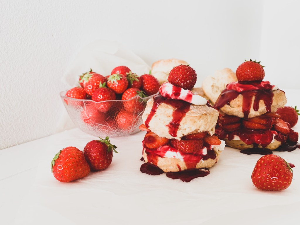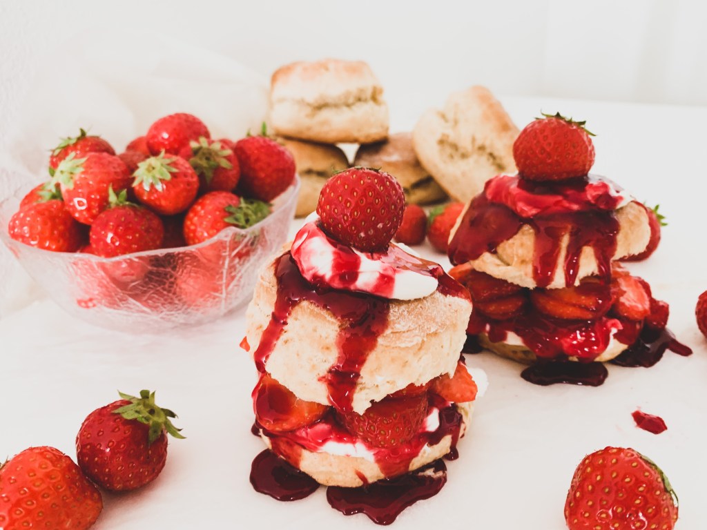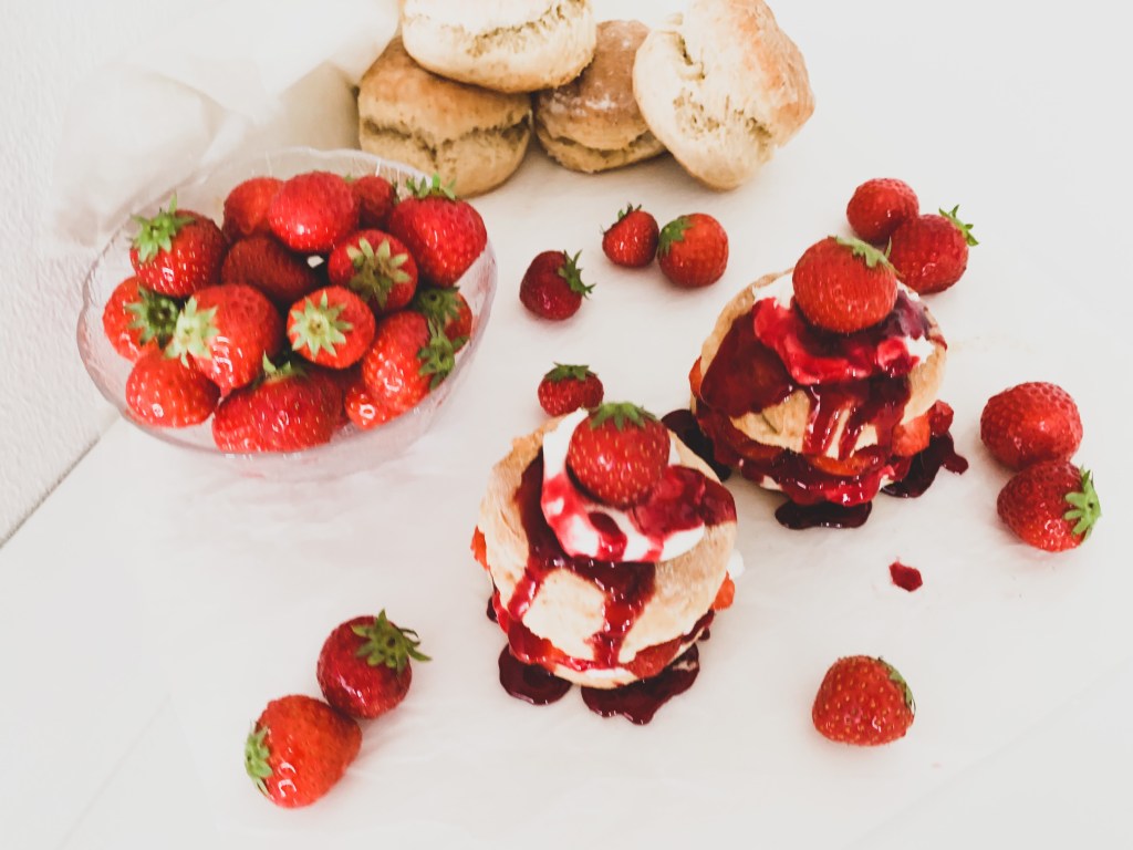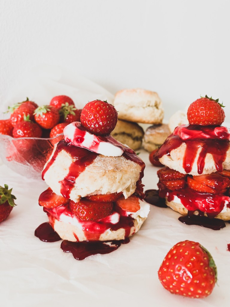 - Take a scone and open it up (if you baked them correctly there should be a natural split part that when you open it with your hands it breaks open perfectly) place two large spoons of mascarpone whip then drizzle the compote on and top with fresh sliced strawberries. Too with the lid of the scone add a tiny dollop of cream and compote and decorate with a tiny strawberry.