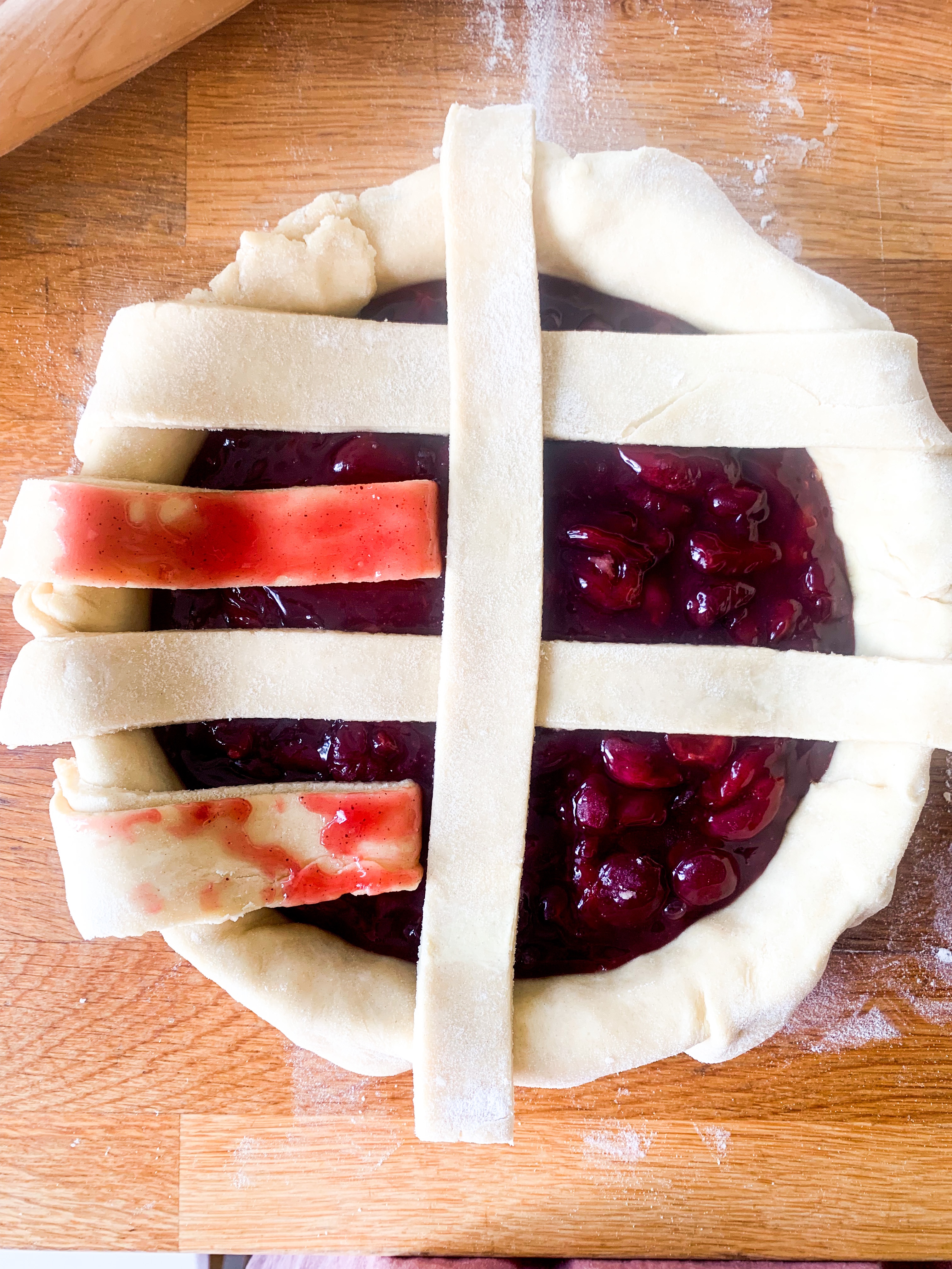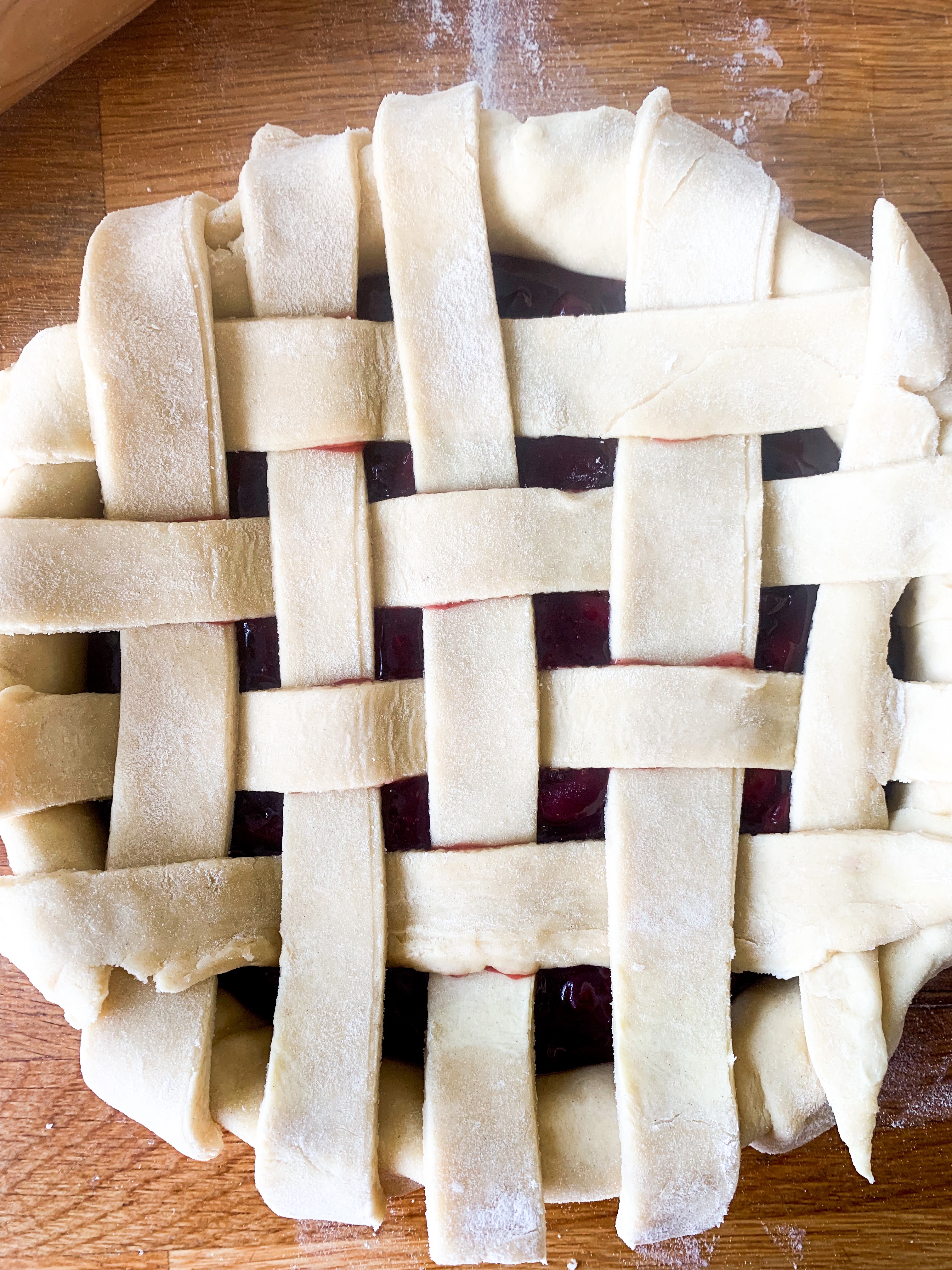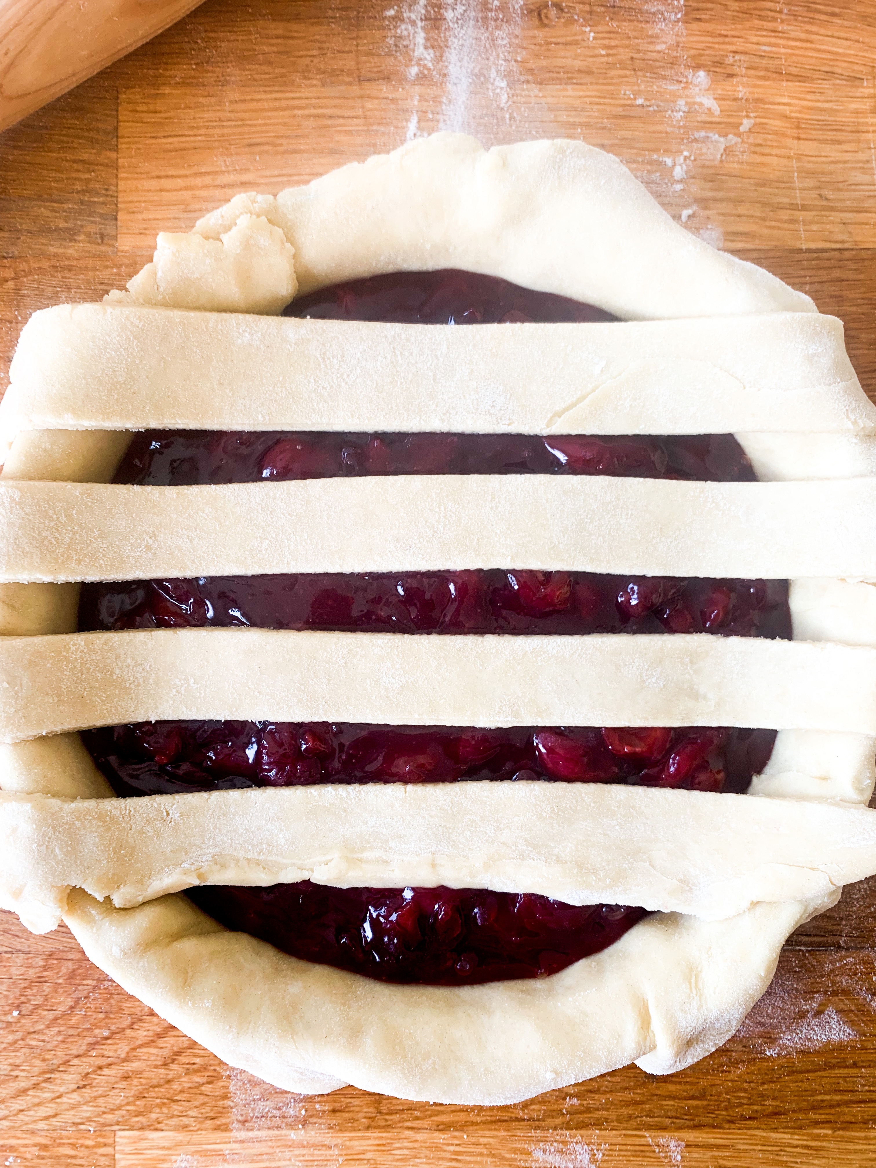 - Roll out the second dough as big as the pie dish. Then cut 8 equal strips. Place four strips over the pie and then lift two and place one strip across. Fold back the two strips and place another strip across. Look below for how to make the pattern. Fold over the edges and crimp with your fingers.