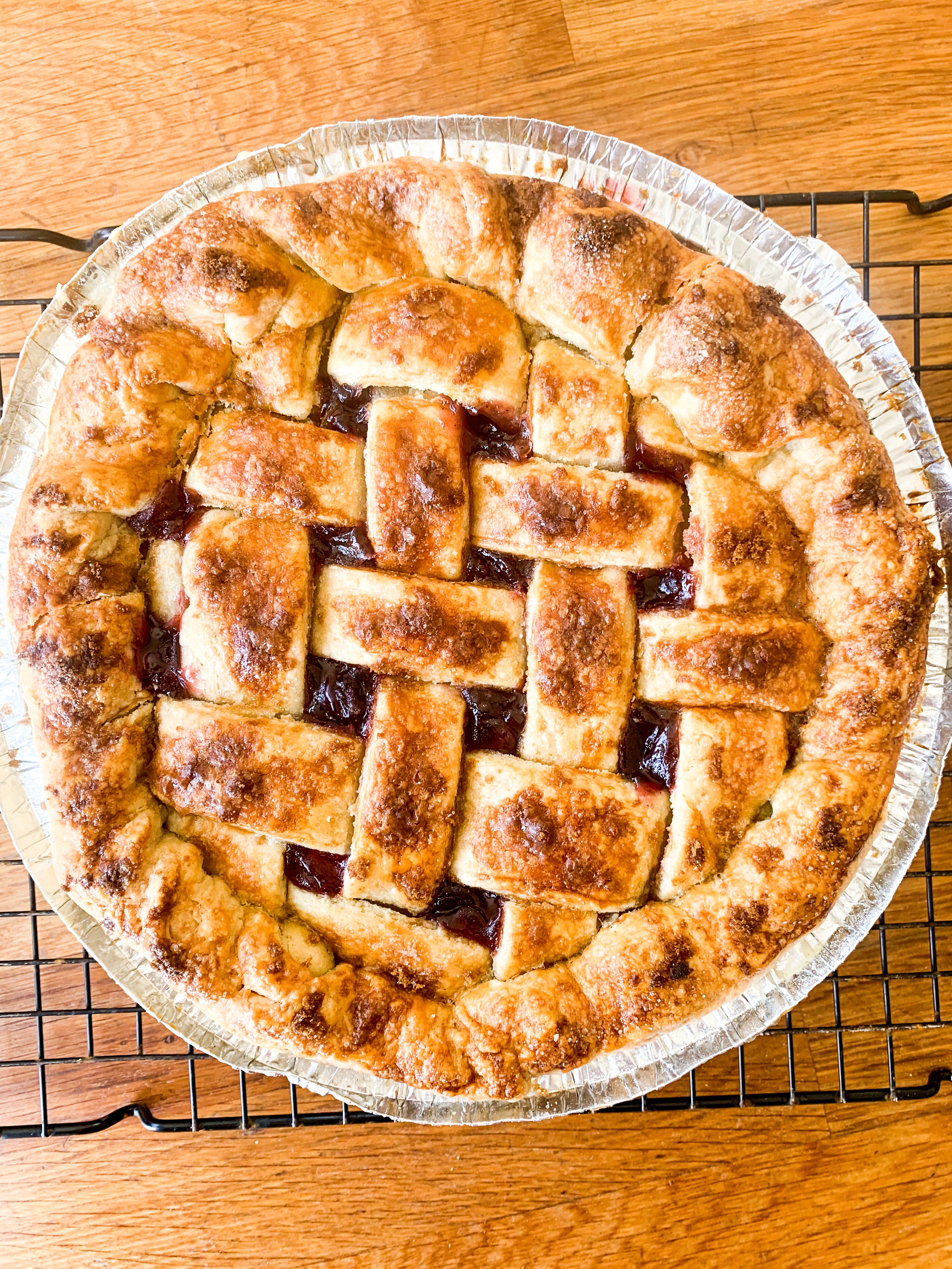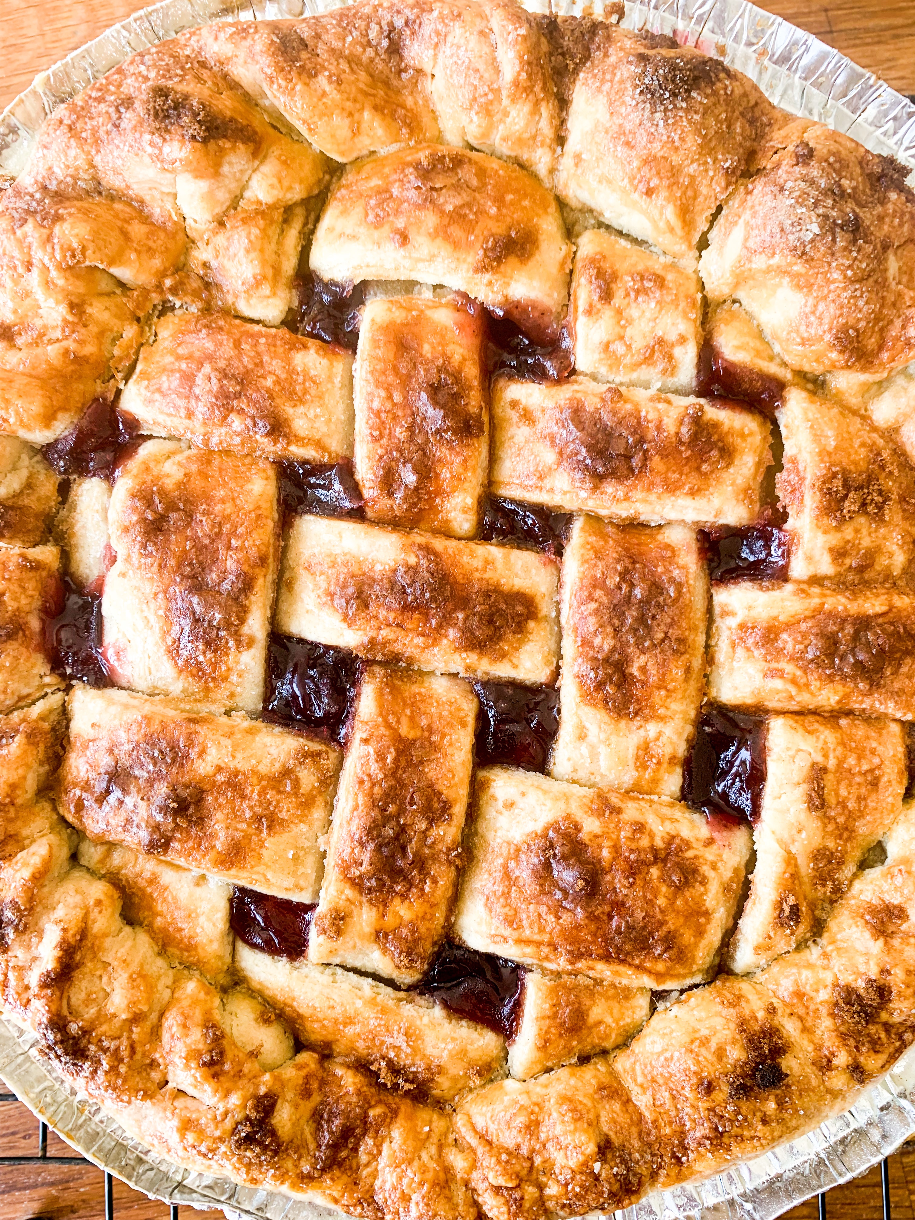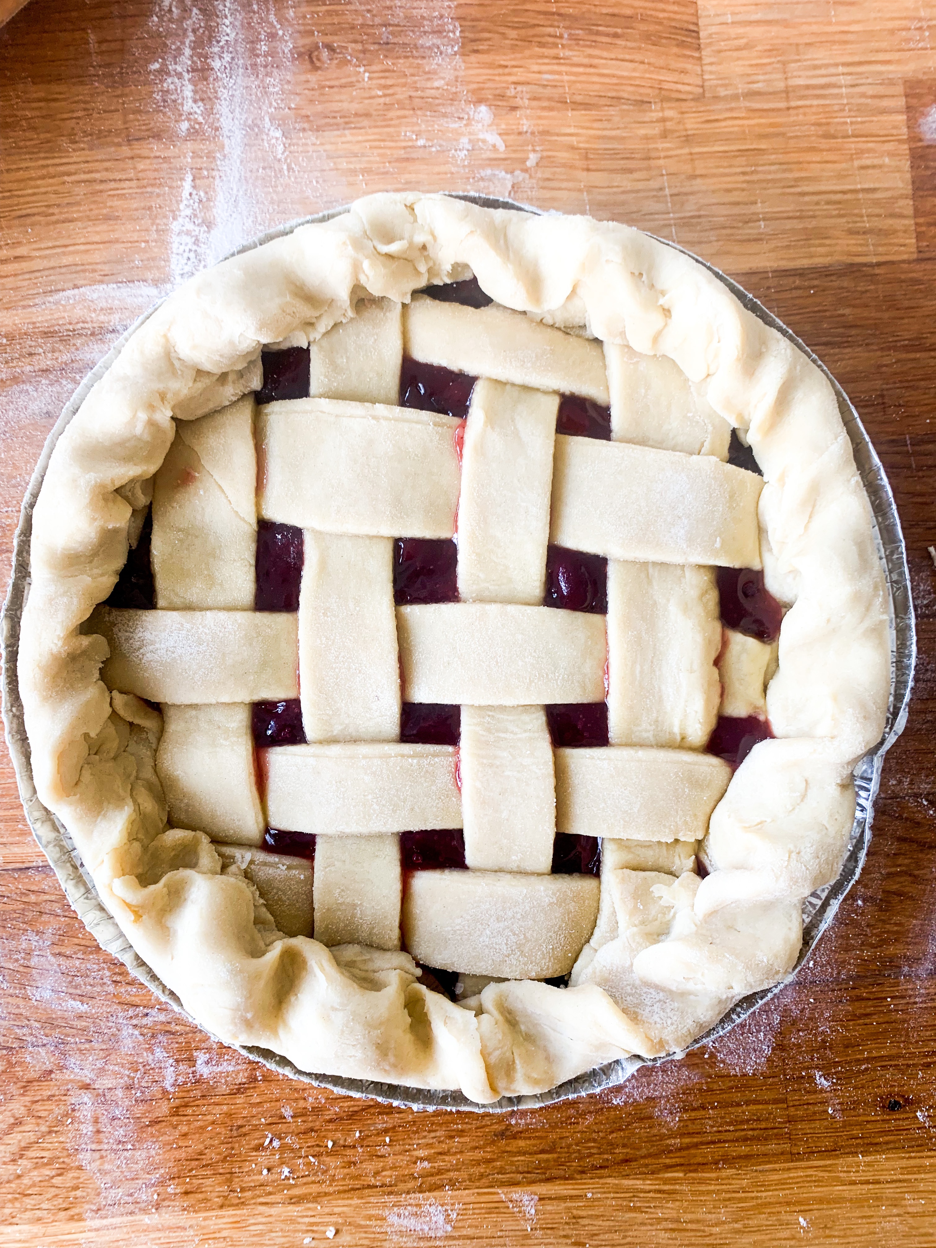 - Roll out the second dough as big as the pie dish. Then cut 8 equal strips. Place four strips over the pie and then lift two and place one strip across. Fold back the two strips and place another strip across. Look below for how to make the pattern. Fold over the edges and crimp with your fingers.
