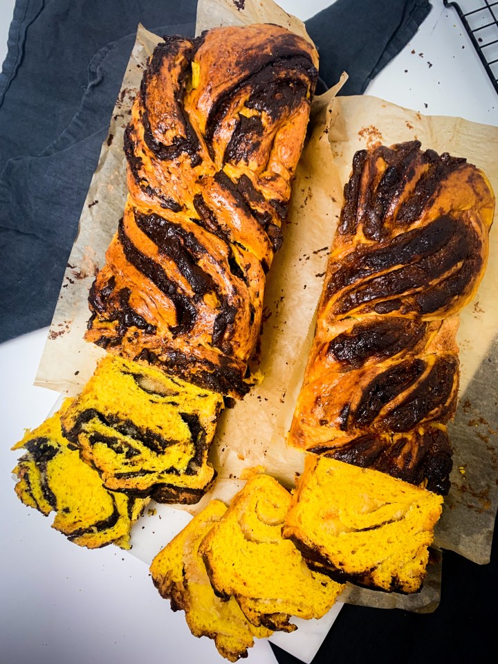 - Preheat the oven to 190 C°. Brush with egg wash and Bake the Babka’s in the center of the oven for about 40-45 min, until puffed and well browned. Let cool slightly, then use the parchment paper to lift the babkas out of the pans and onto a rack set over a baking sheet.