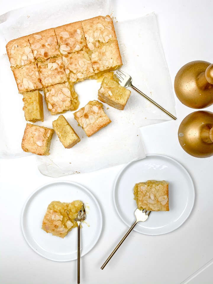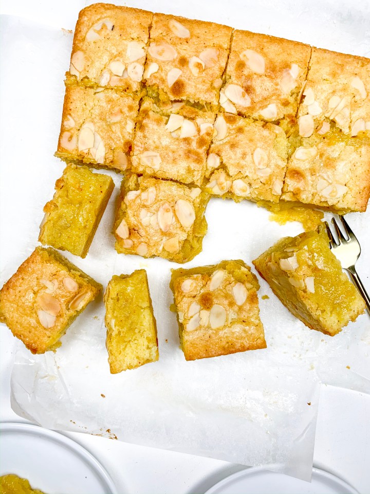 - Take it out the oven and let us rest for 20 min before cutting into it (it will be super gooey if you straight away so you’ve got to let the mixture set in first) – you could also keep the cake in the fridge for a couple of hours before serving 🙂