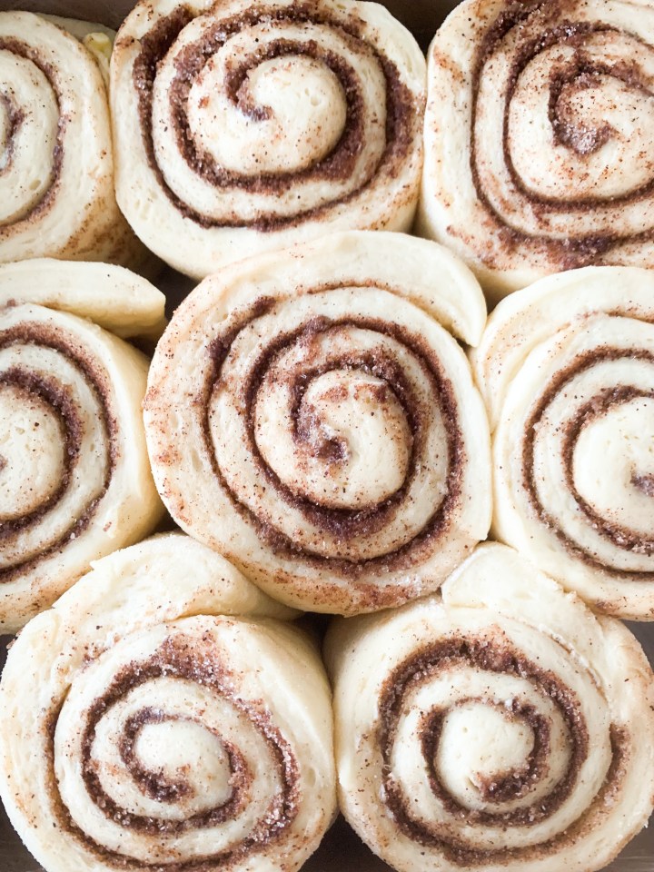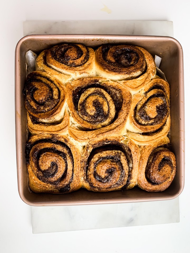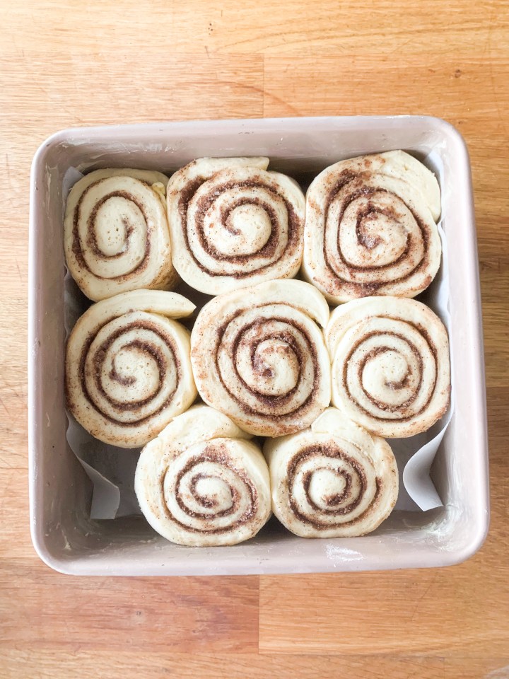 - Place cinnamon rolls in a greased 9×9 inch baking pan or round 9 inch cake pan. (I also recommend lining the pan with parchment paper as well, in case any of the filling ends up leaking out.) Cover with plastic wrap and a warm towel and let rise again for 30 minutes.