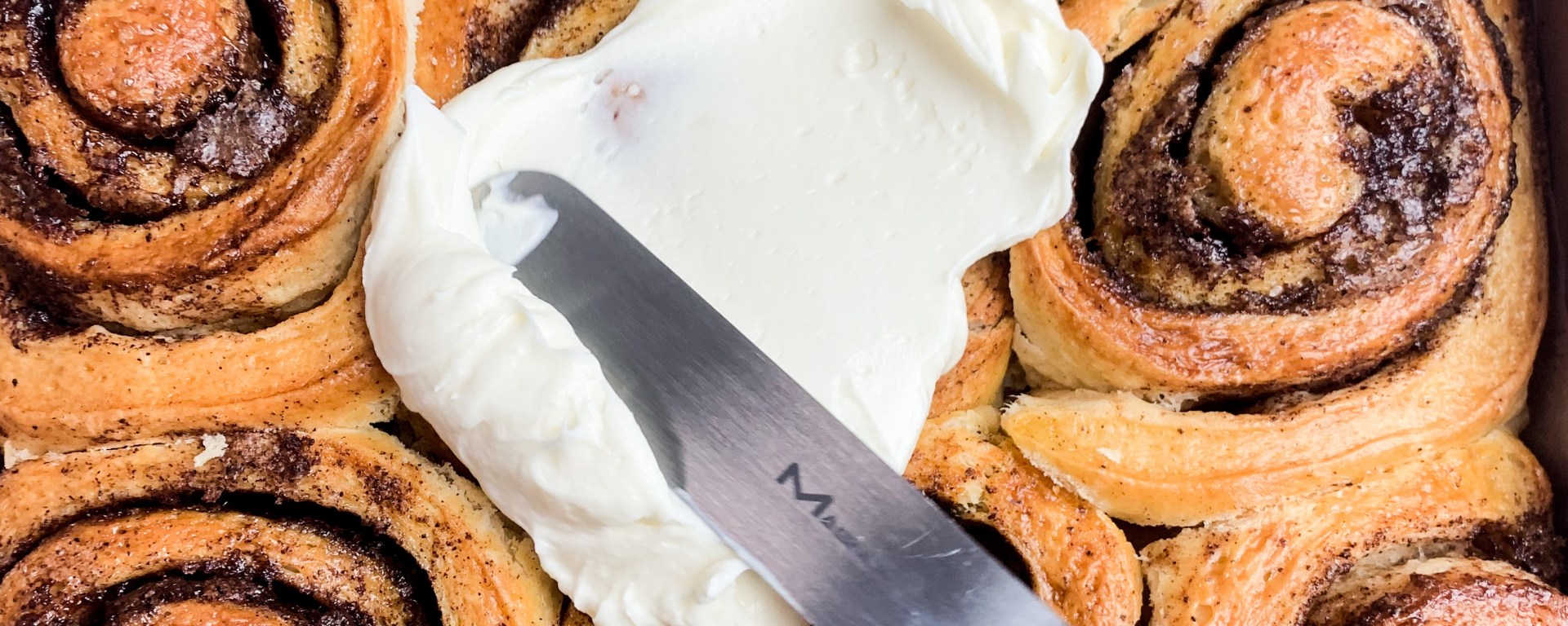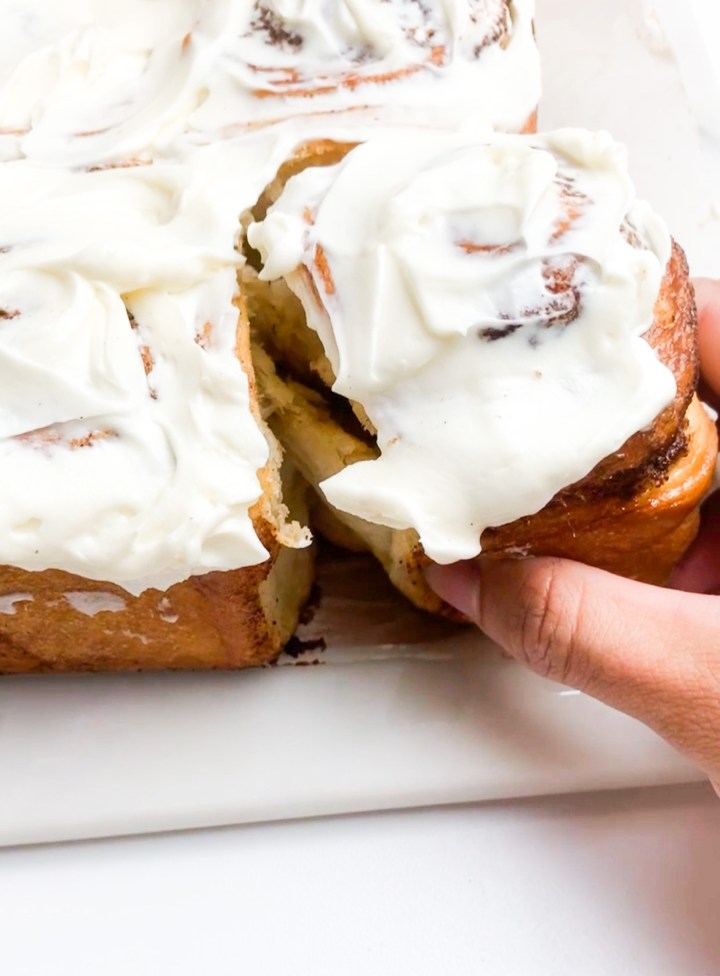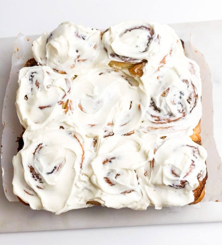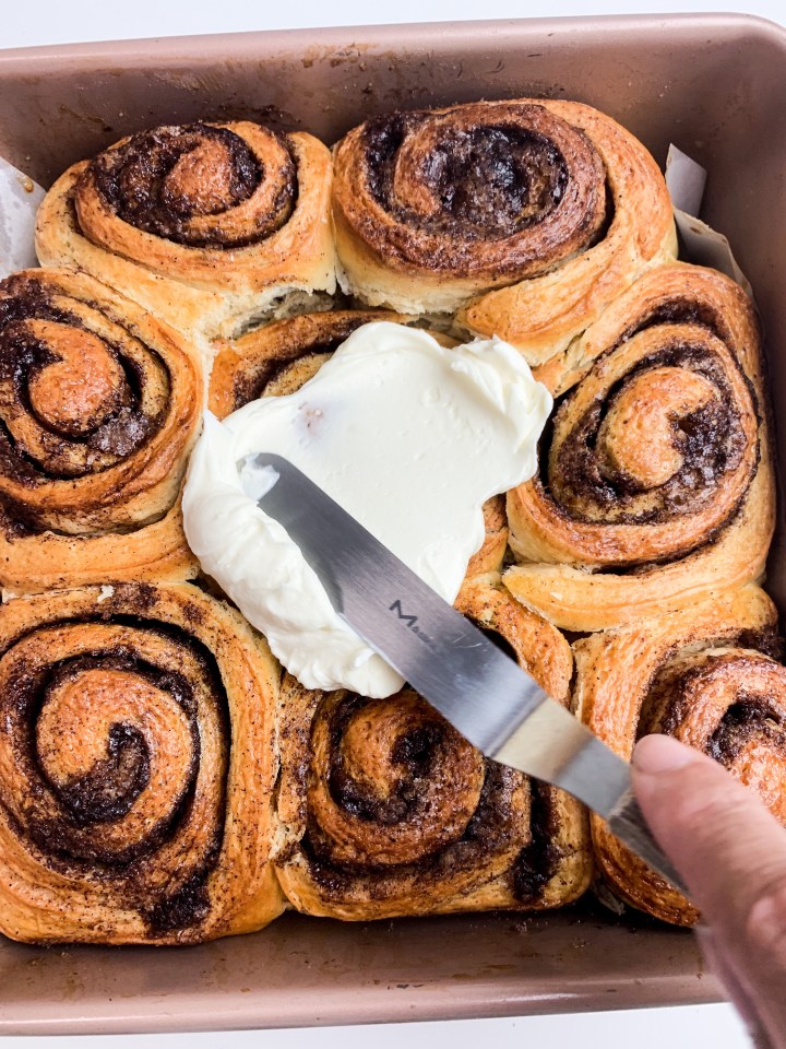 - While they wait to cool off a little, make your cream cheese frosting by adding all ingredients into a bowl and whisking on high for 4 minutes. Spread over the cooled cinnamon rolls. And enjoy!