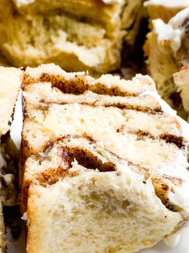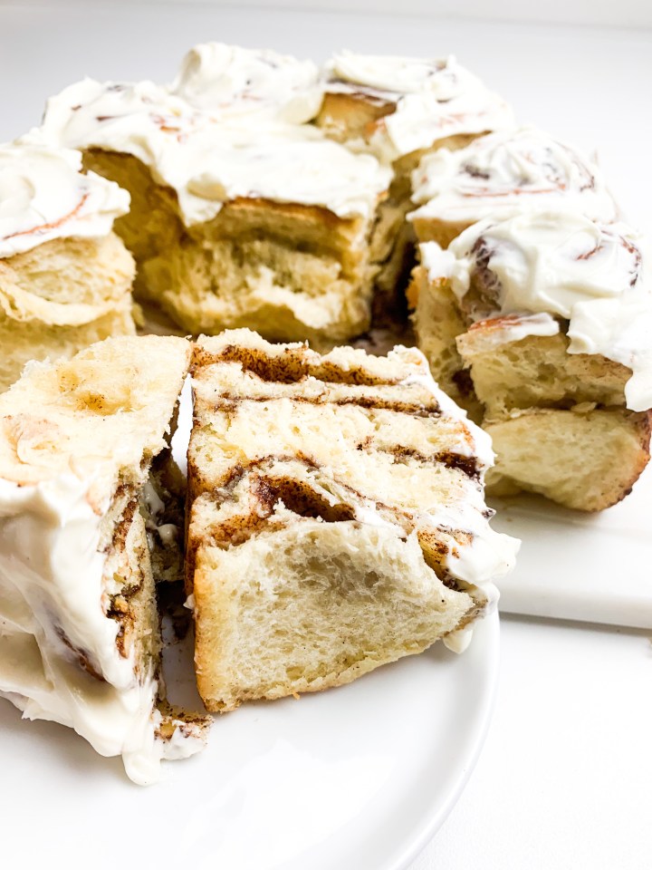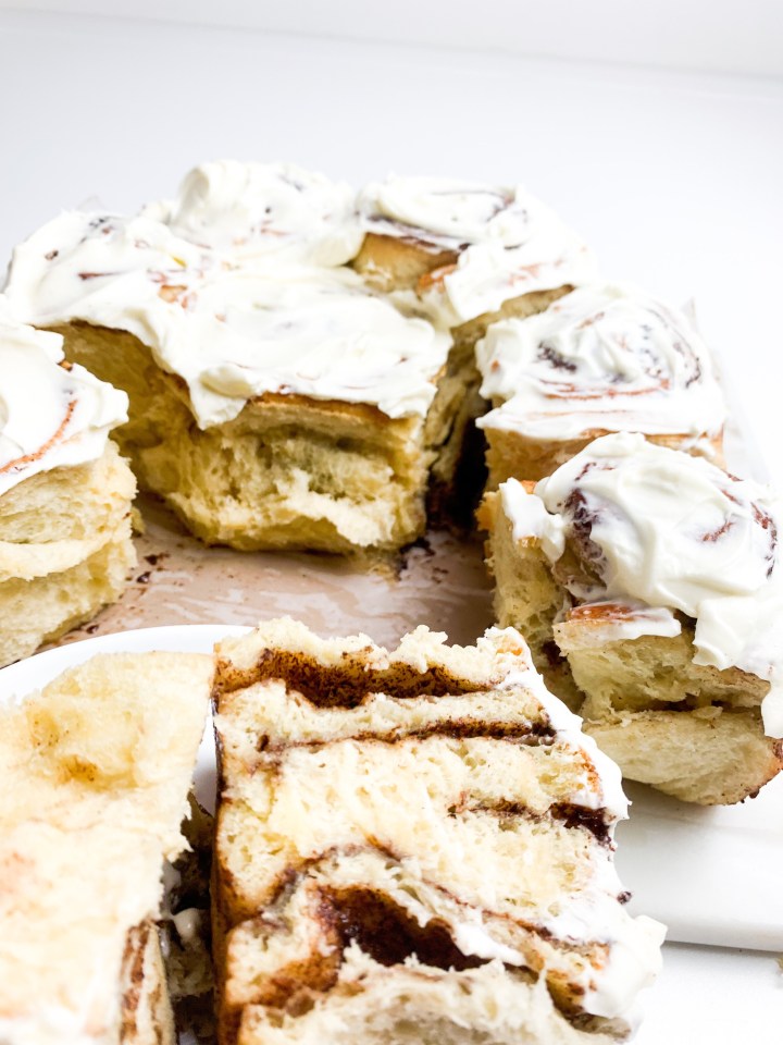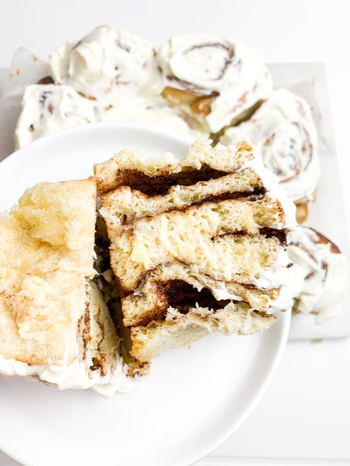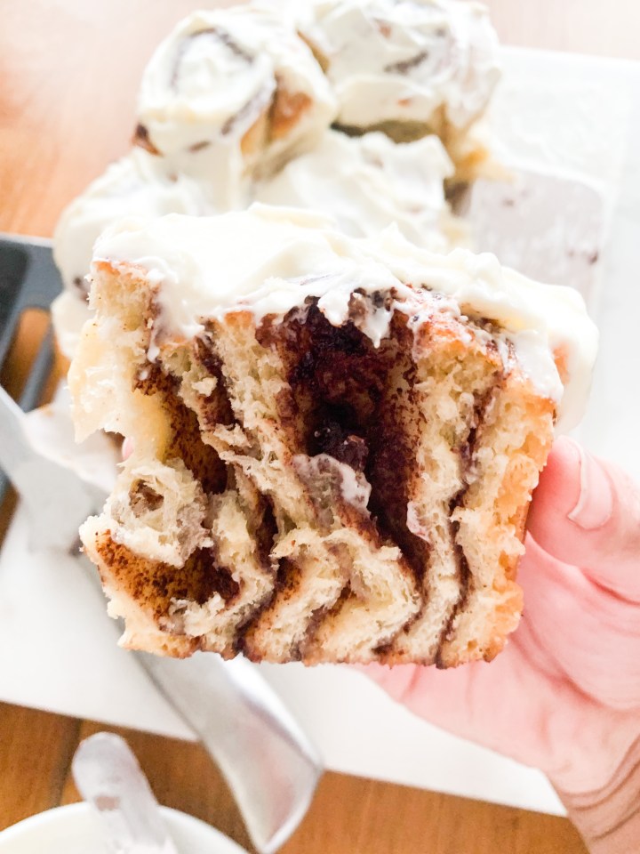 - While they wait to cool off a little, make your cream cheese frosting by adding all ingredients into a bowl and whisking on high for 4 minutes. Spread over the cooled cinnamon rolls. And enjoy!