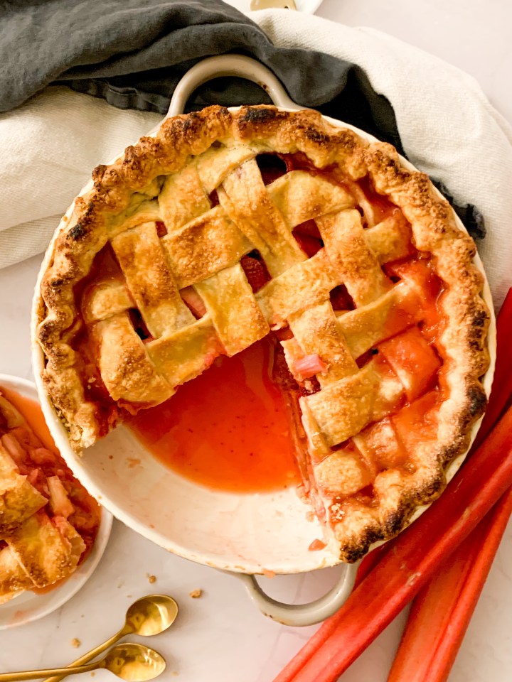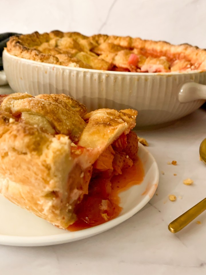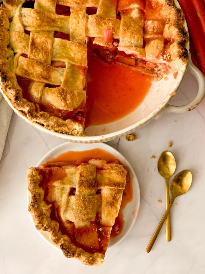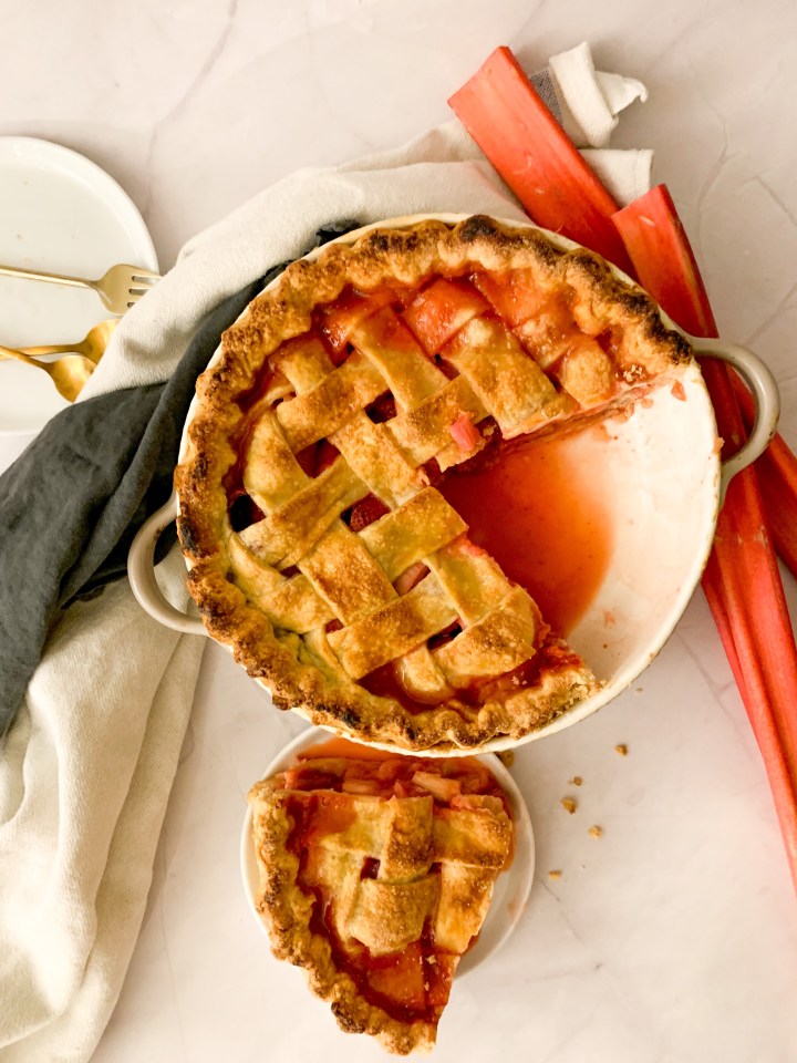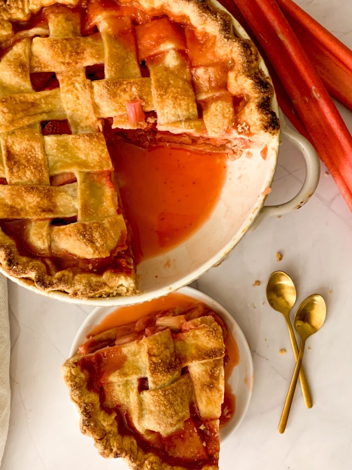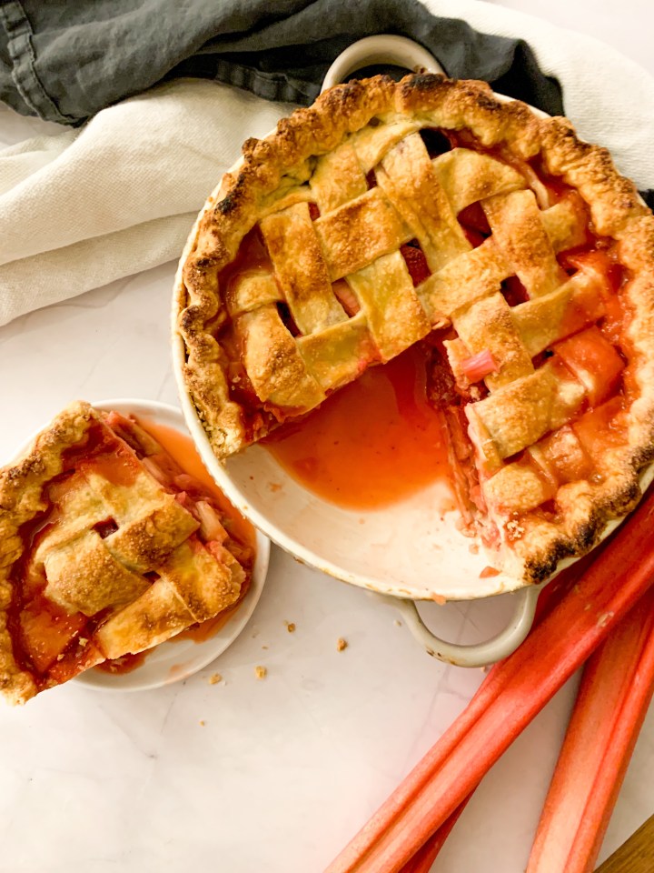 I couldn’t resist buying these beautiful rhubarb stalks when I was at the store this morning. They had such a beautiful smell to them I knew I was going to bake something with them today. I came home and found some strawberries and tossed them in there too for some added sweetness. And oh my was it delicious. You can also use frozen berries and rhubarb if you can’t find fresh, just omit the water.
